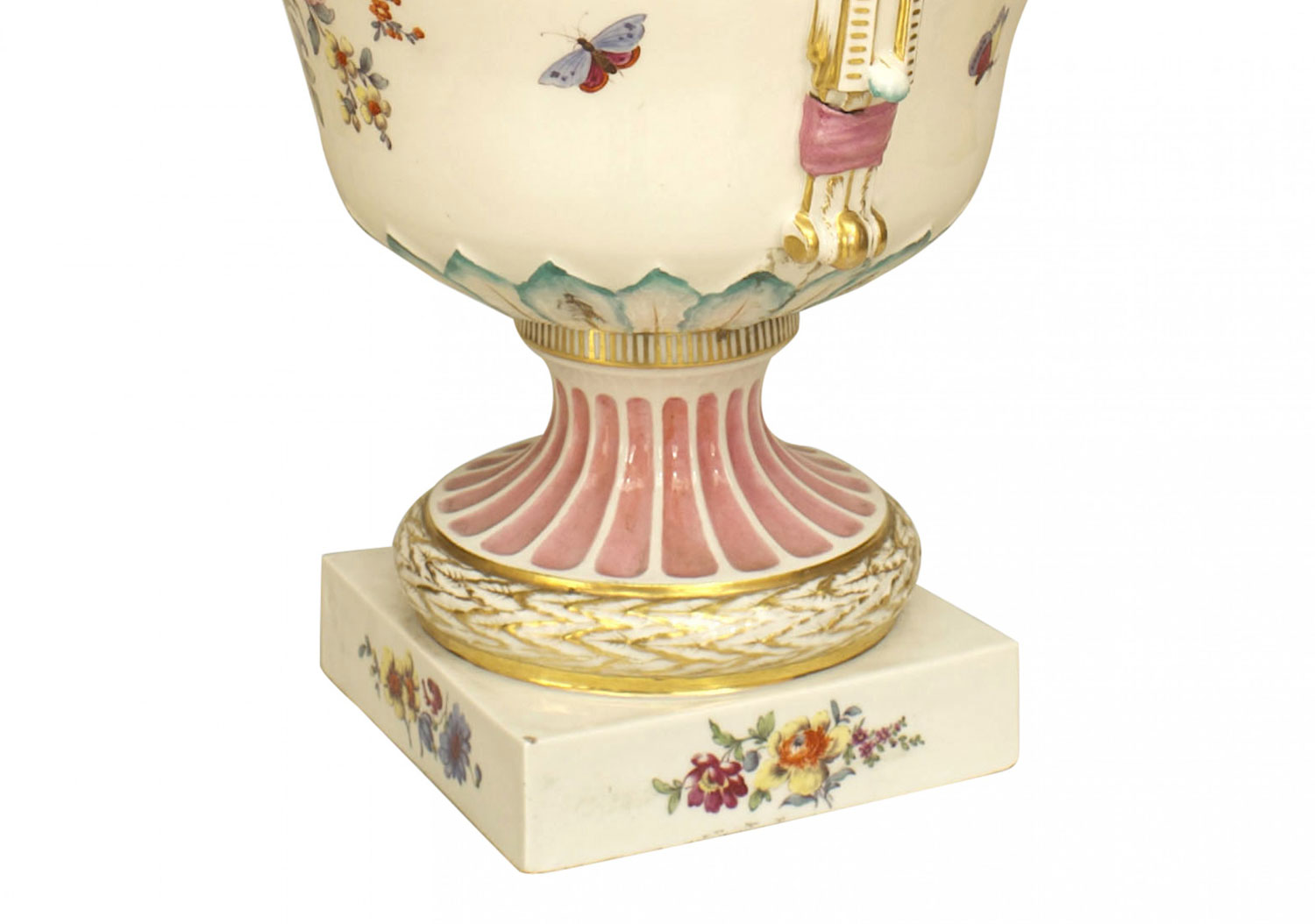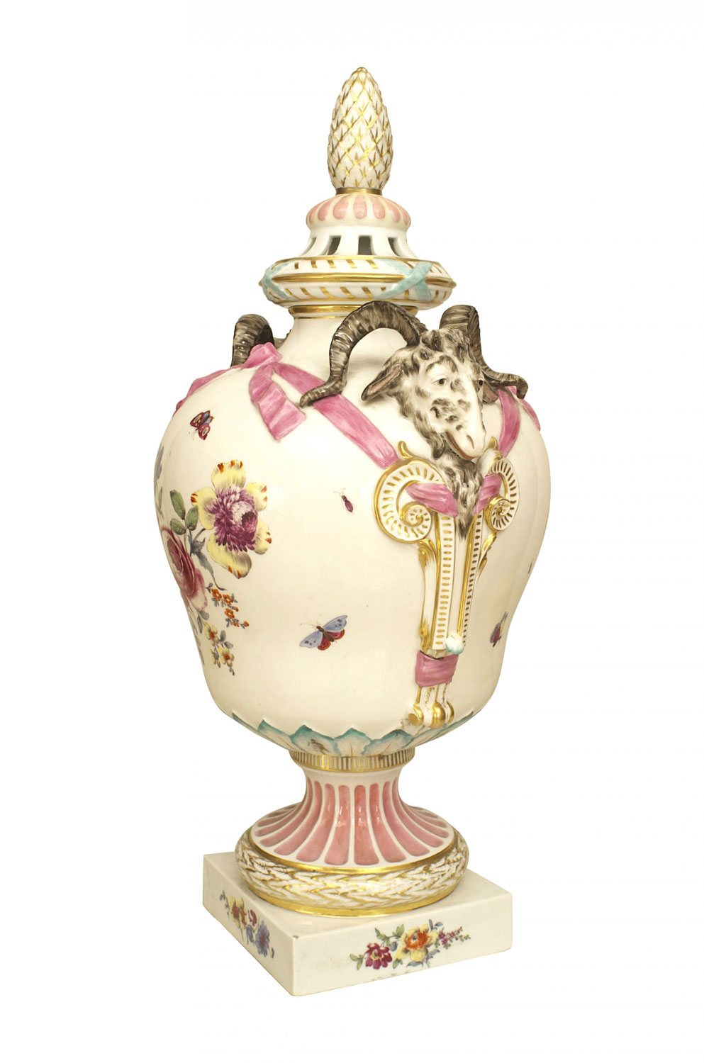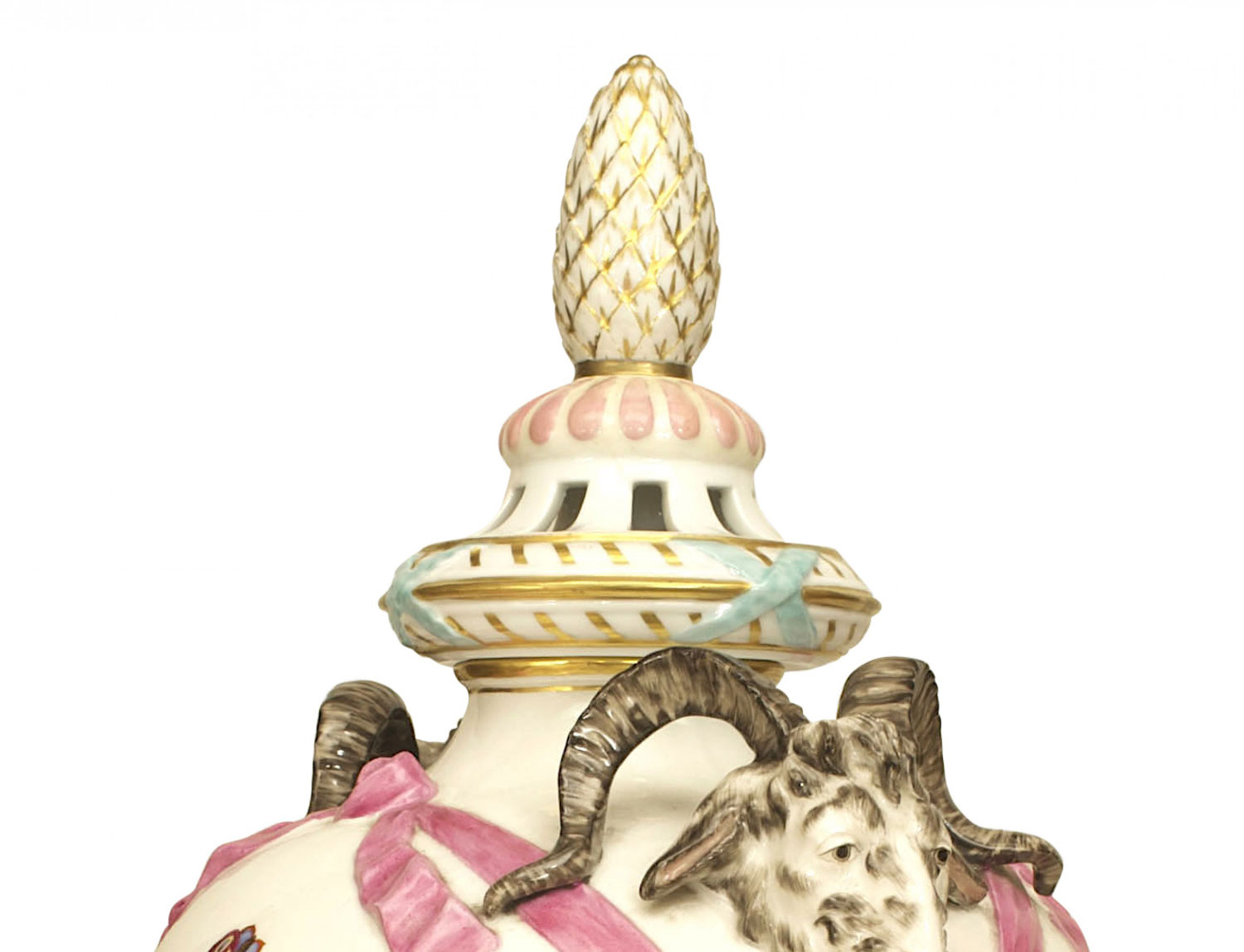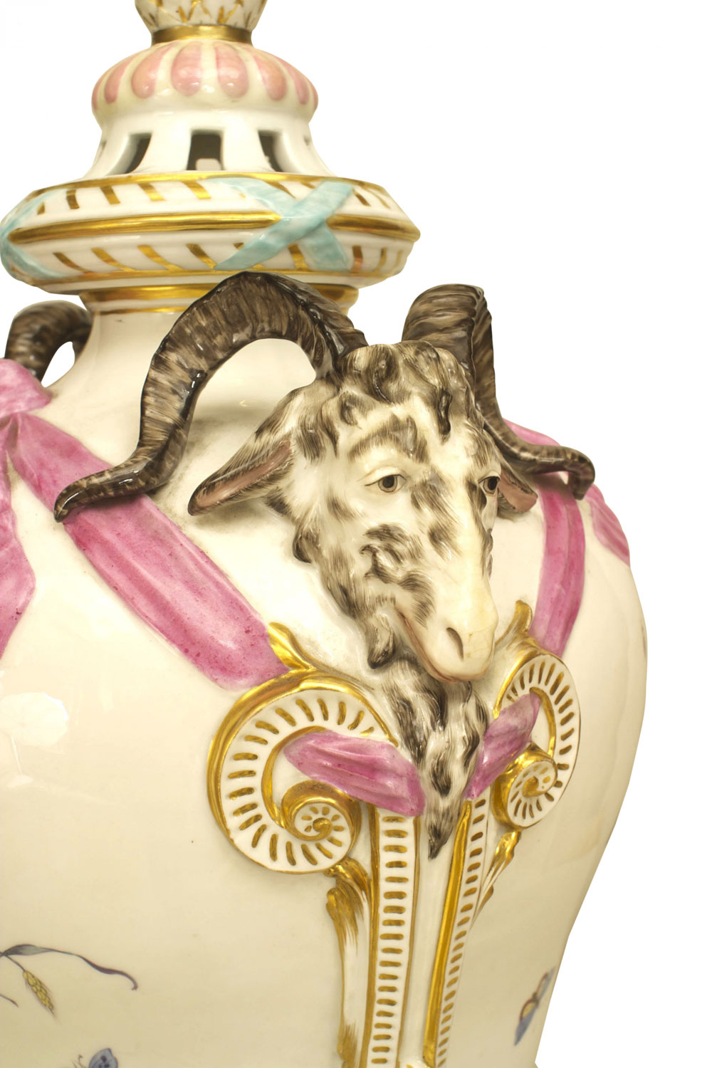 Continental German (Berlin, late 18th Cent) porcelain pink and white decorated urn with a finial top cover and ram head sides, signed on bottom.