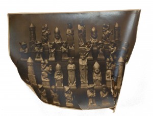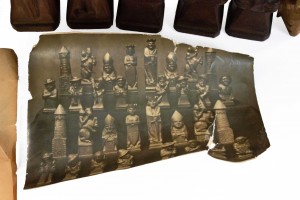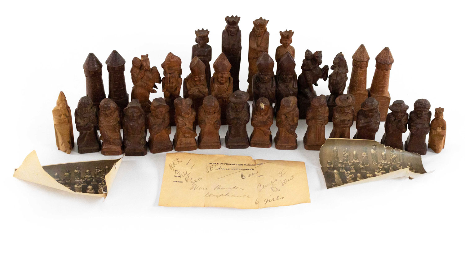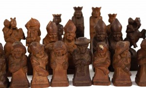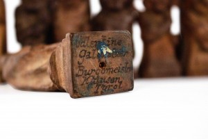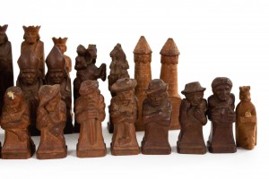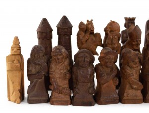 German Continental (1sts quarter 20th Century) hand-carved wooden chess set with 32 pieces. (two pawns are not original). (Marked on base: "Valentine Gallmetzer // Burgomeister Klausen Tyrol").