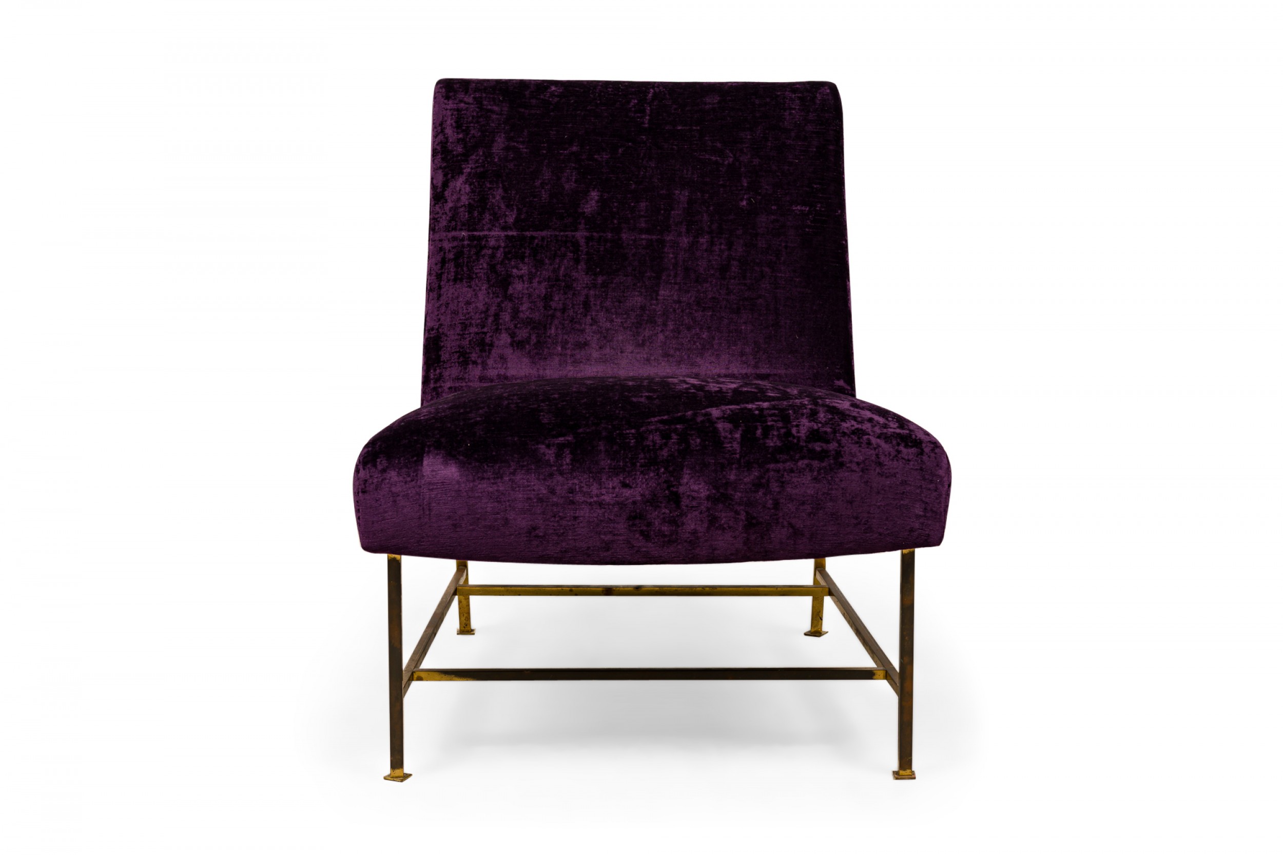 American Mid-Century slipper chair with crushed purple velour upholstery resting on four brass legs with stretchers connecting the front and back legs, ending in circular feet. (HARVEY PROBBER).