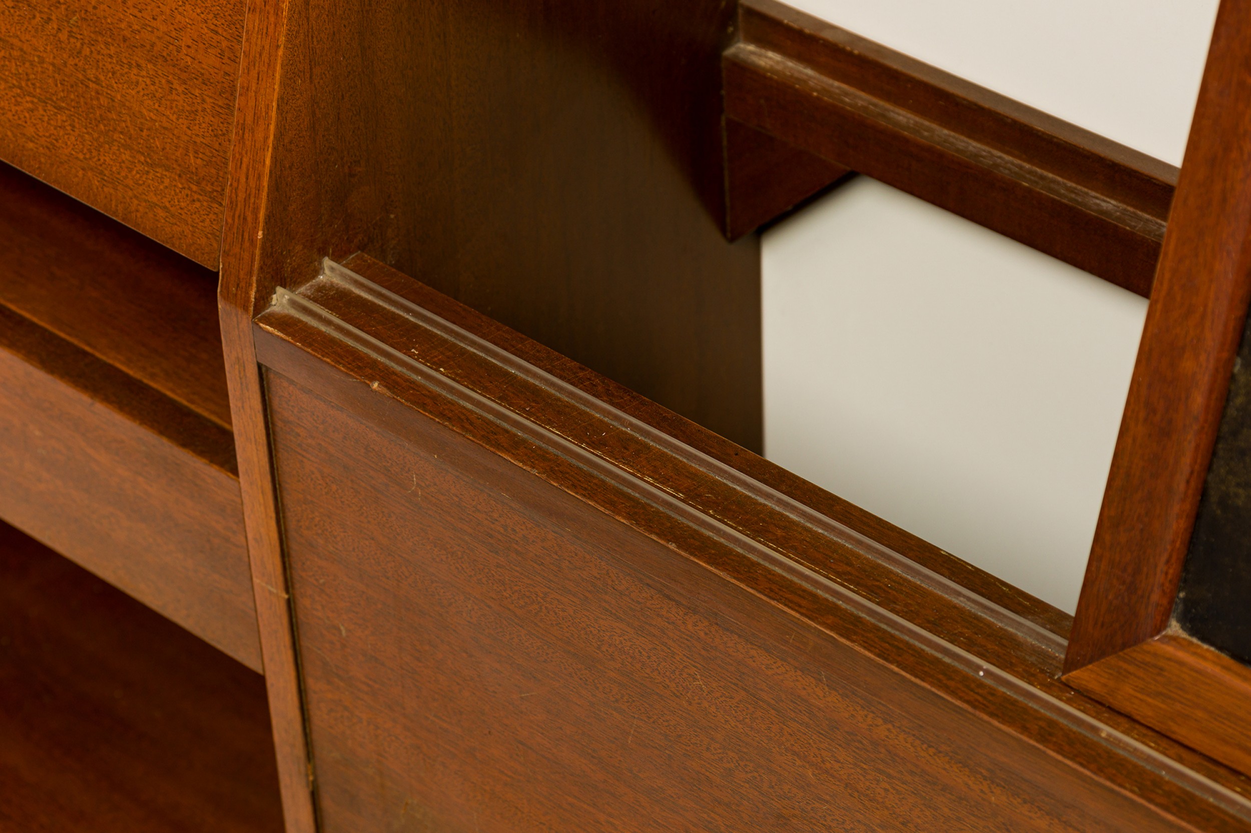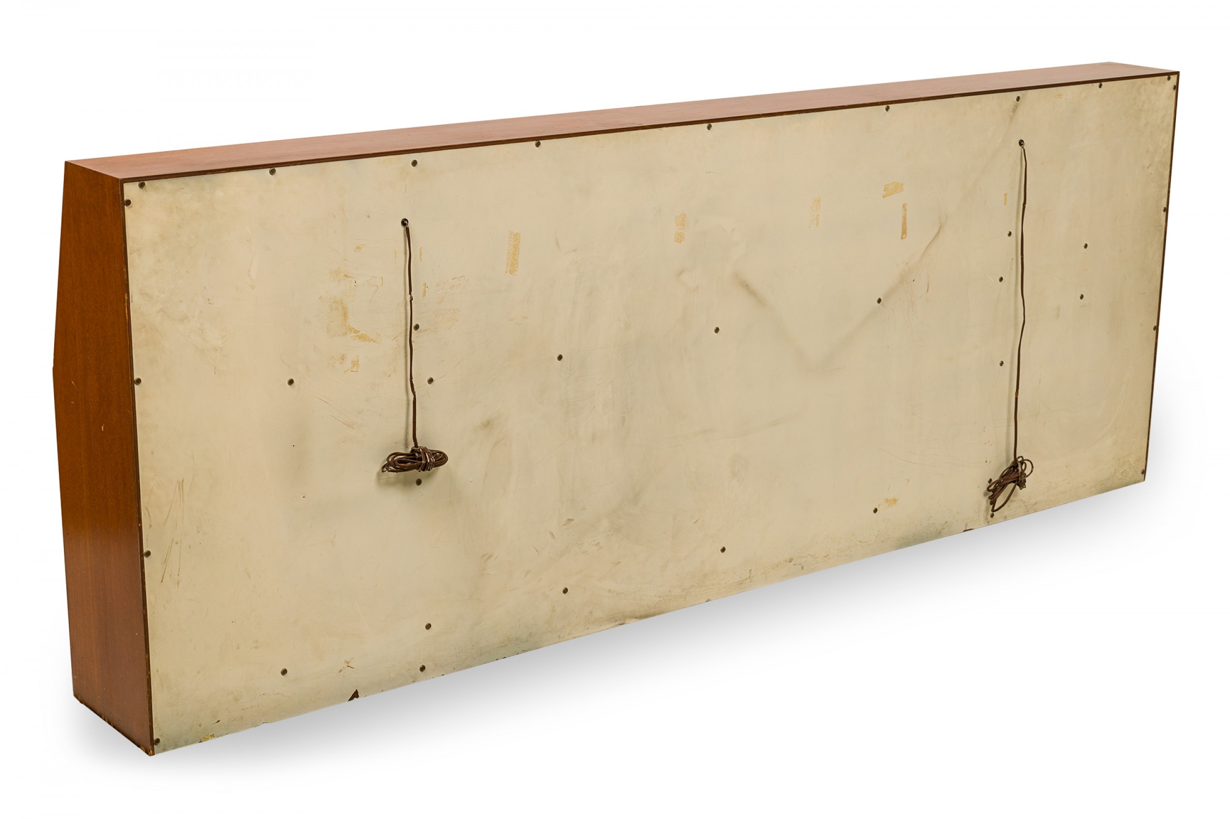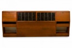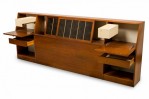 American Mid-Century queen-size storage headboard with a wooden veneer cabinet with a slanted front, two exterior sets of open shelves below two pull down cabinet compartments with lighting and a pivoting compartment, and a central sliding black mica and brass back panel concealing additional storage. (HARVEY PROBBER).