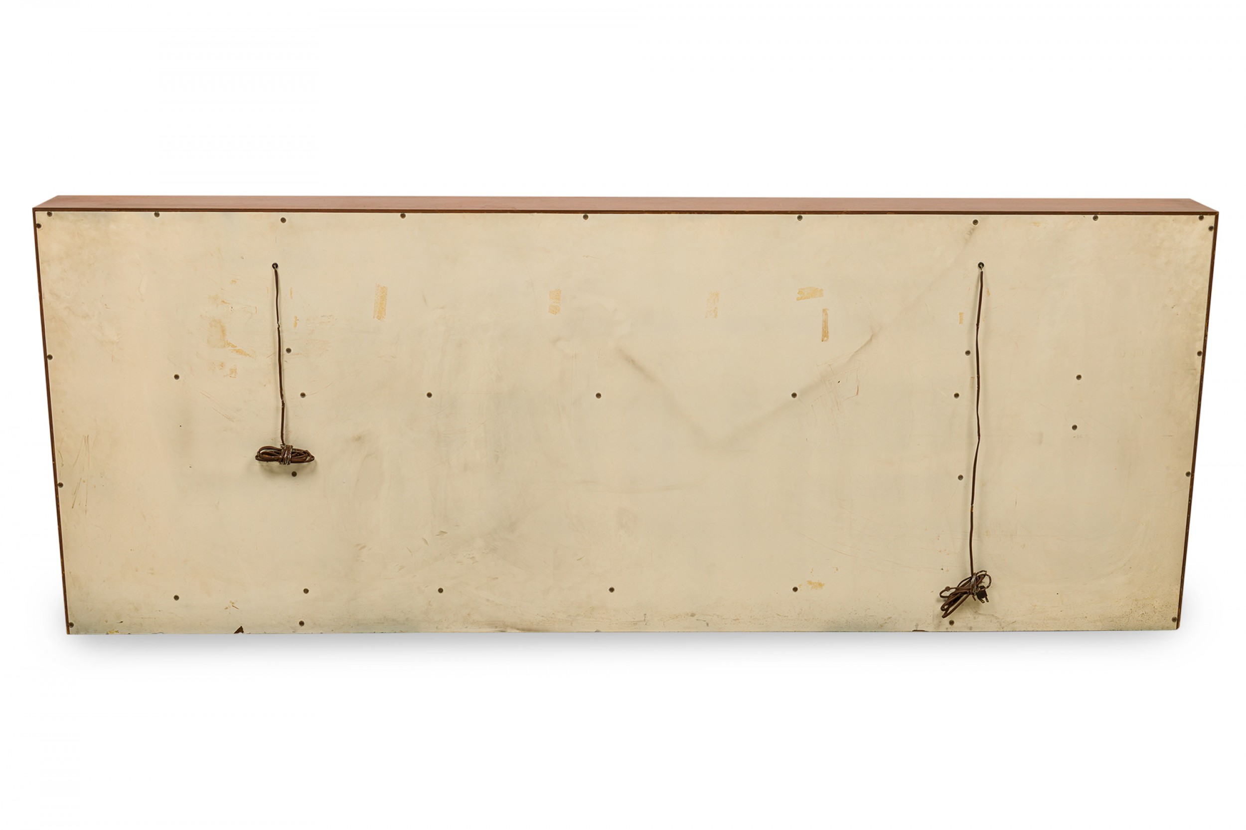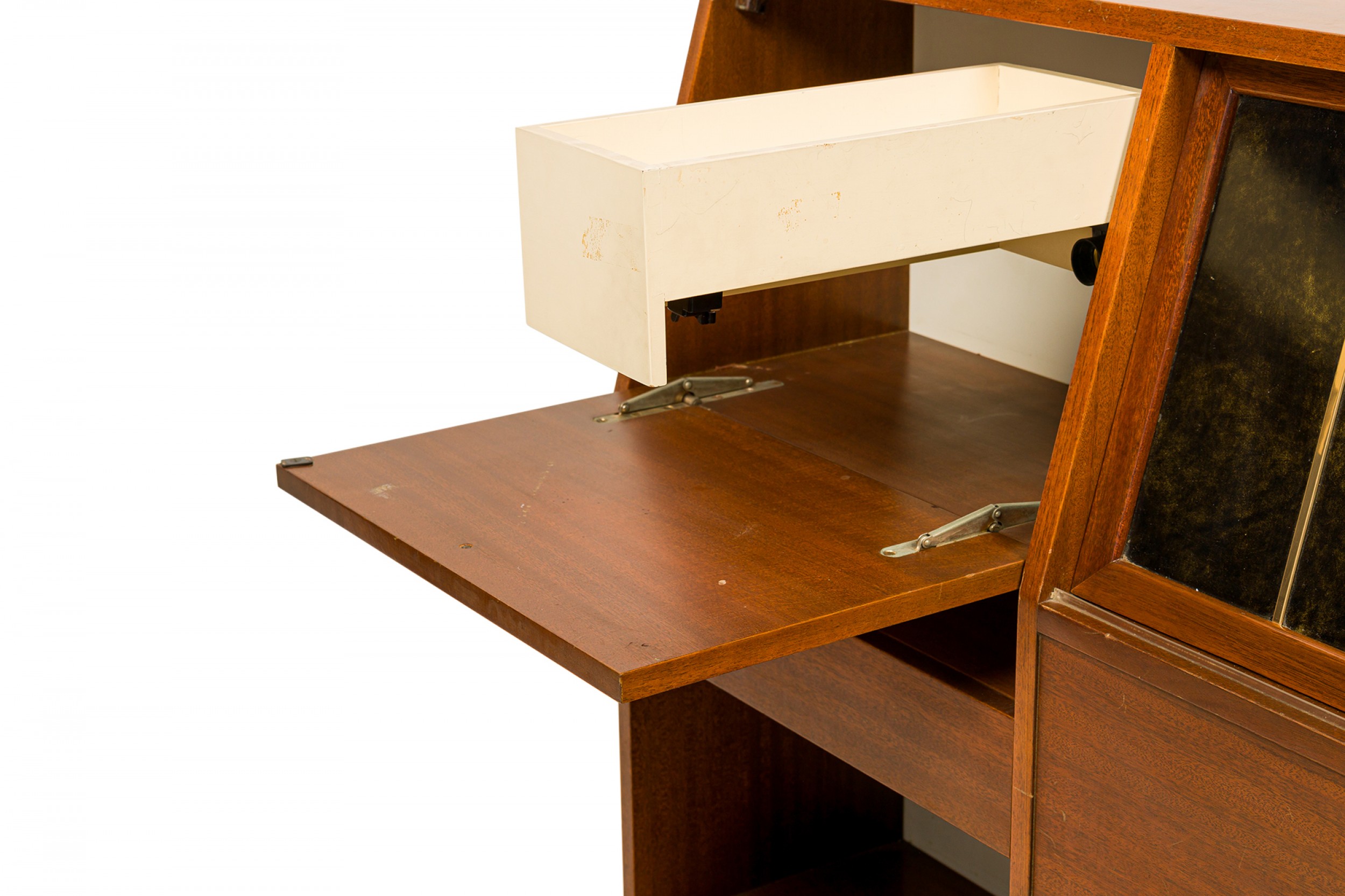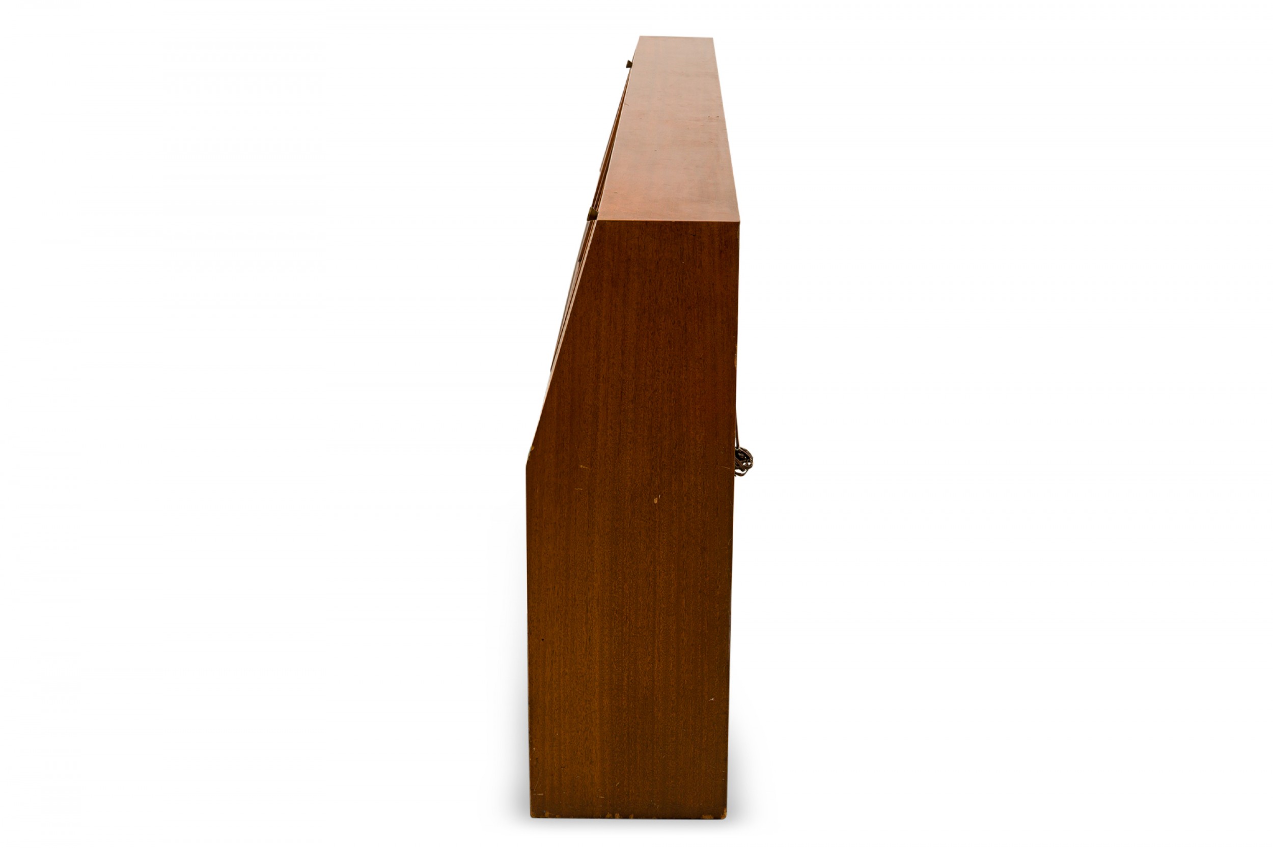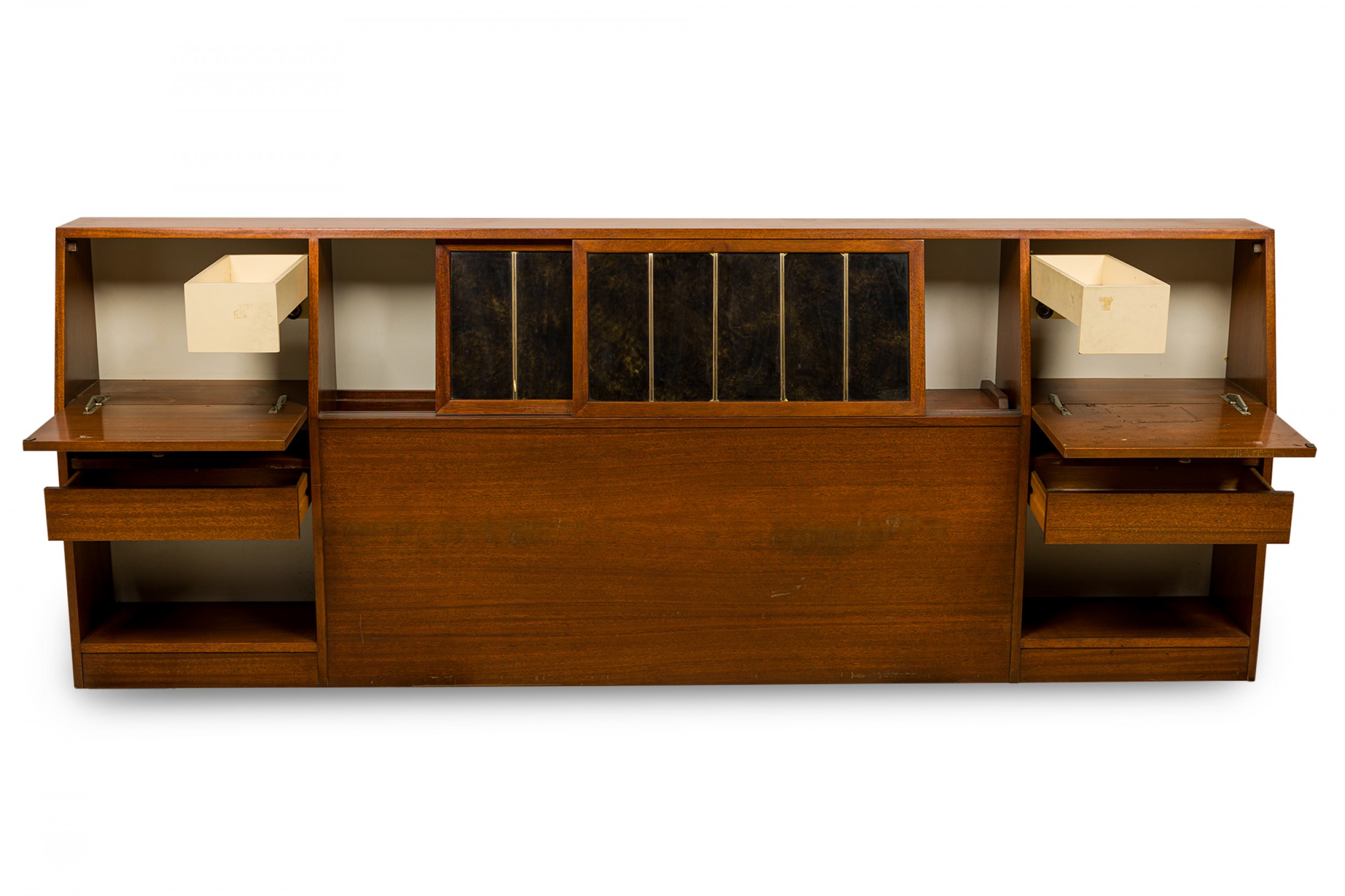American Mid-Century queen-size storage headboard with a wooden veneer cabinet with a slanted front, two exterior sets of open shelves below two pull down cabinet compartments with lighting and a pivoting compartment, and a central sliding black mica and brass back panel concealing additional storage. (HARVEY PROBBER)