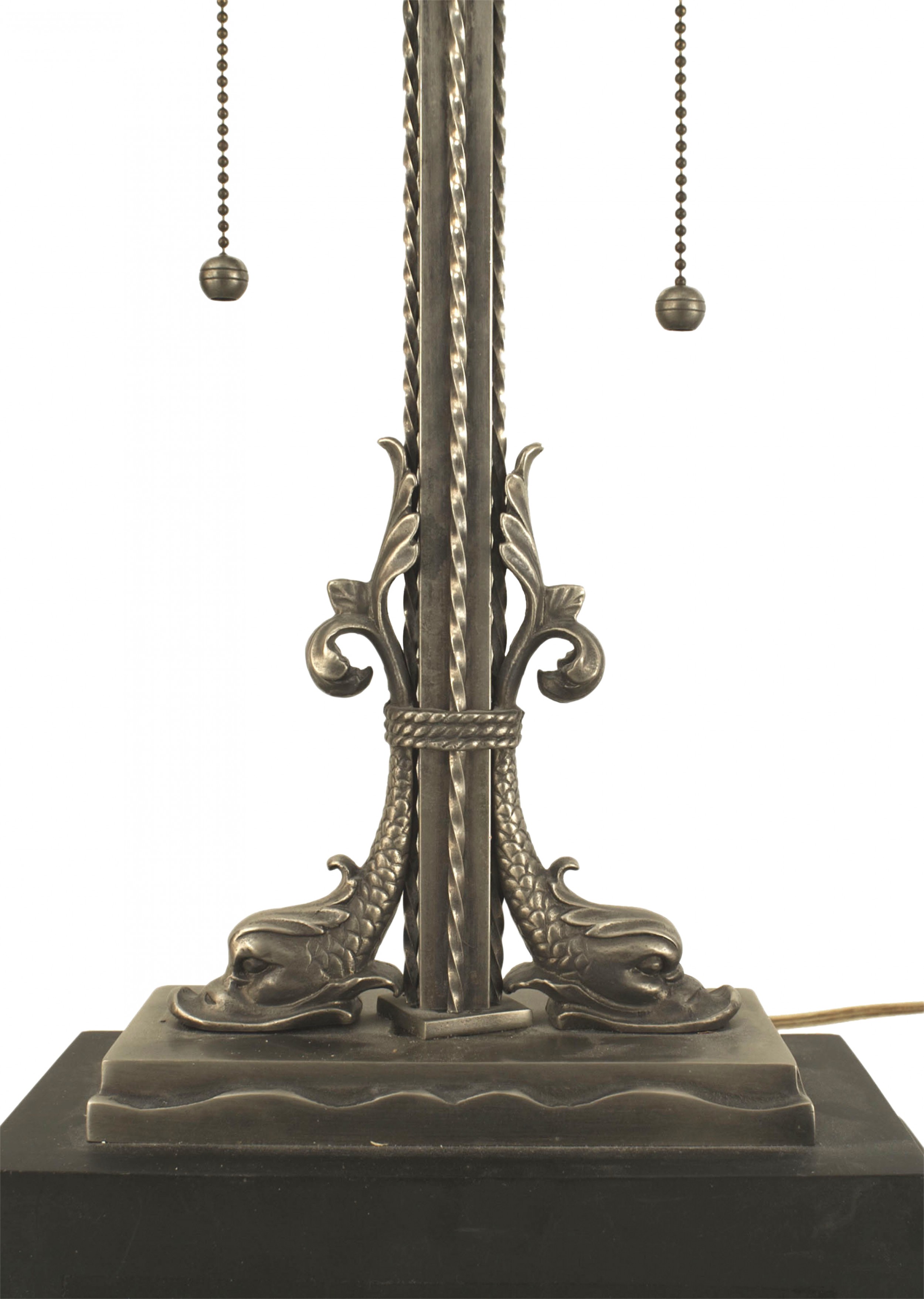 American Mid-Century Modern Hollywood Regency-style student desk lamp with metal pewter colored double dolphin base and rectangular black tole shade..