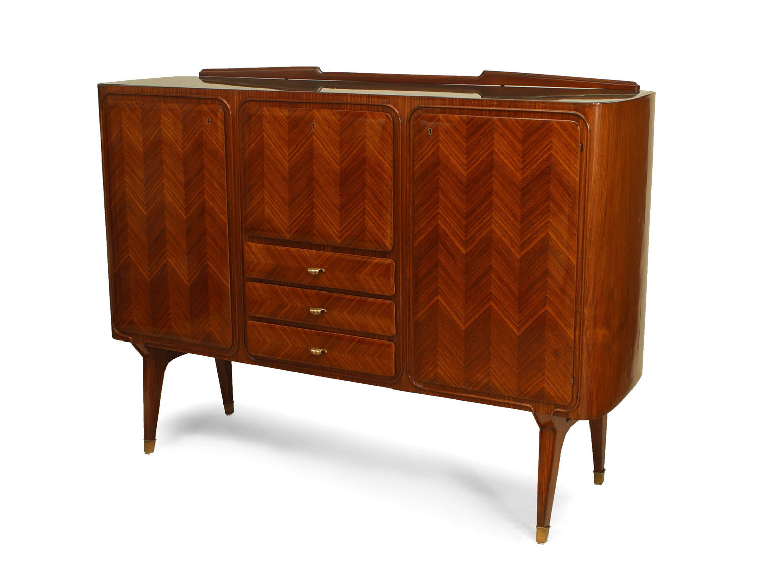 Italian Mid-Century (1950s) rosewood sideboard with herringbone design veneer with 2 side doors flanking a drop down door over 3 drawers with a low backrail and green glass top (DASSI).
