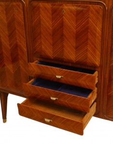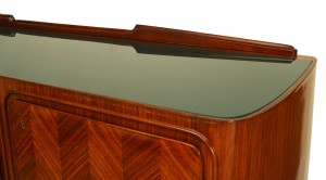 Italian Mid-Century (1950s) rosewood sideboard with herringbone design veneer with 2 side doors flanking a drop down door over 3 drawers with a low backrail and green glass top (DASSI)