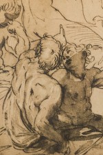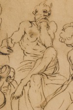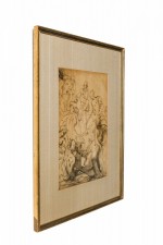 Italian Neo-Classic-style print of a realistically rendered bacchanalian crowd scene depicting a horned figure seated in a pensive position, writing notations at the upper center. The forefront figures are shaded for emphasis. Matted and framed in a parcel gilt painted wood frame. (Similar companion prints: NWL6739A-D)