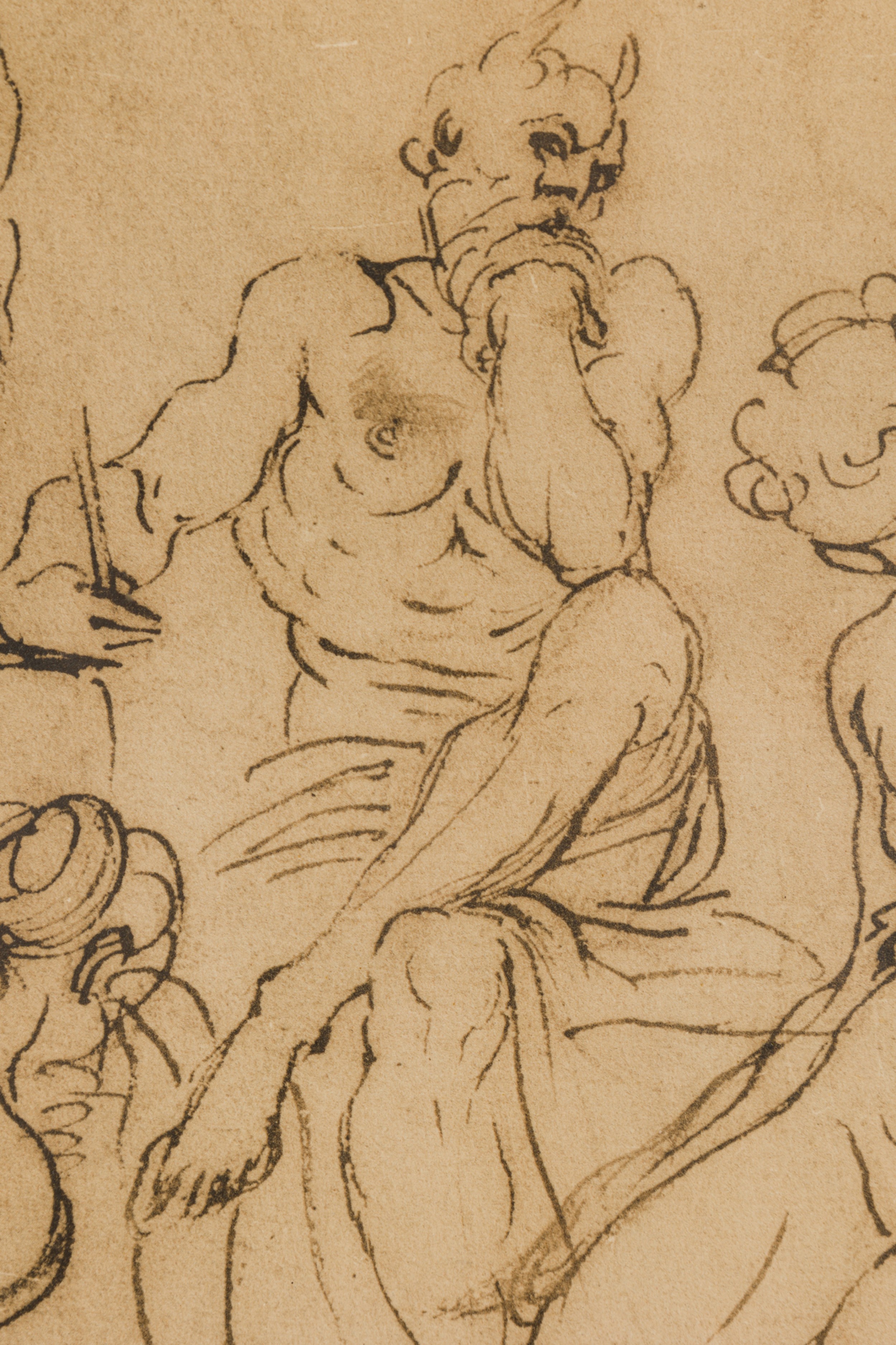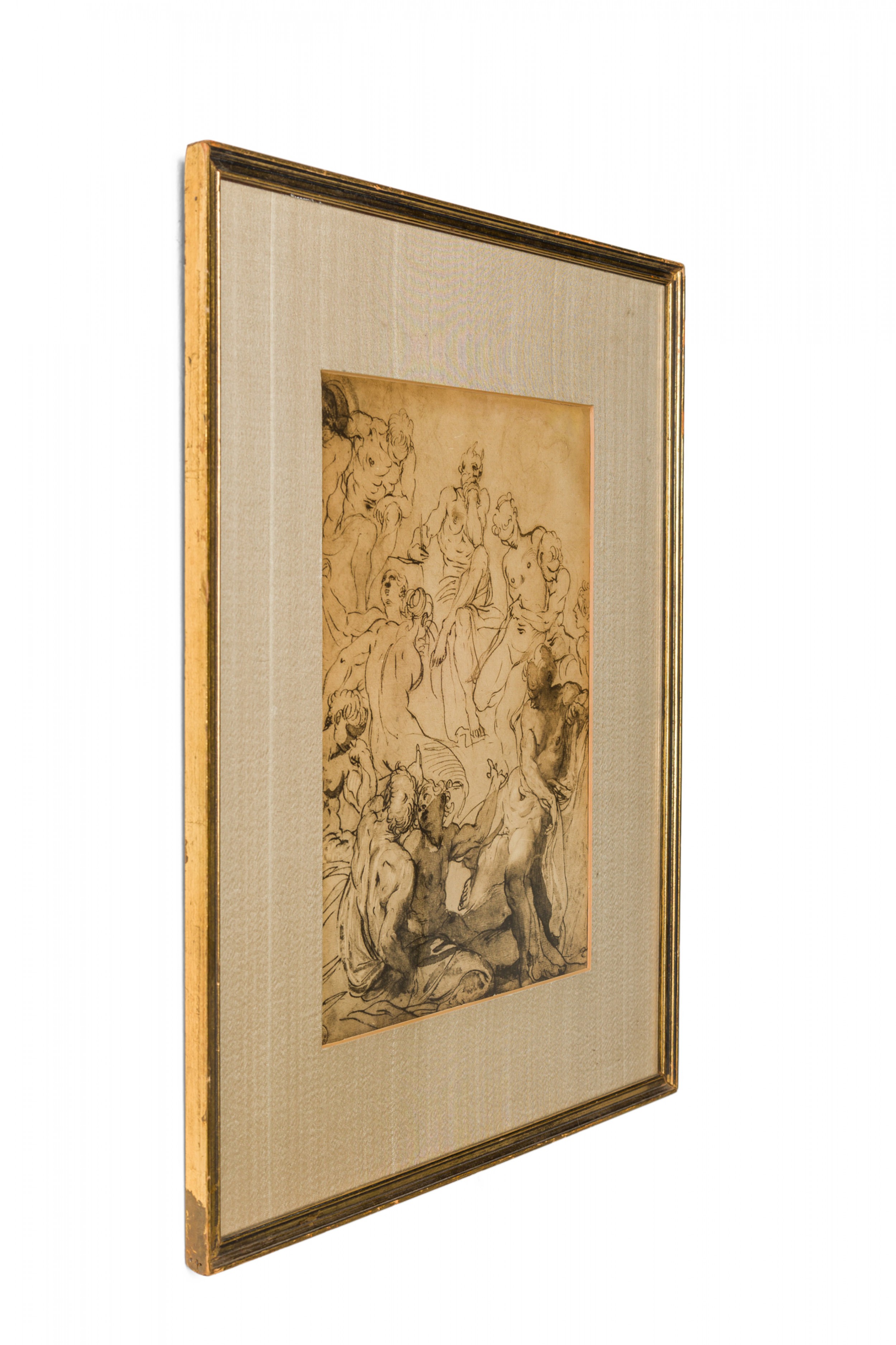 Italian Neo-Classic-style print of a realistically rendered bacchanalian crowd scene depicting a horned figure seated in a pensive position, writing notations at the upper center. The forefront figures are shaded for emphasis. Matted and framed in a parcel gilt painted wood frame. (Similar companion prints: NWL6739A-D).