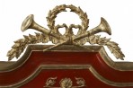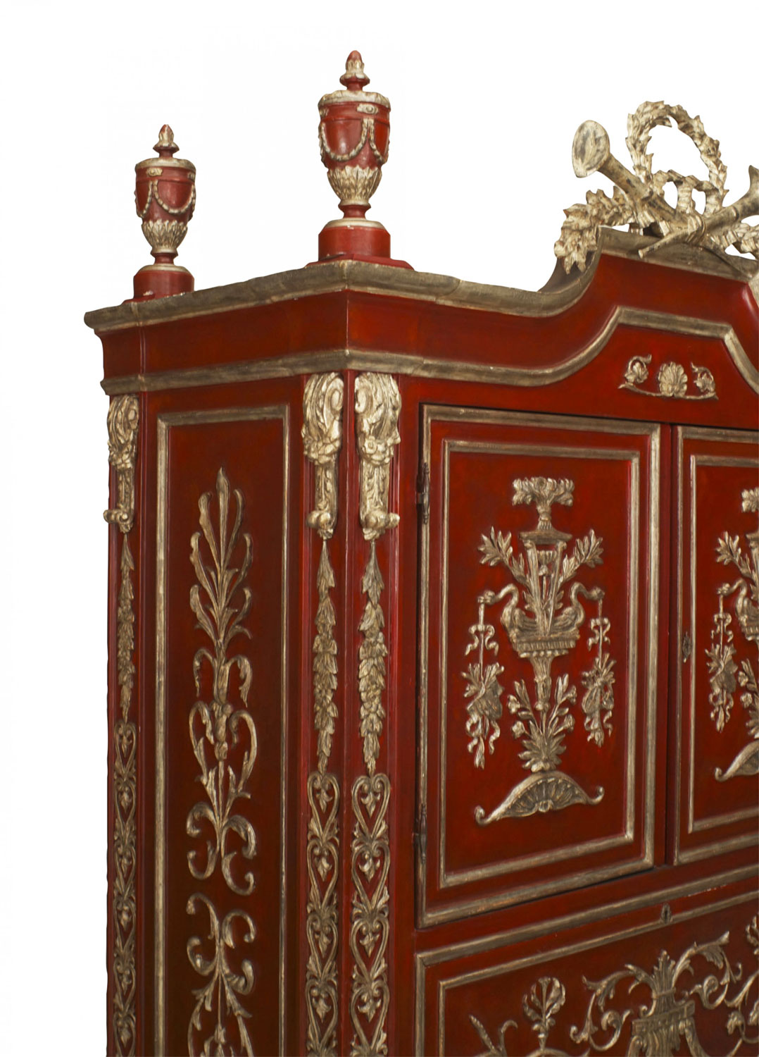 Italian Neo-classic-style (19/20th Century) scarlet painted and parcel silver gilt trimmed and carved armoire cabinet with urn finials and a center crest all resting on 4 legs.