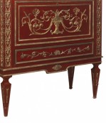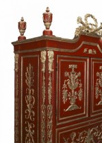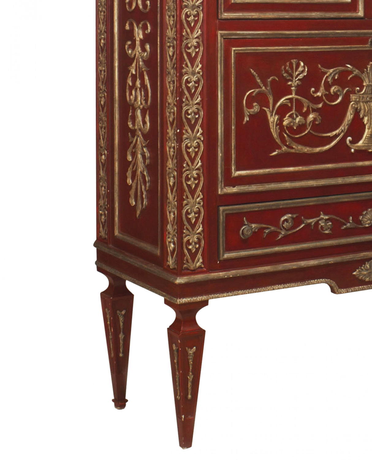 Italian Neo-classic-style (19/20th Century) scarlet painted and parcel silver gilt trimmed and carved armoire cabinet with urn finials and a center crest all resting on 4 legs..