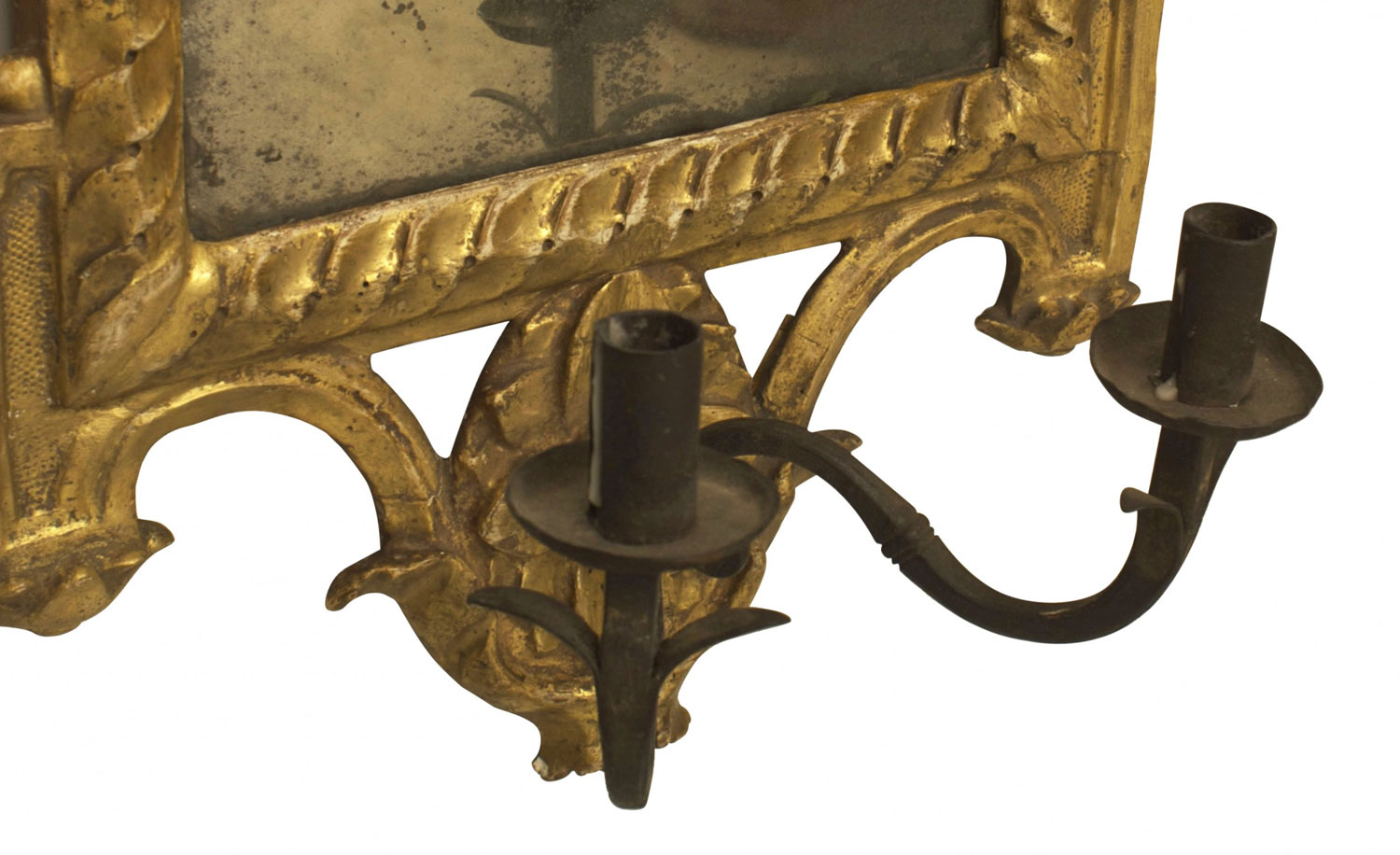 PAIR of Italian Neoclassic (18th/19th Century) giltwood wall mirrors / girandoles with two wrought iron arms with lights at the bottoms. (PRICED AS PAIR)