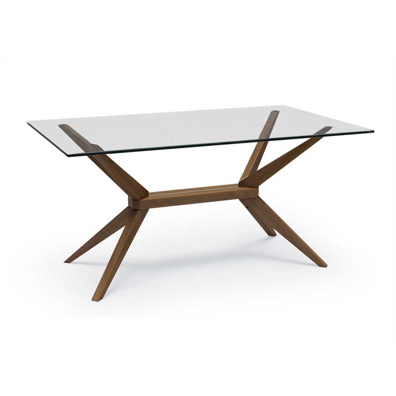 Mid-Century modern style "Magna" dining table with a walnut open design base with a stretcher supporting a rectangular glass top
