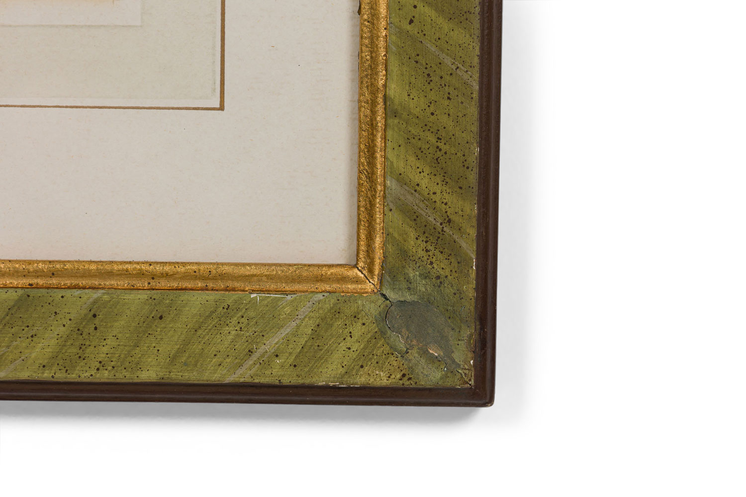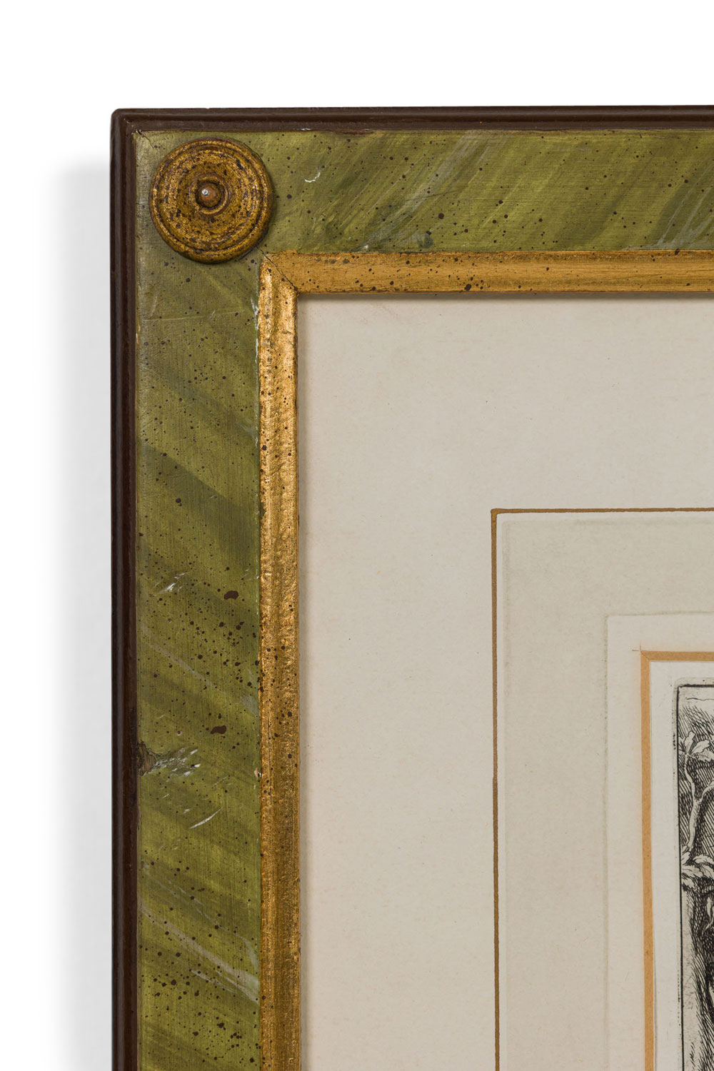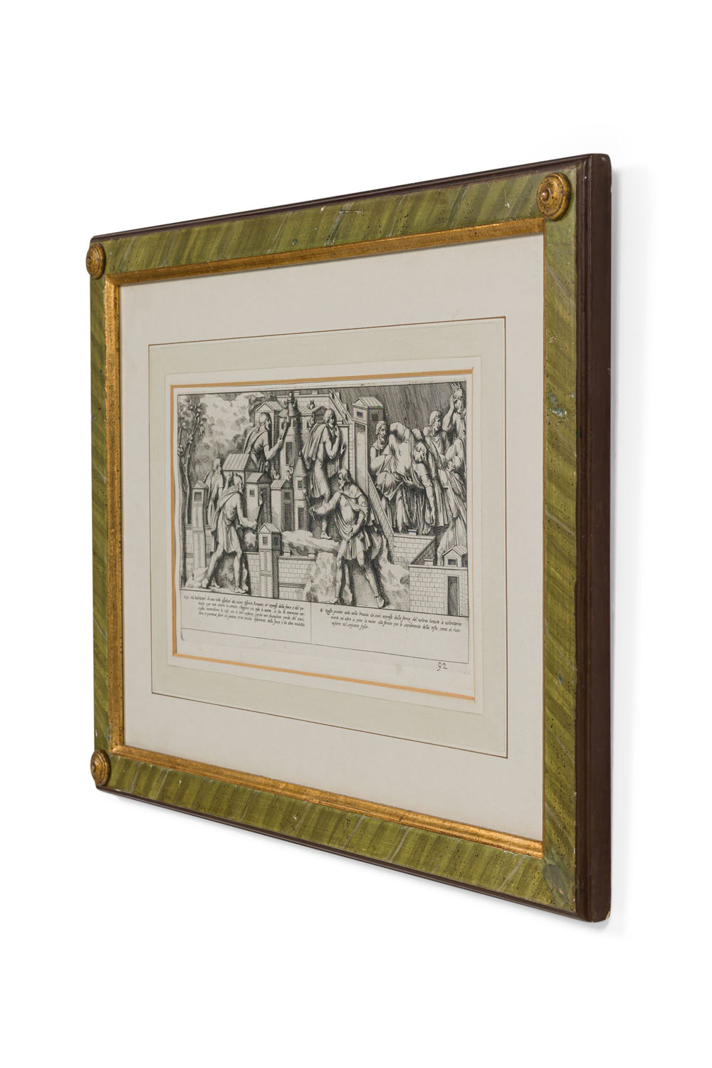 Italian Neo-classic style prints of various ancient Roman historical scenes matted in a green painted and gold trim frame (part of a set of 15; associated pieces: 040102A-O).