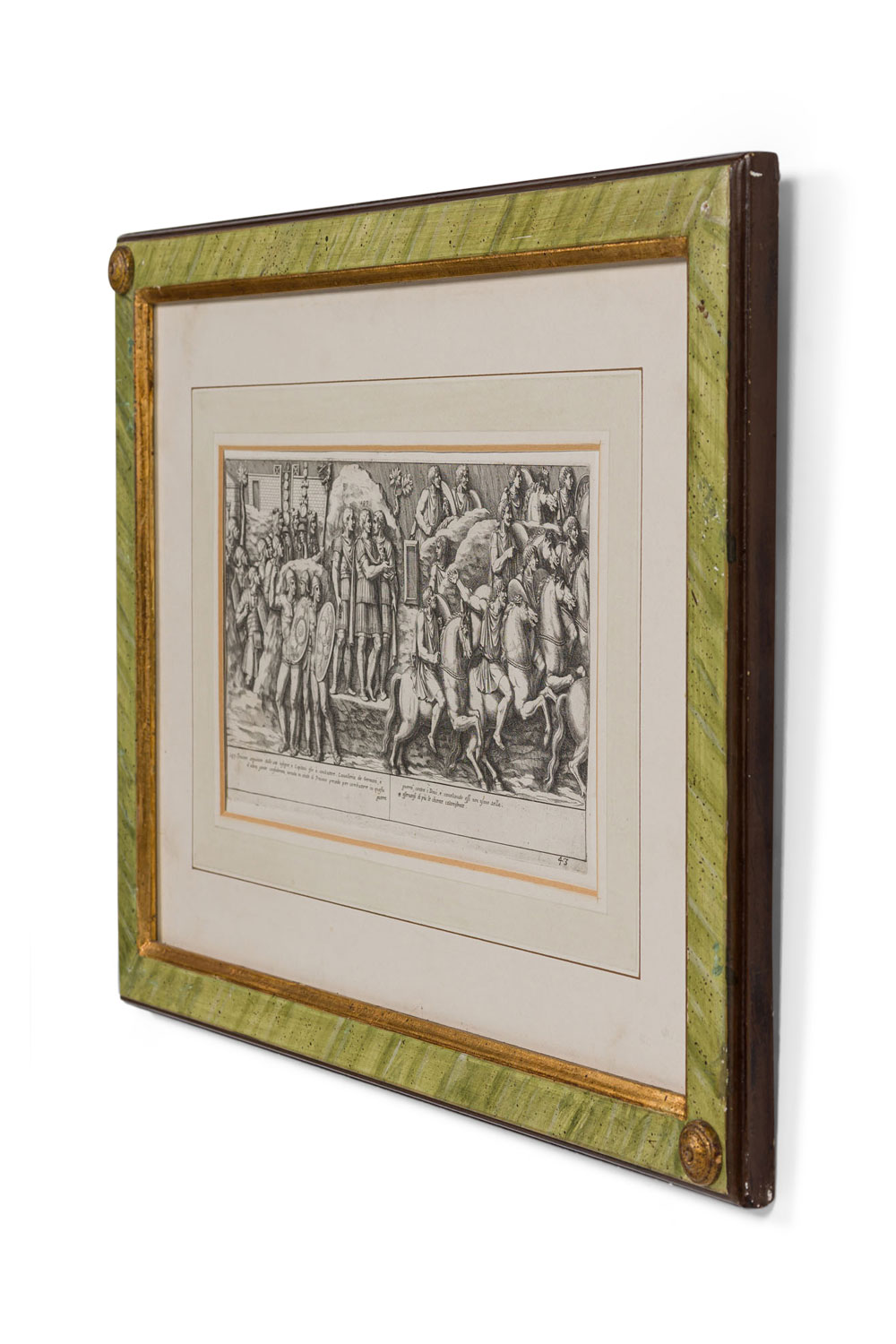 Italian Neo-classic style prints of various ancient Roman historical scenes matted in a green painted and gold trim frame (part of a set of 15; associated pieces: 040102A-O)