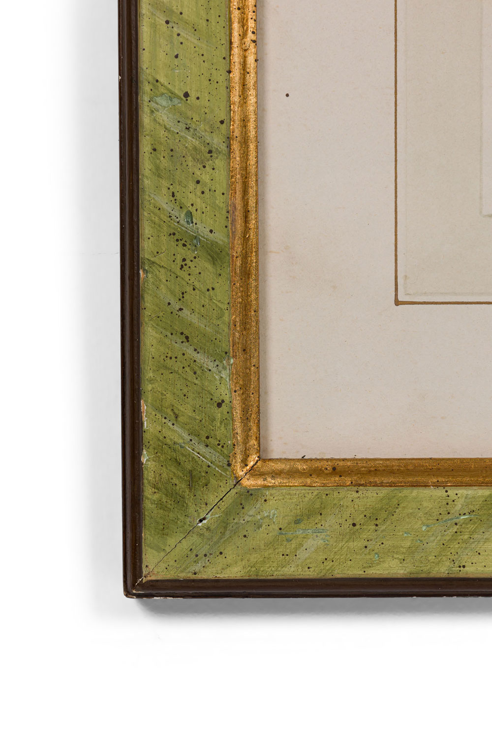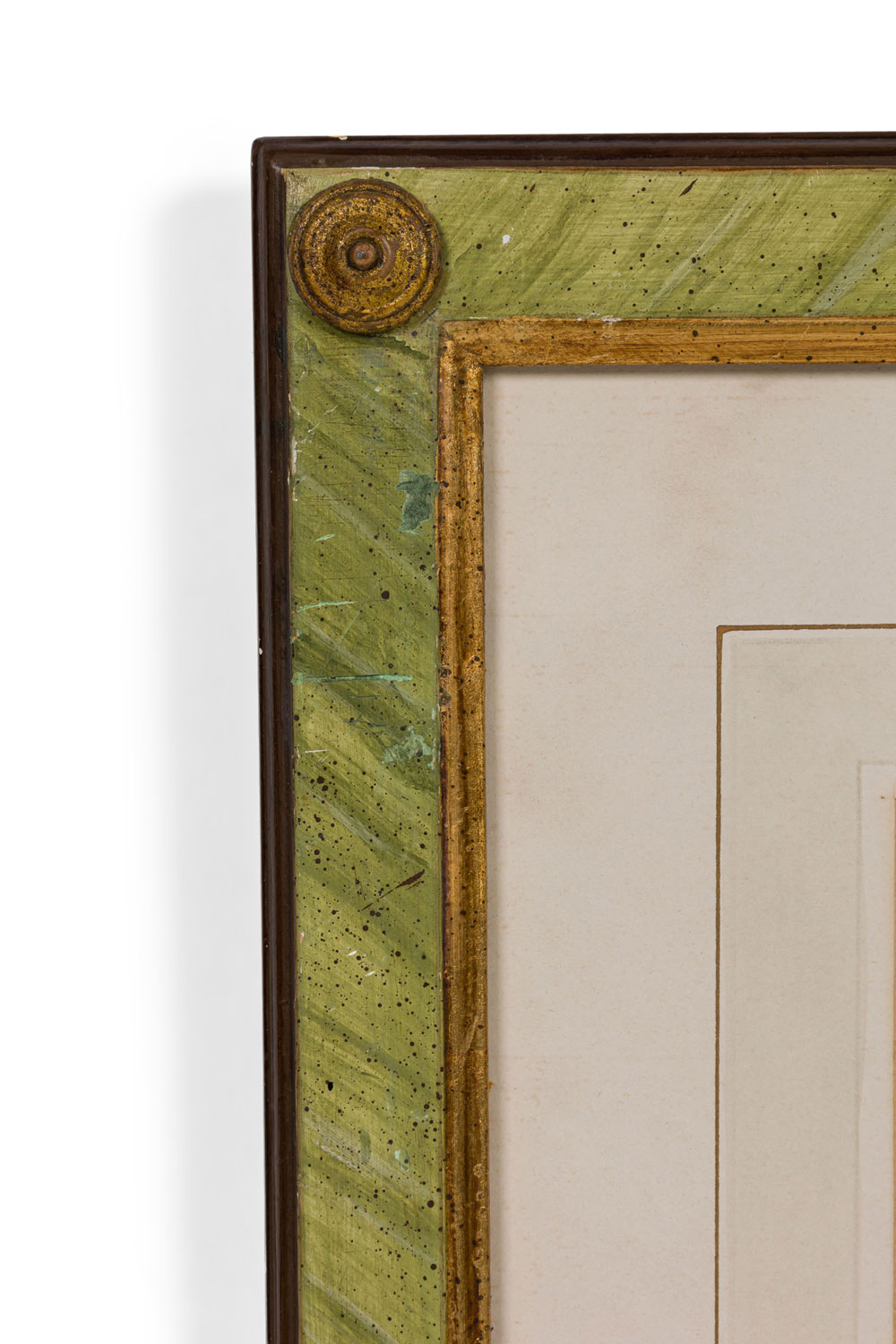 Italian Neo-classic style prints of various ancient Roman historical scenes matted in a green painted and gold trim frame (part of a set of 15; associated pieces: 040102A-O).