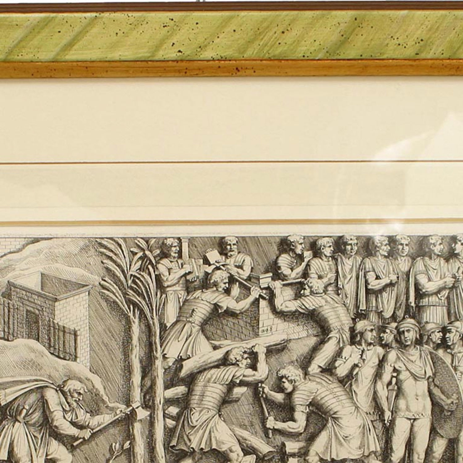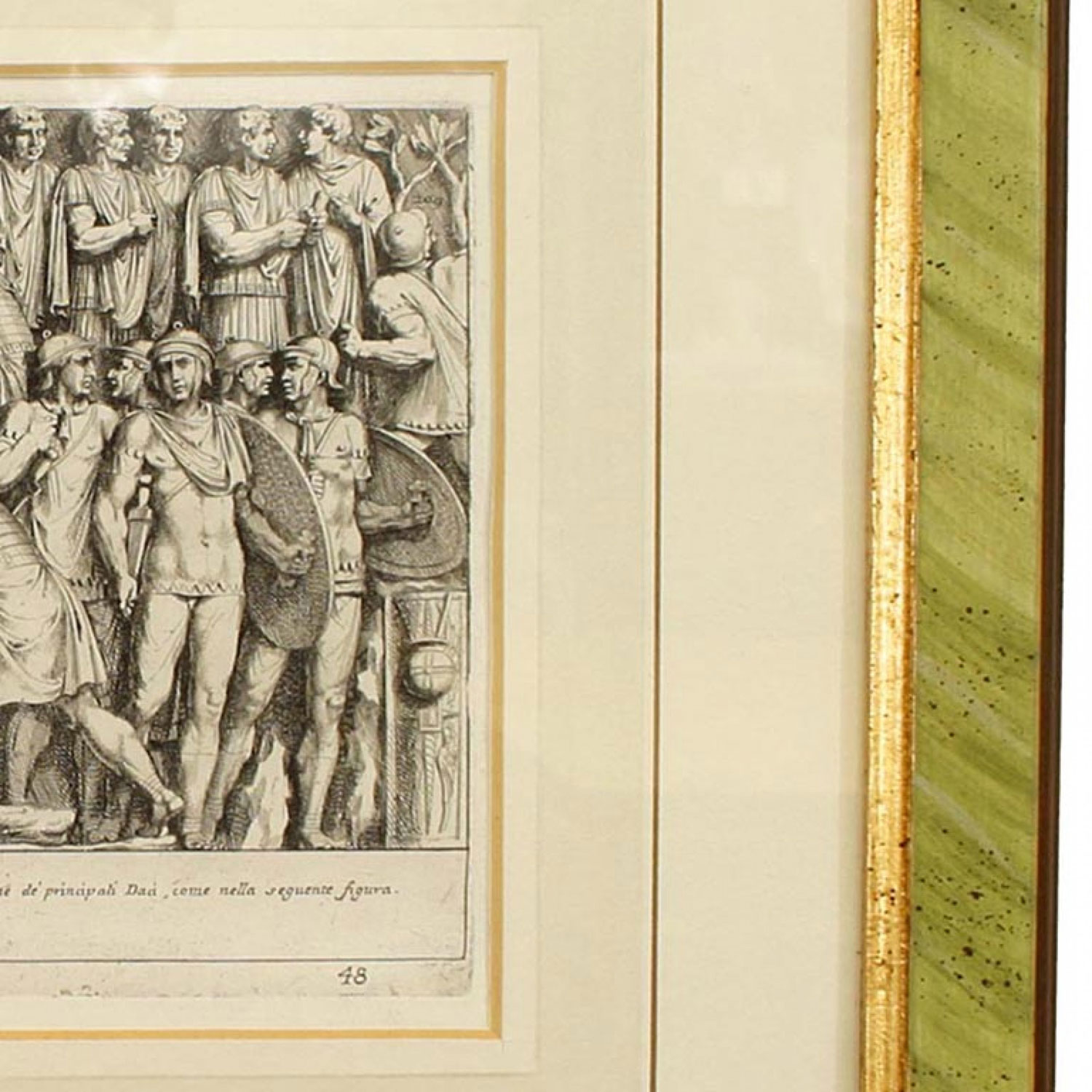 Italian Neo-classic style prints of various ancient Roman historical scenes matted in a green painted and gold trim frame (part of a set of 15; associated pieces: 040102A-O)