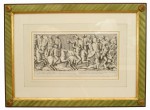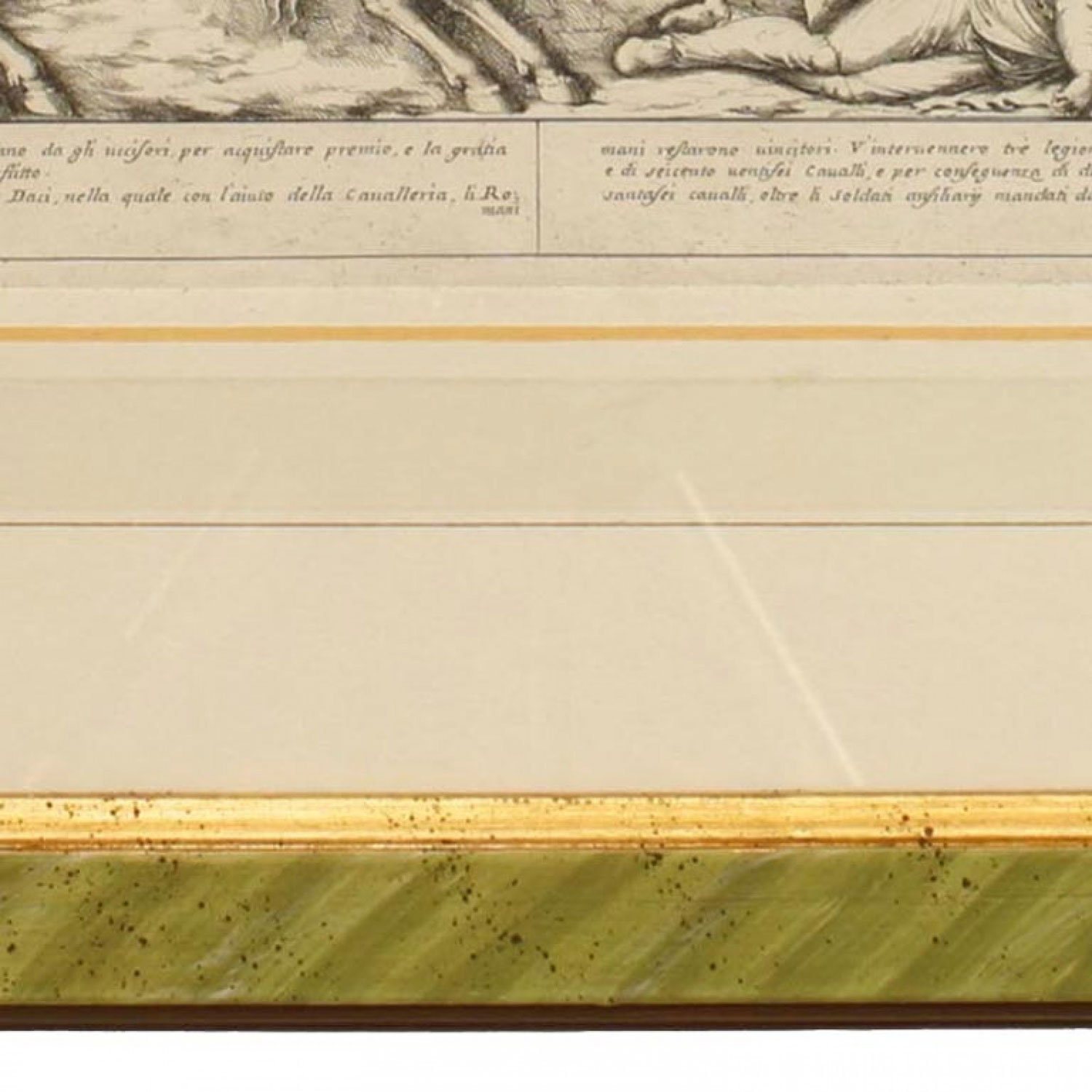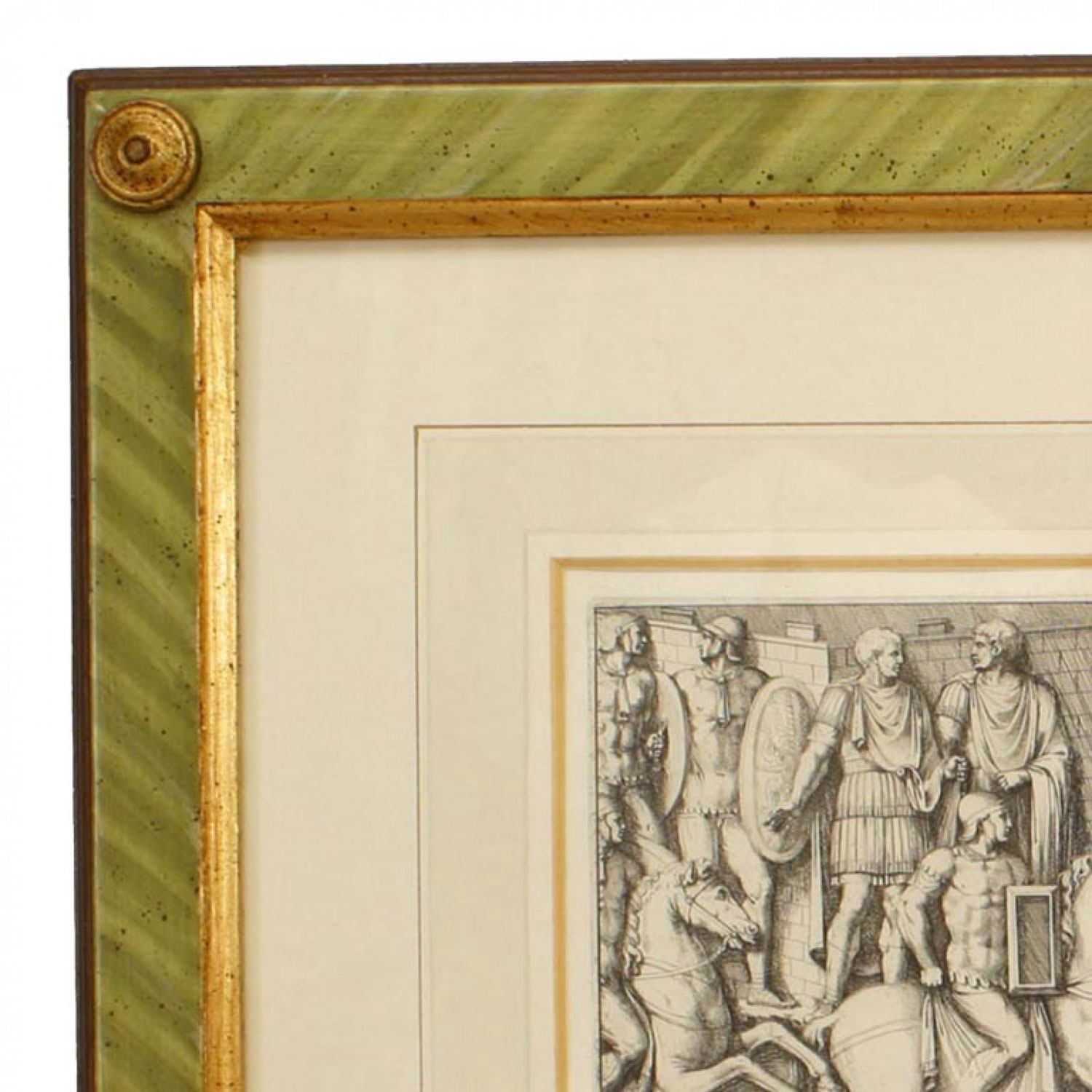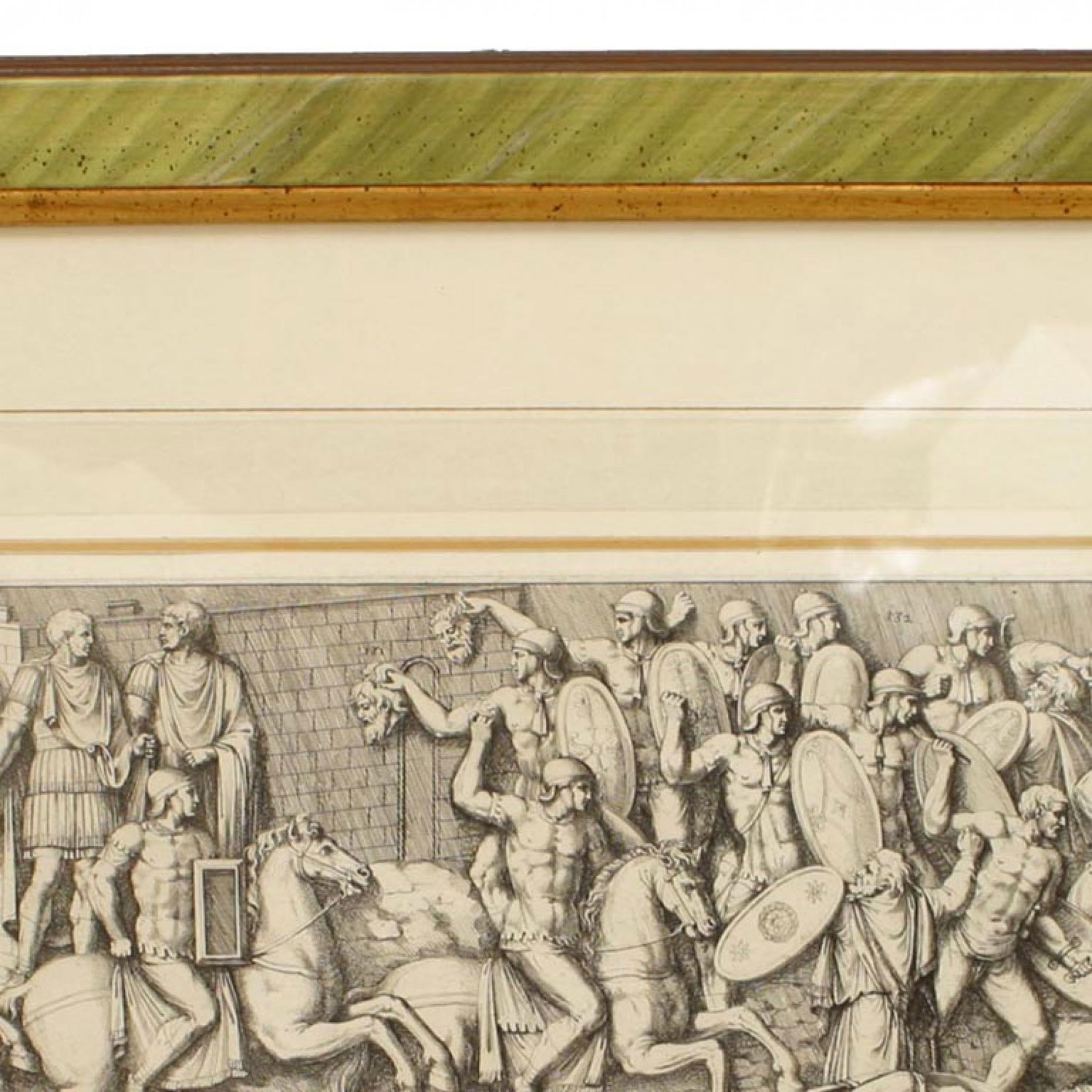 Italian Neo-classic style prints of various ancient Roman historical scenes matted in a green painted and gold trim frame (part of a set of 15; associated pieces: 040102A-O).
