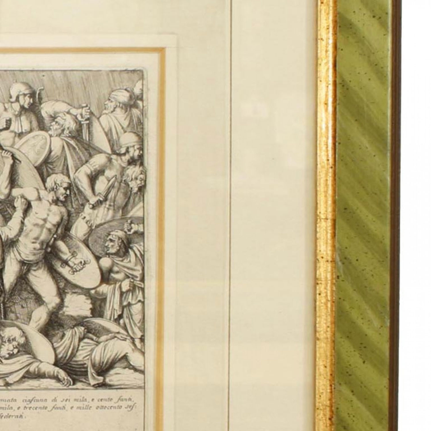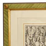 Italian Neo-classic style prints of various ancient Roman historical scenes matted in a green painted and gold trim frame (part of a set of 15; associated pieces: 040102A-O)