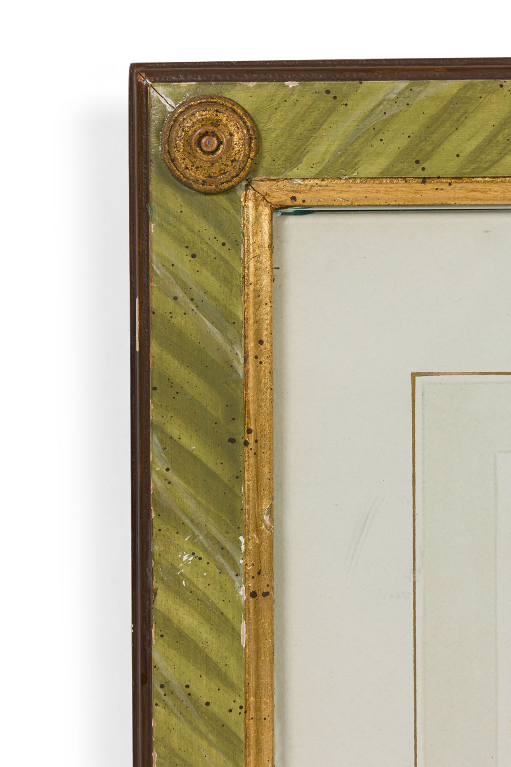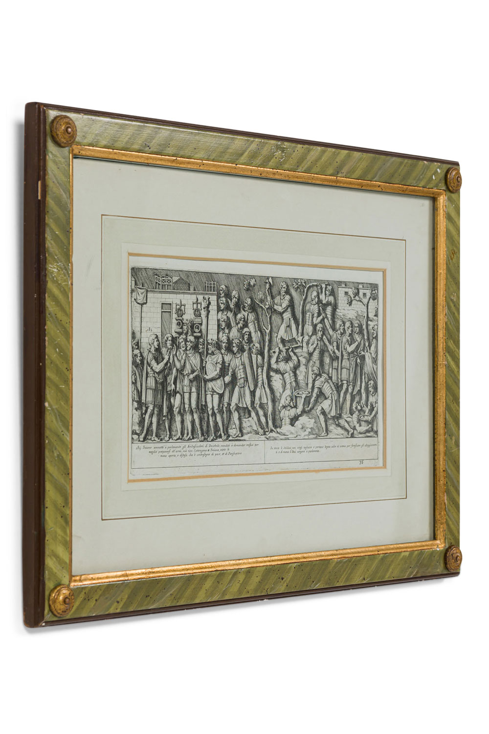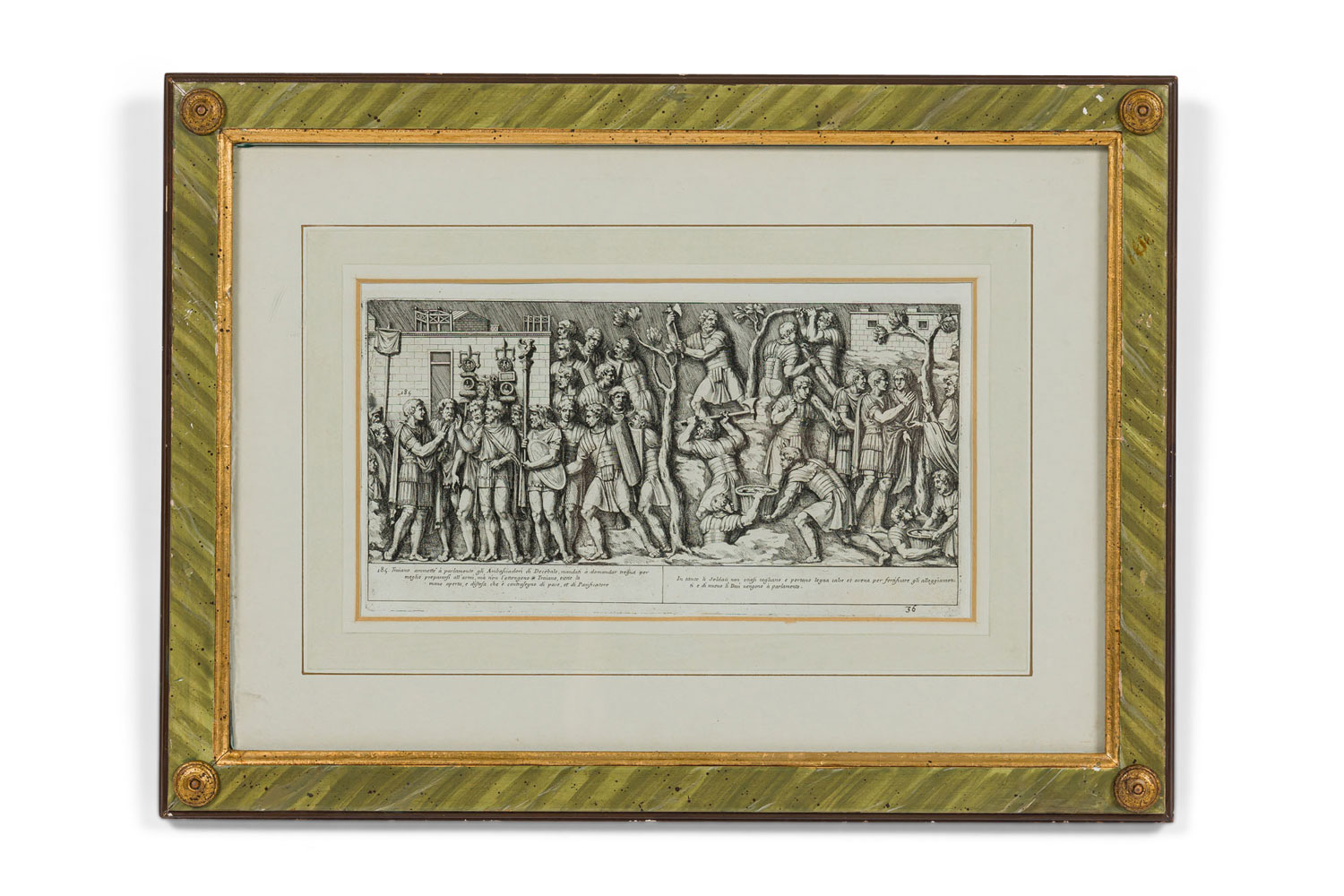 Italian Neo-classic style prints of various ancient Roman historical scenes matted in a green painted and gold trim frame (part of a set of 15; associated pieces: 040102A-O).