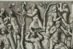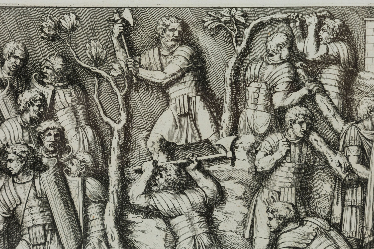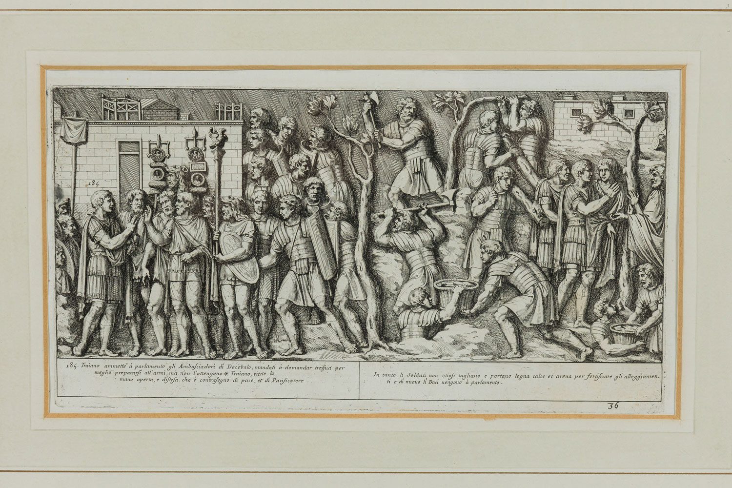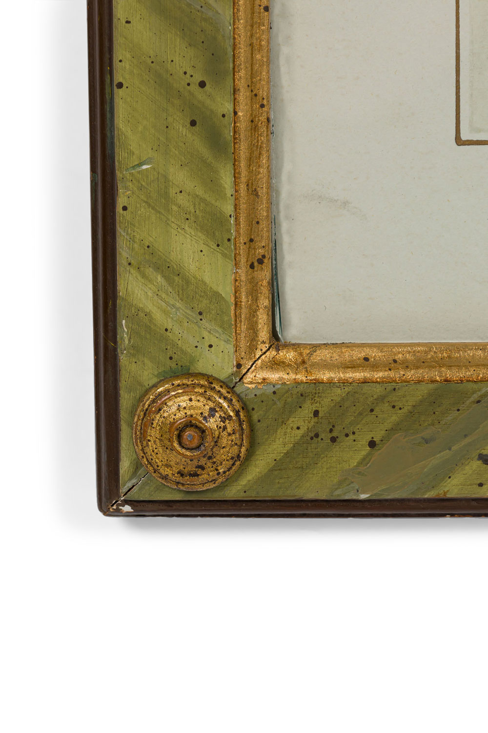 Italian Neo-classic style prints of various ancient Roman historical scenes matted in a green painted and gold trim frame (part of a set of 15; associated pieces: 040102A-O).