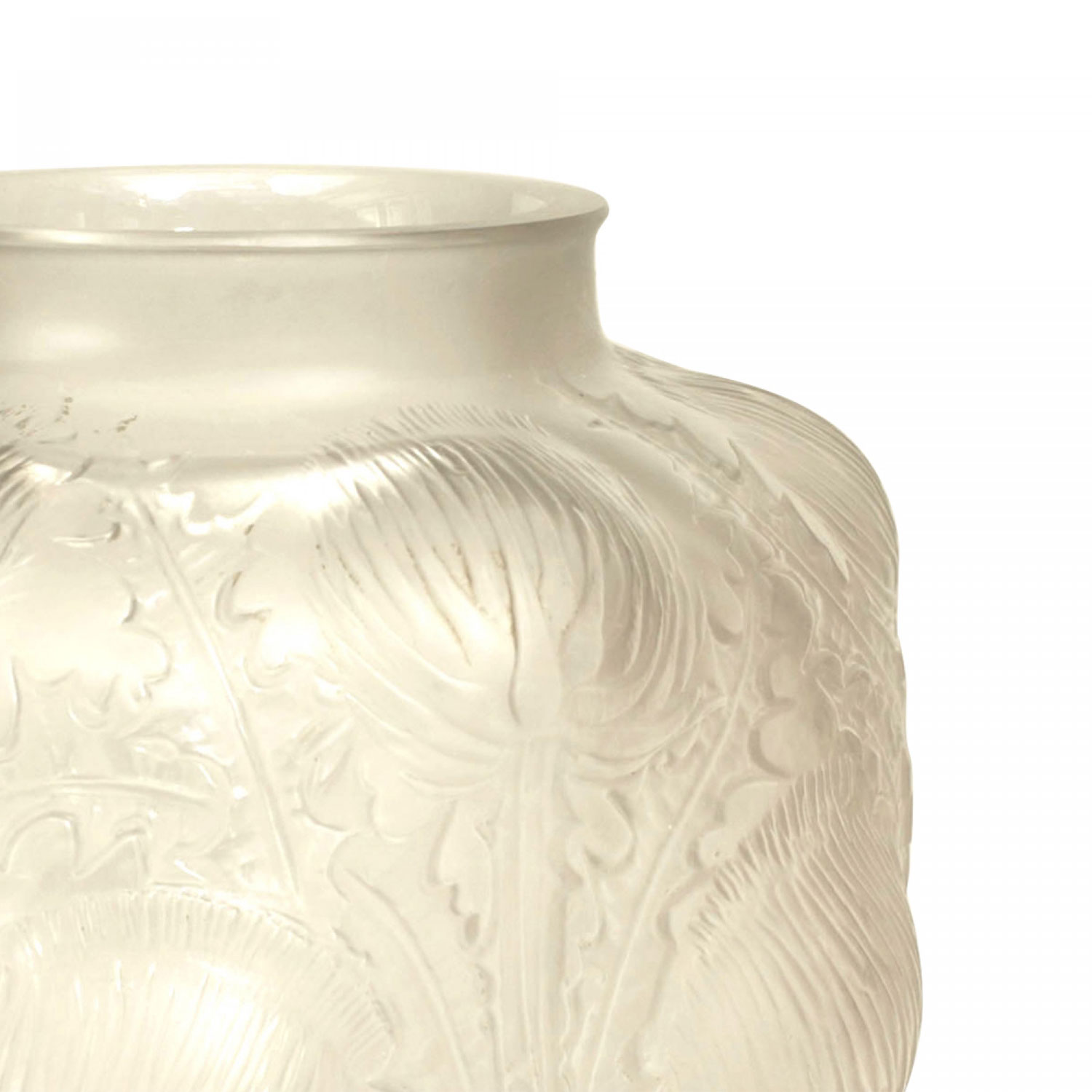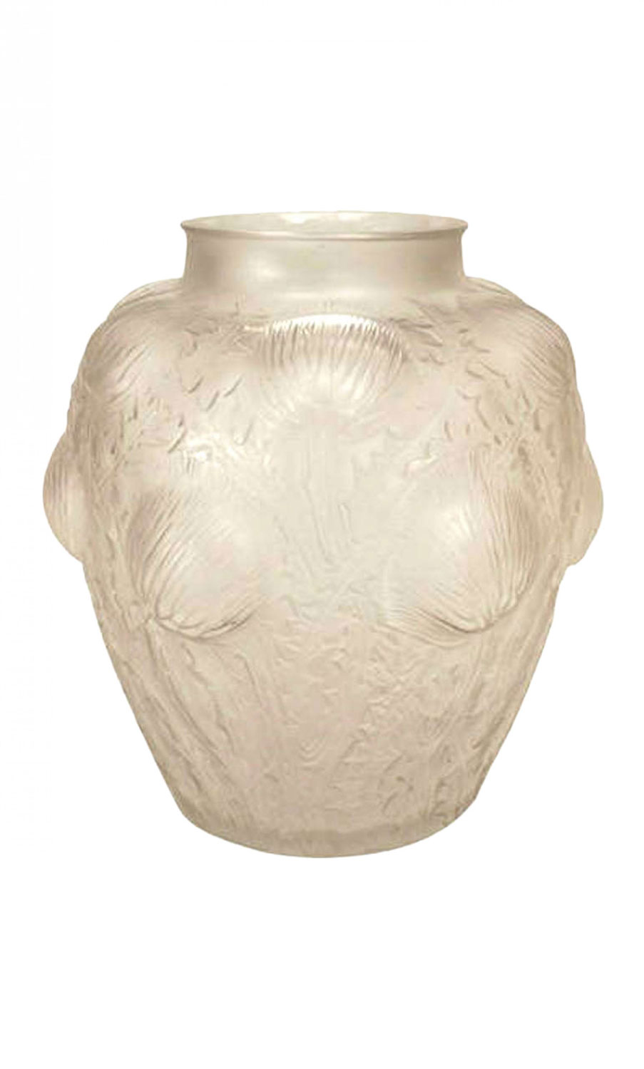 PAIR of French Art Deco frosted glass "DOMREMY" vases with floral relief designs (signed: LALIQUE).