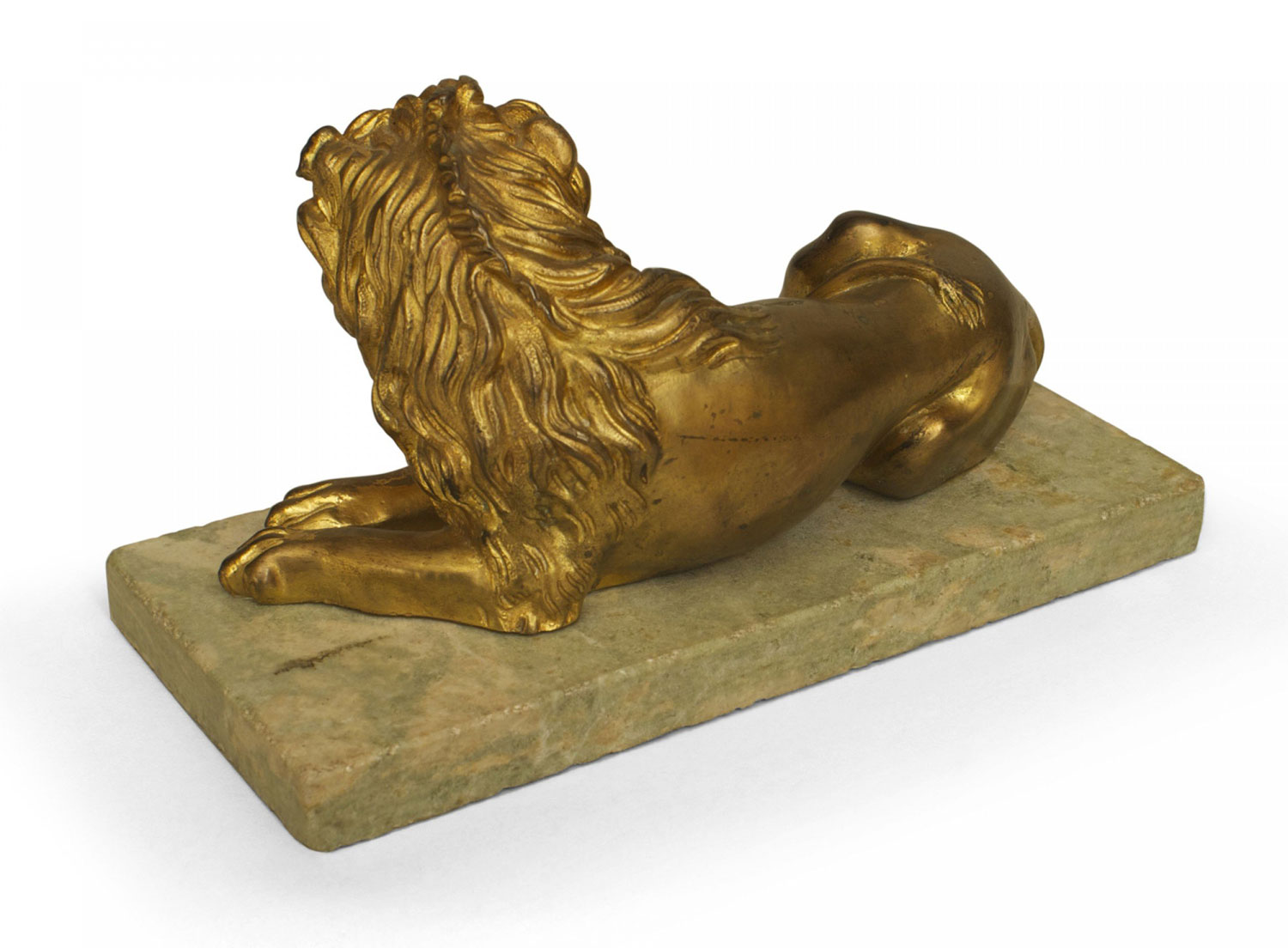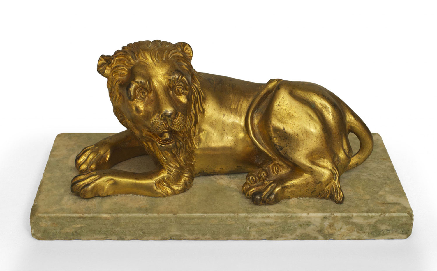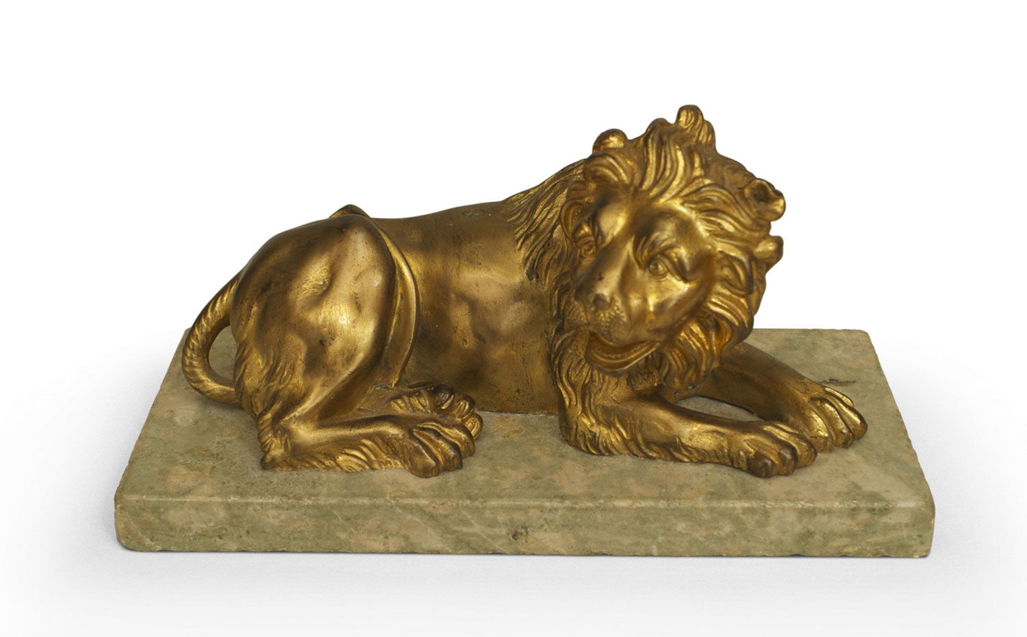 PAIR of Italian Renaissance (late 19th Cent) small gilt bronze lions on a pale green rectangular marble plinths.