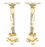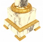 PAIR of Louis XVI style (19th Cent) white and black vein marble pedestals with a cylindrical center between a square top and 2 step square base with gilt bronze trim.