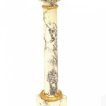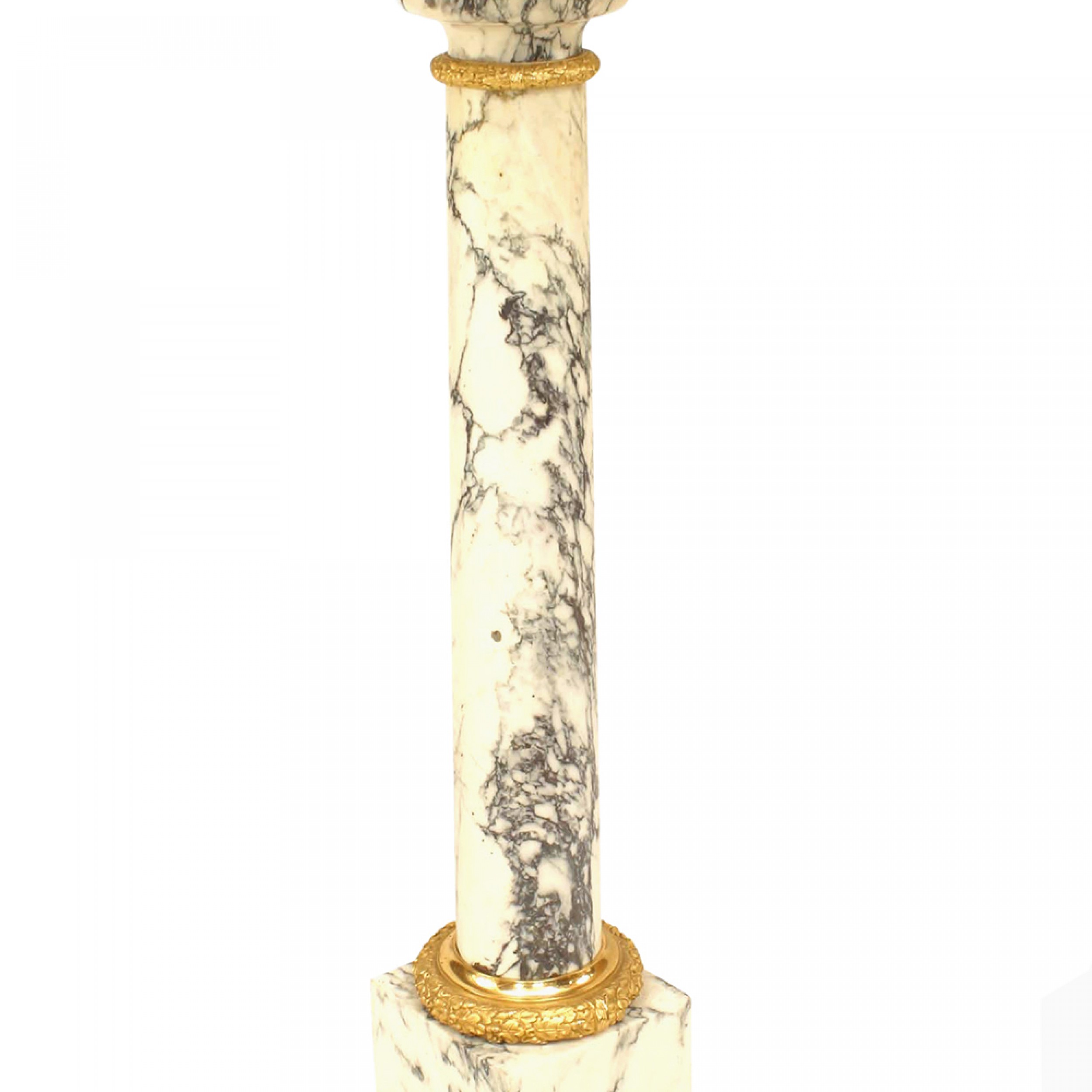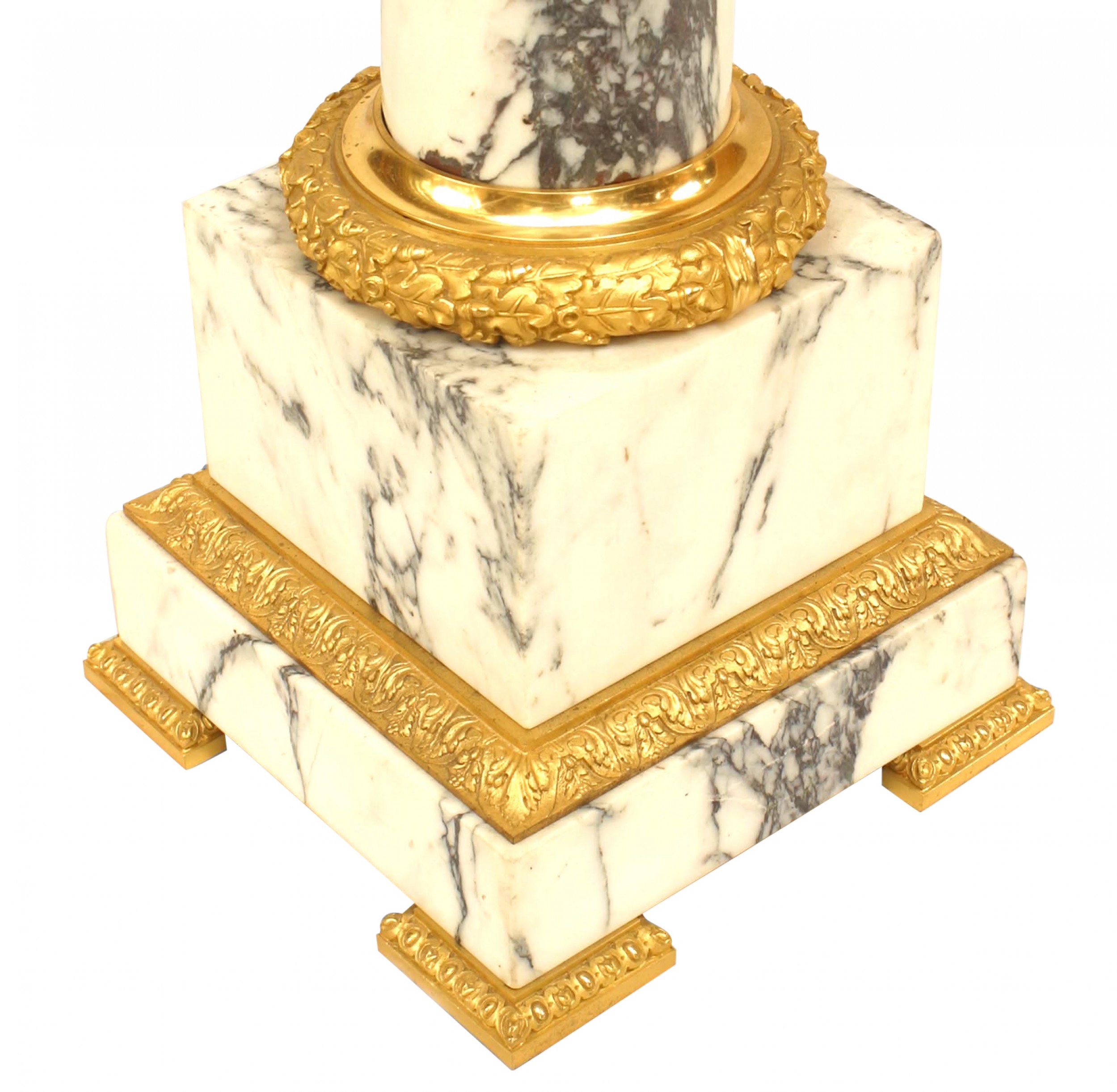 PAIR of Louis XVI style (19th Cent) white and black vein marble pedestals with a cylindrical center between a square top and 2 step square base with gilt bronze trim..