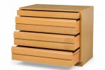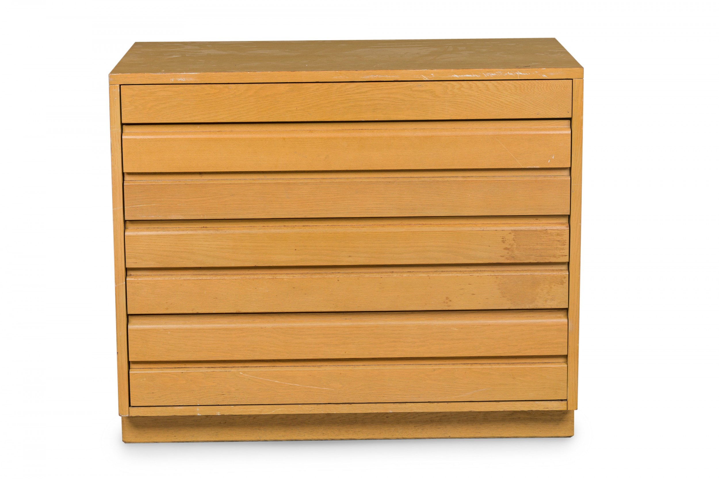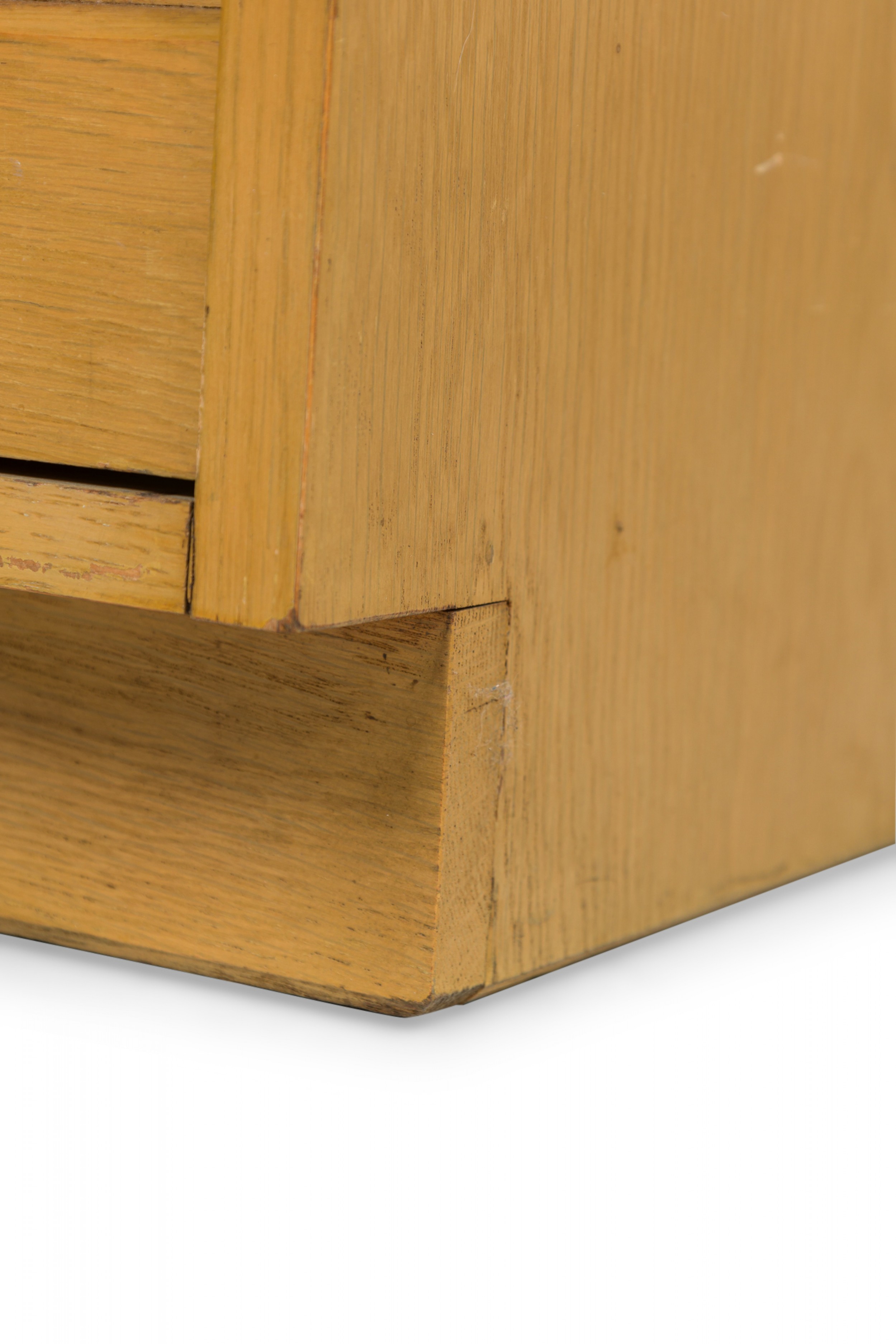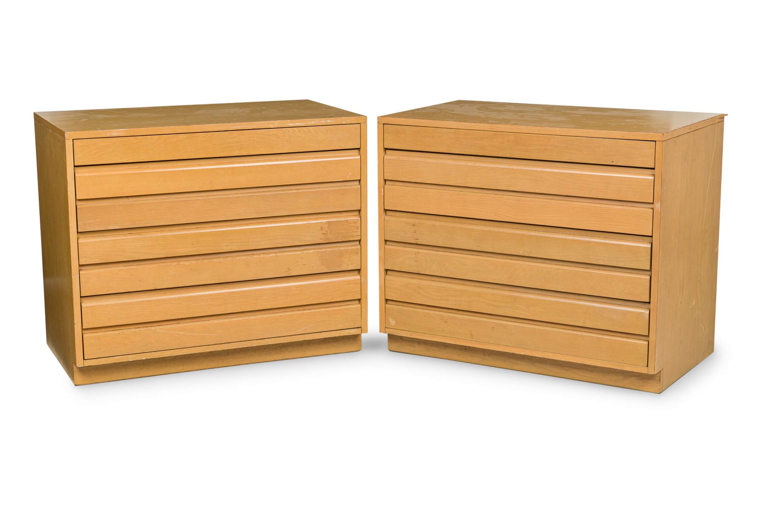 PAIR of Mid-Century American Modern (1950s) nightstands / chests with a blond wood veneer, one shallow three compartment drawer and three deeper drawers below with decorative slat fronts. (SLIGH FURNITURE) (PRICED AS PAIR)