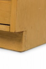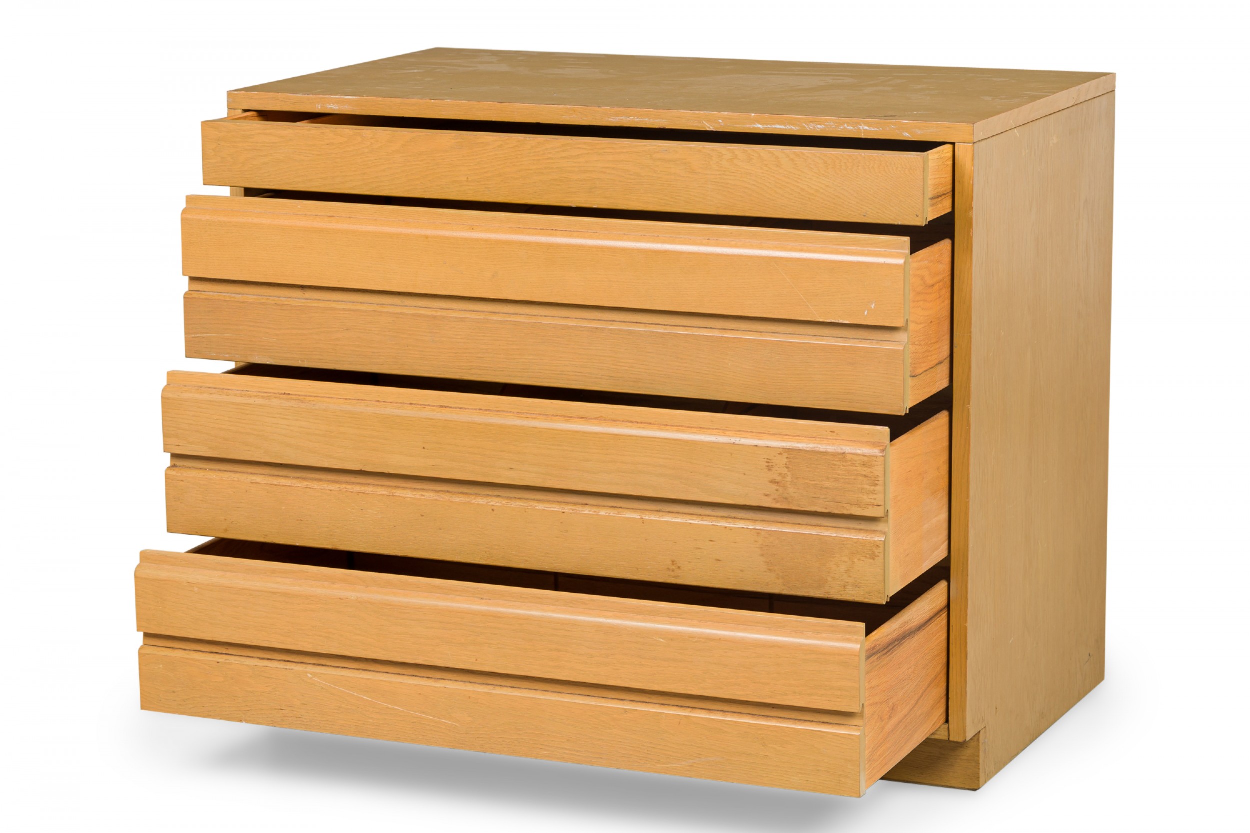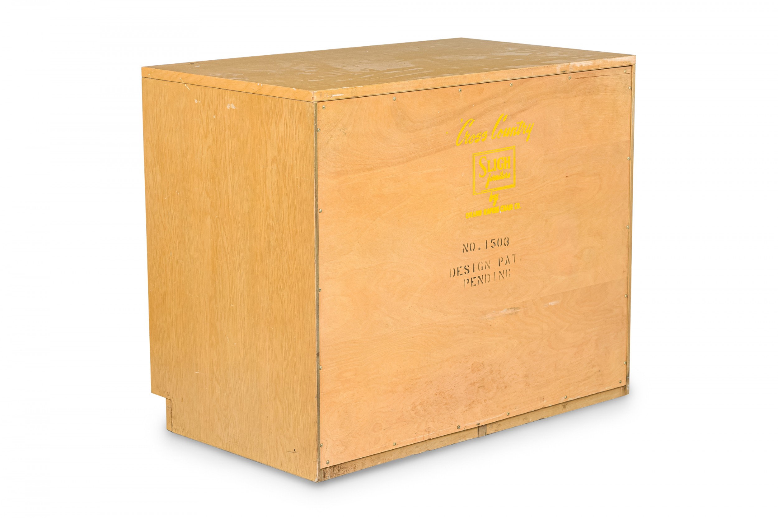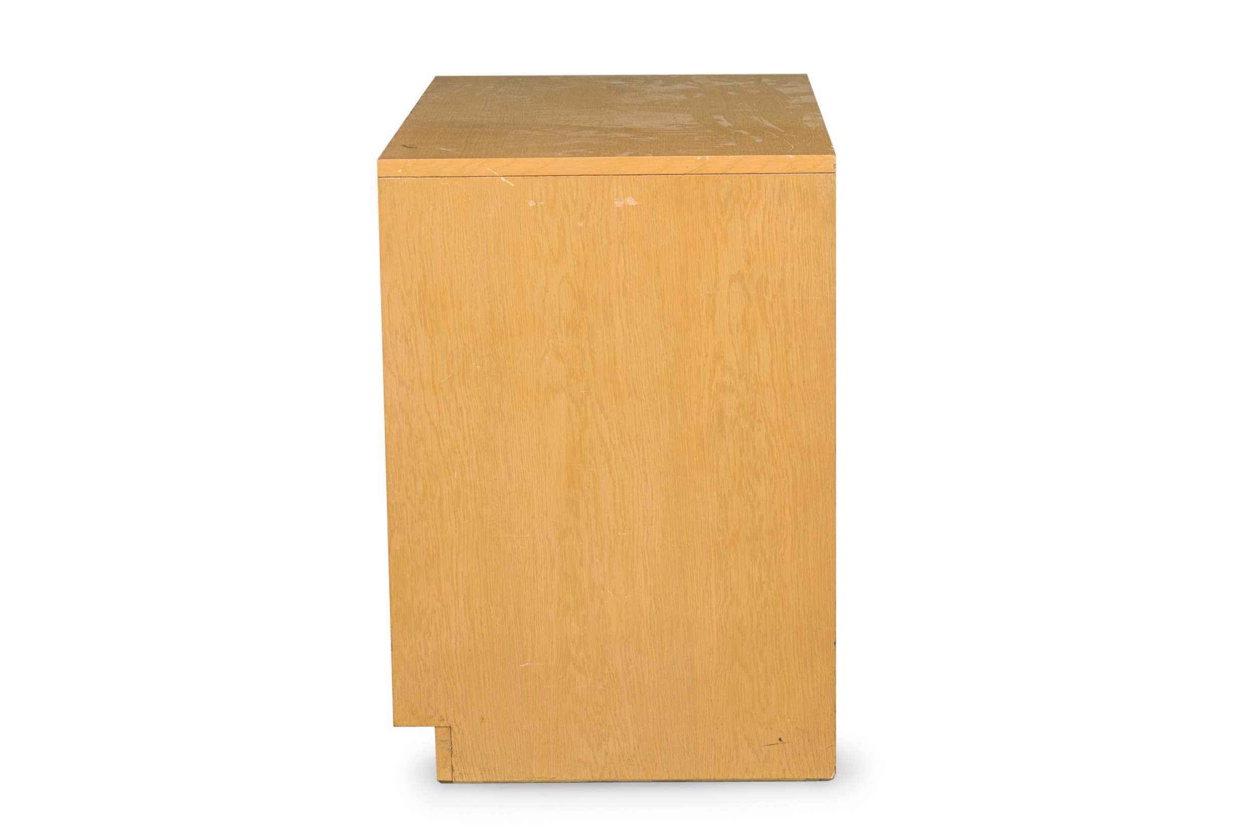 PAIR of Mid-Century American Modern (1950s) nightstands / chests with a blond wood veneer, one shallow three compartment drawer and three deeper drawers below with decorative slat fronts. (SLIGH FURNITURE) (PRICED AS PAIR).
