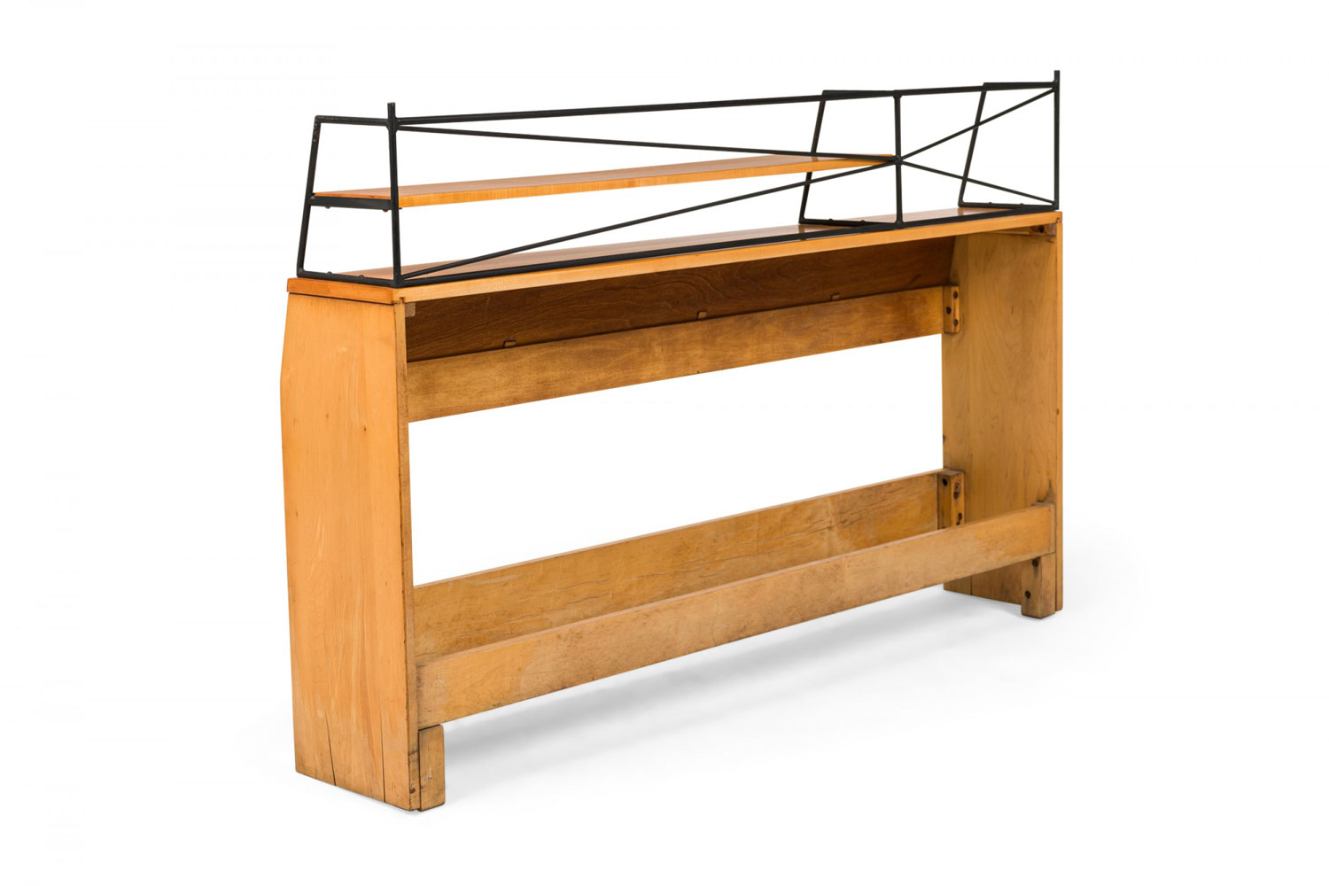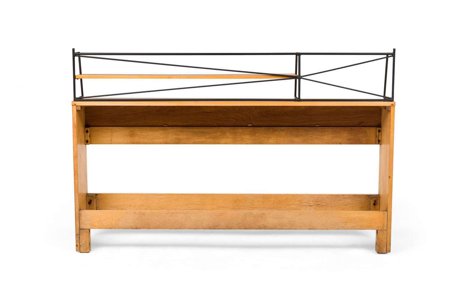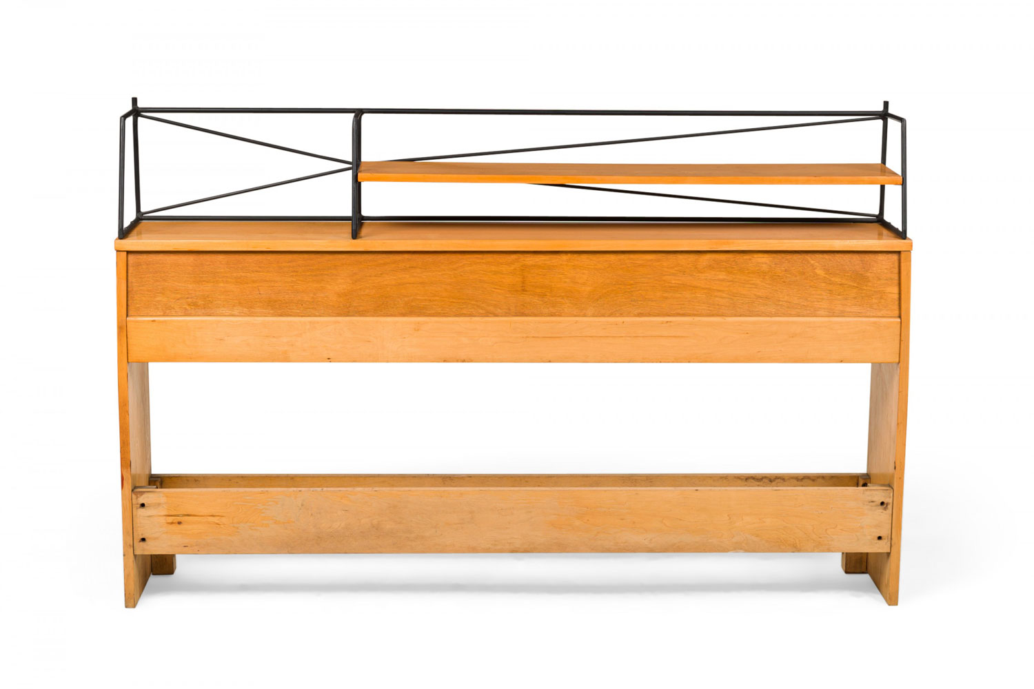 Mid-Century American full-size bookcase / headboard constructed of maple wood with black enameled steel wire rod shelving (Planner Group). (PAUL MCCOBB FOR WINCHENDON FURNITURE COMPANY).