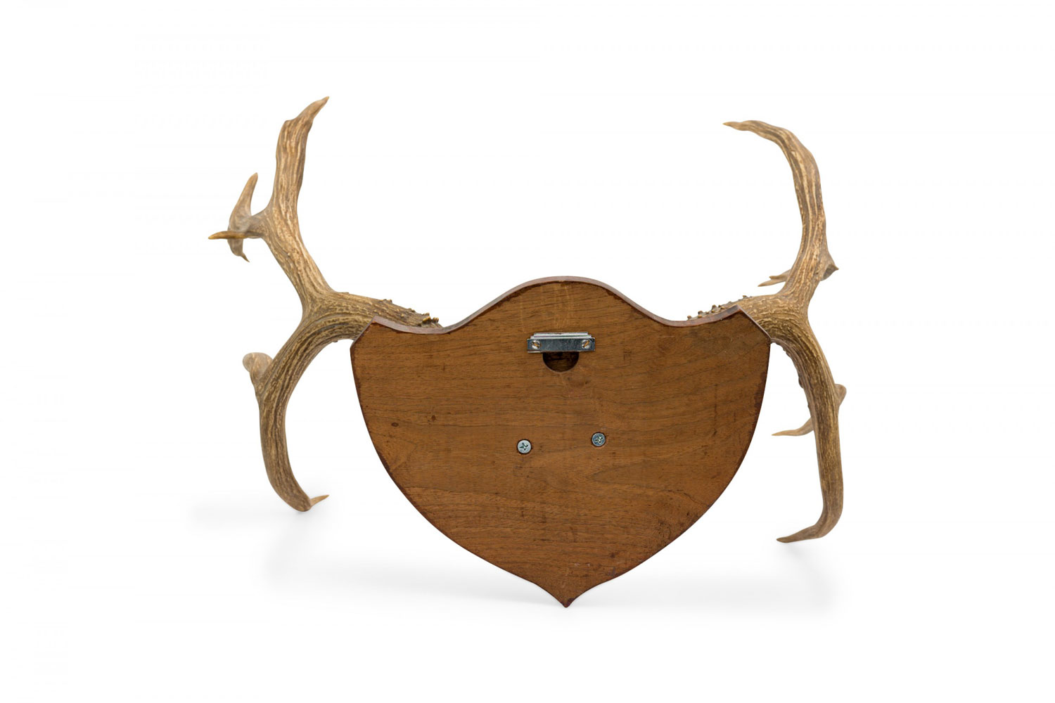 Rustic decorative game trophy / wall plaque composed of two deer antlers mounted in a muted red suede covered block, mounted on a shield-form wooden wall plaque.