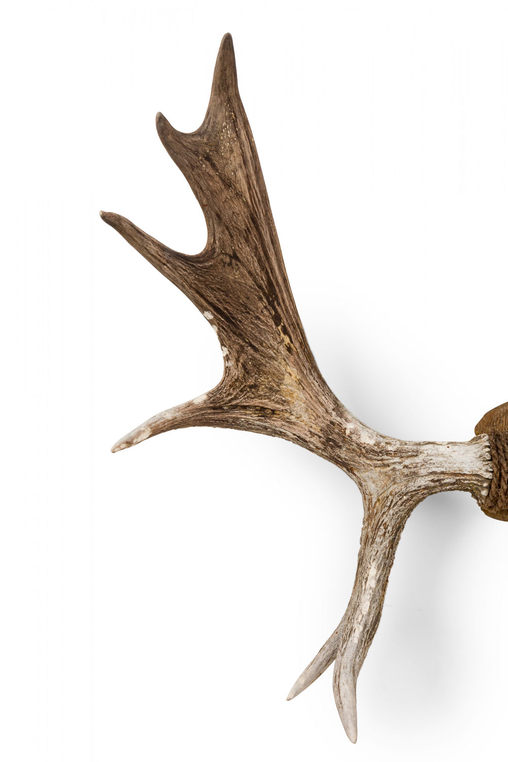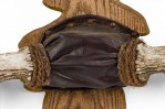 Rustic decorative game trophy / wall plaque featuring two moose antlers mounted in a dark brown leather block with decorative brass nails and rope wrap, mounted on an oak leaf-shaped wooden wall plaque..