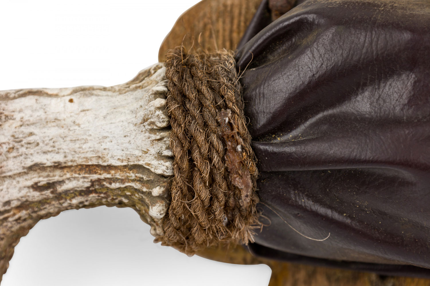 Style: Rustic Materials & Techniques: Brass, horn, leather, rope, wood Category: Sporting/Gaming, Rustic Good; Wear consistent with age and use