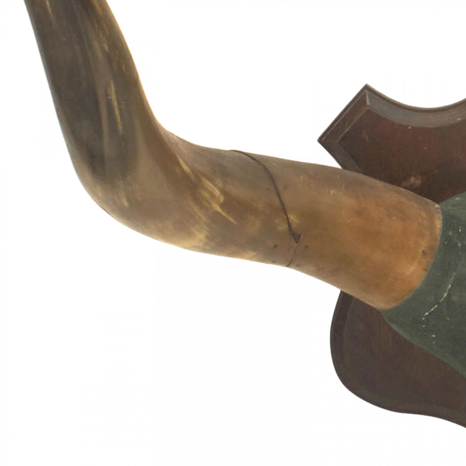 Rustic style American long horn steer wall plaque mounted on a mahogany keystone shaped backing..