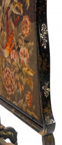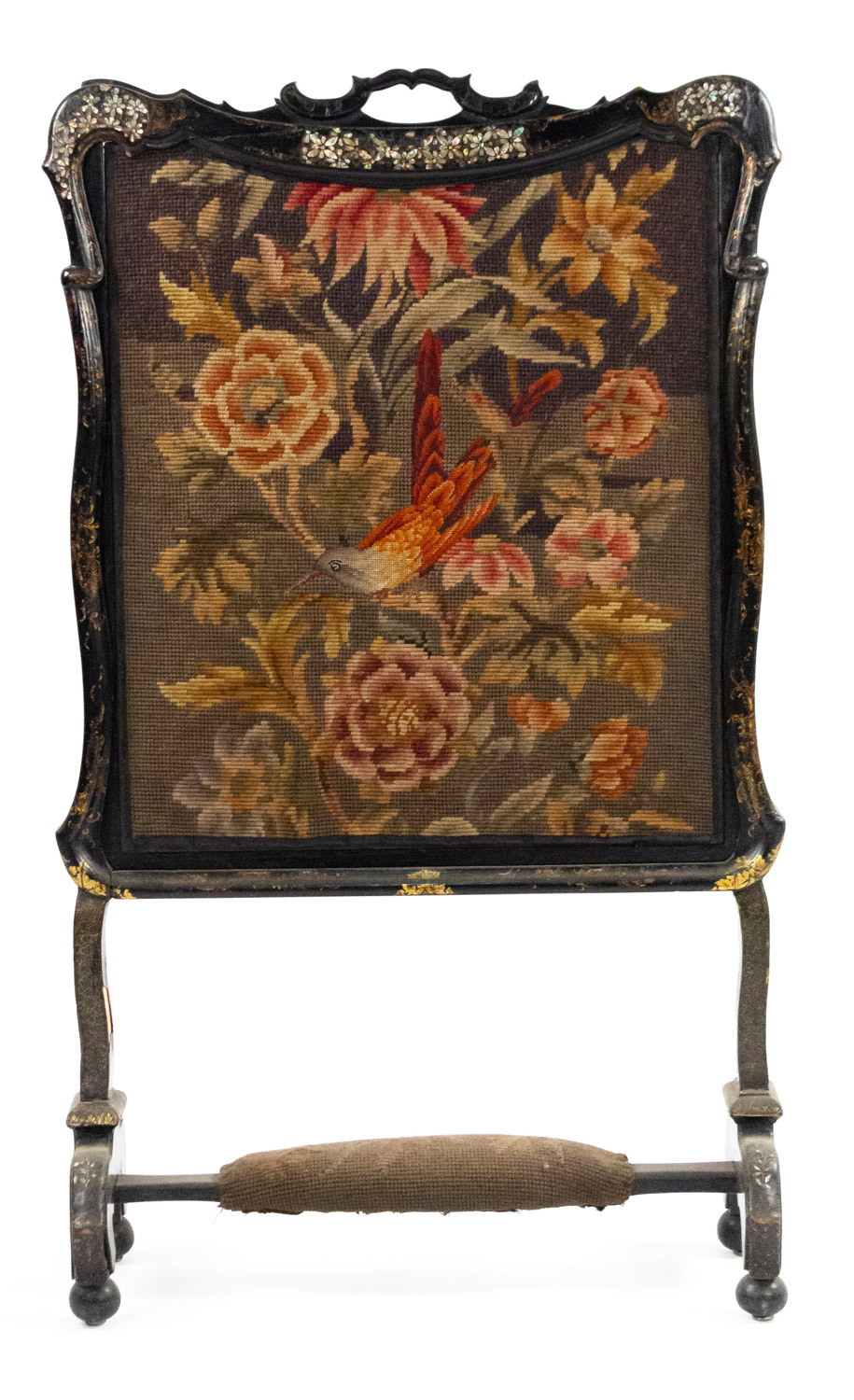 English Victorian papier-mache pearl inlaid black lacquered fire screen with a needlepoint panel..