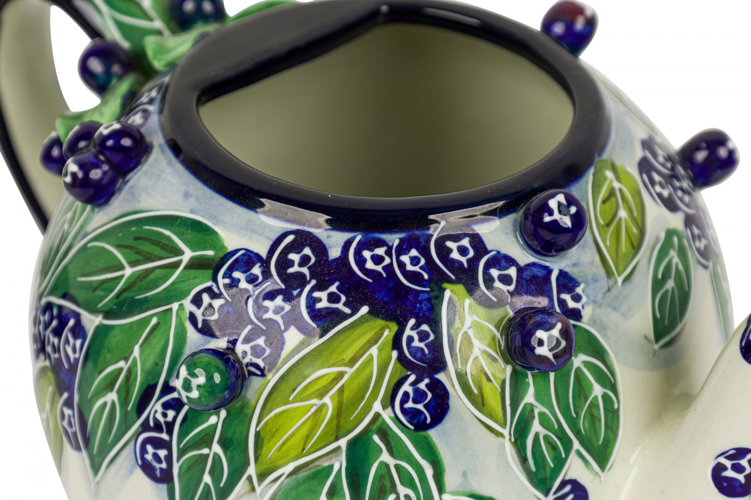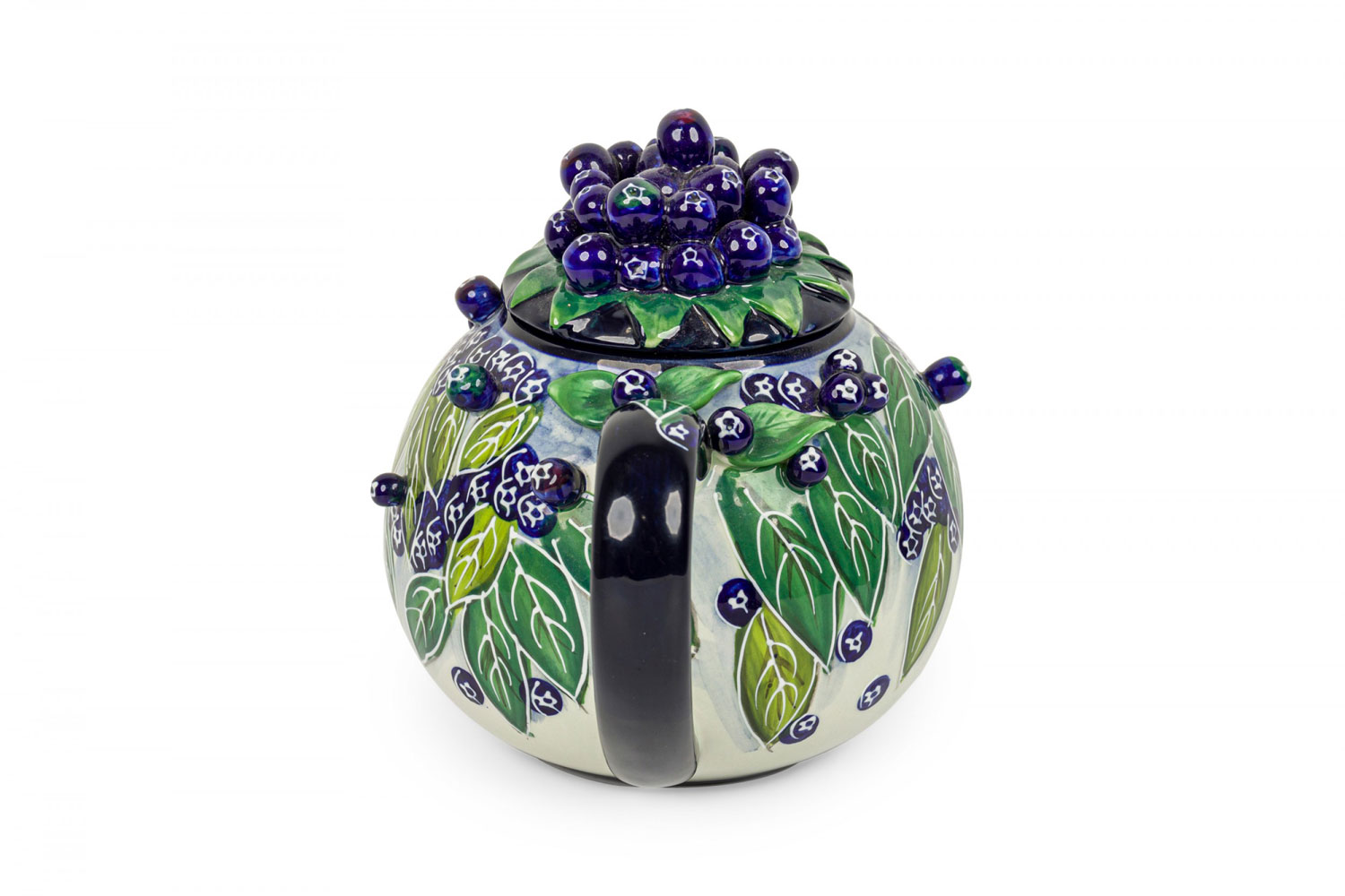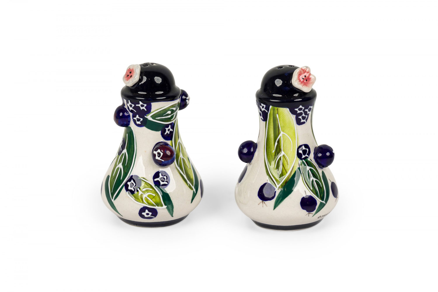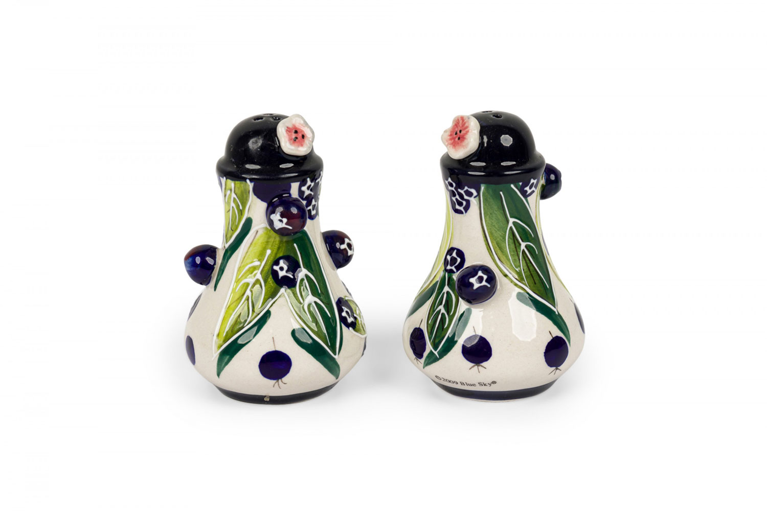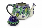 Vintage 5-piece crockery set including a teapot, sugar bowl (with spoon), cream pitcher, and salt and pepper shakers with a blueberry and leaf motif. (PRICED AS SET)