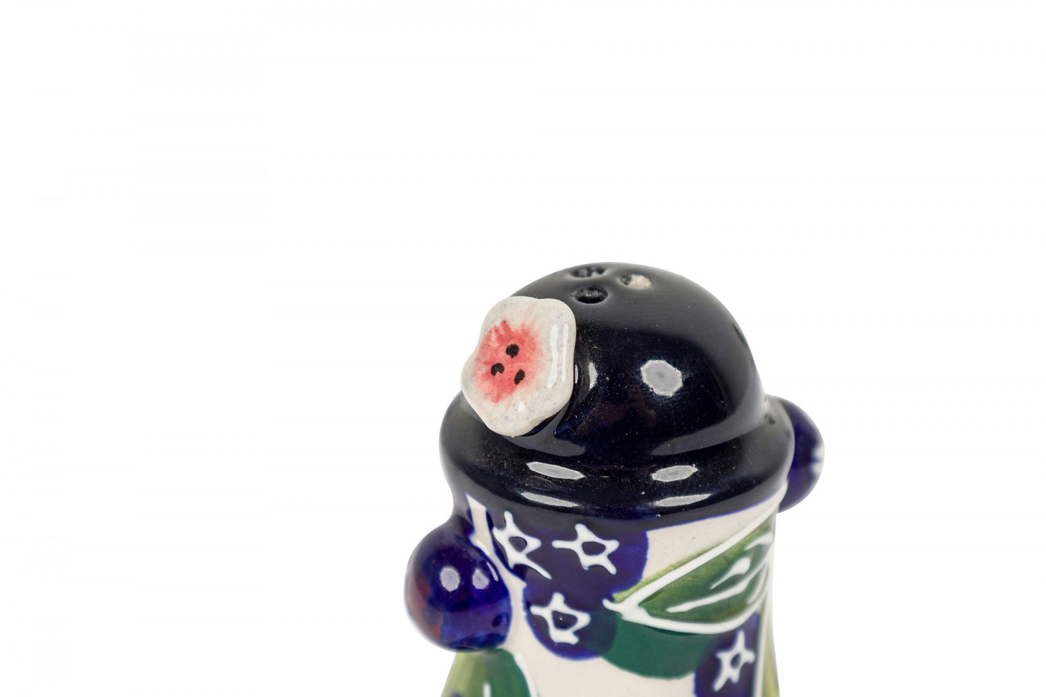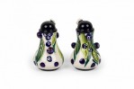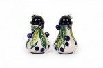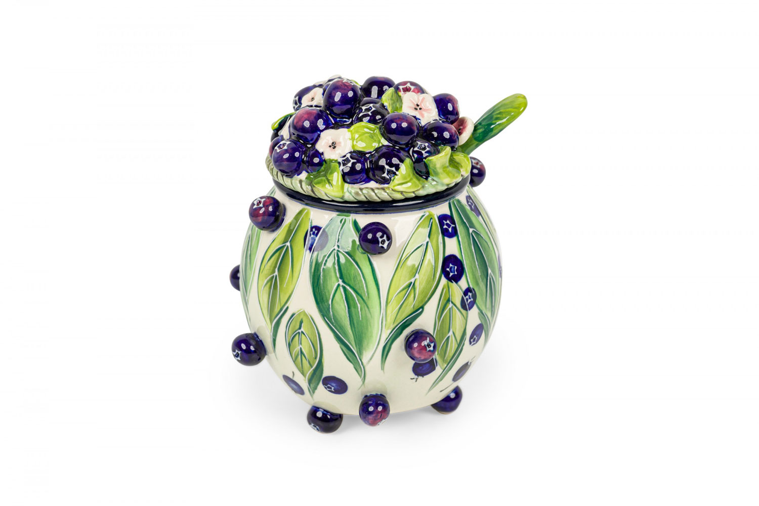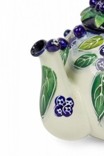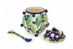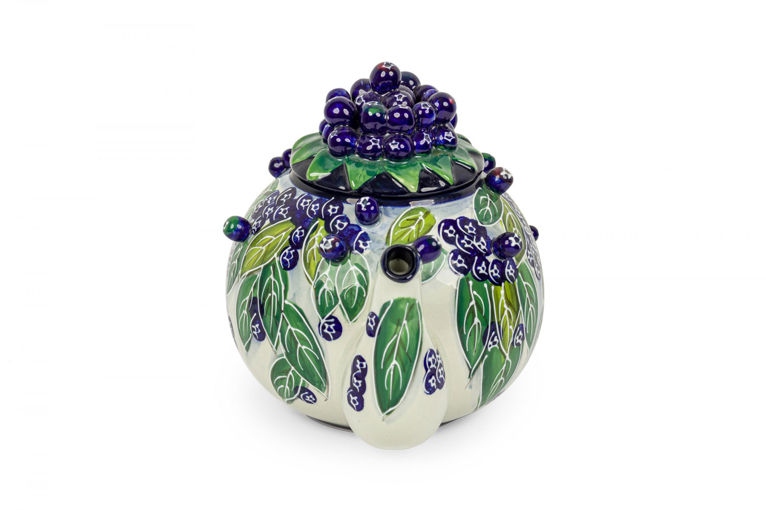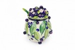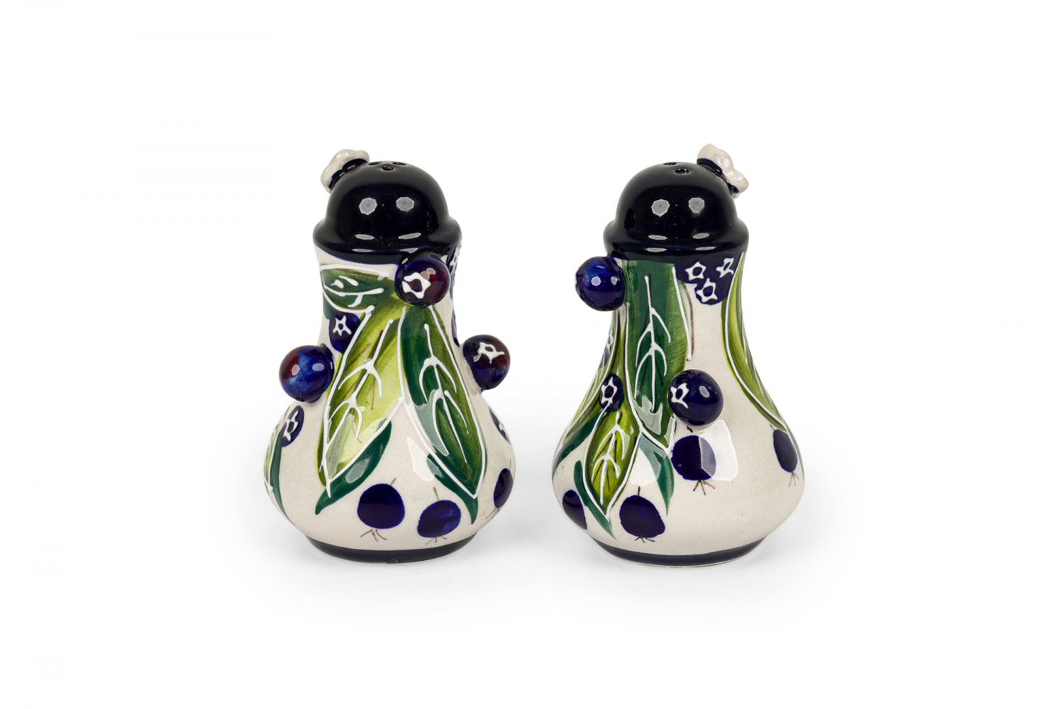 Vintage 5-piece crockery set including a teapot, sugar bowl (with spoon), cream pitcher, and salt and pepper shakers with a blueberry and leaf motif. (PRICED AS SET)