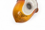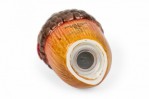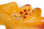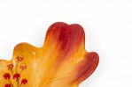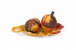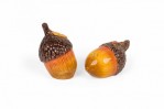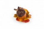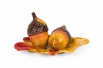 Vintage ceramic salt and pepper shaker set with acorn-shaped shakers resting on a single autumn leaf-shaped plates, finished in brown, yellow, and red glaze. (PRICED AS SET)