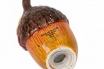 Vintage ceramic salt and pepper shaker set with acorn-shaped shakers resting on a single autumn leaf-shaped plates, finished in brown, yellow, and red glaze. (PRICED AS SET).