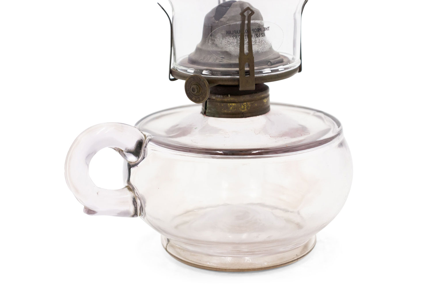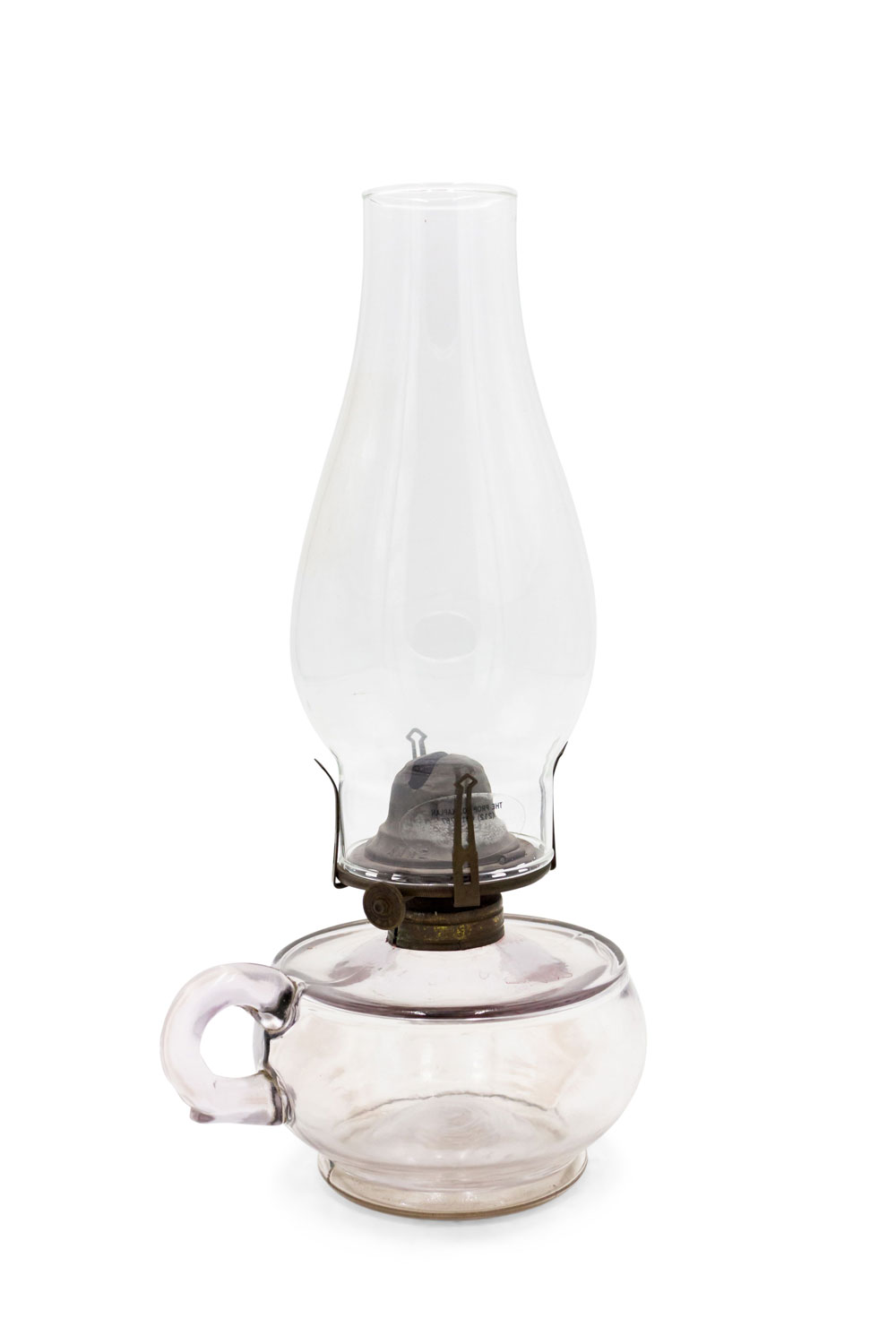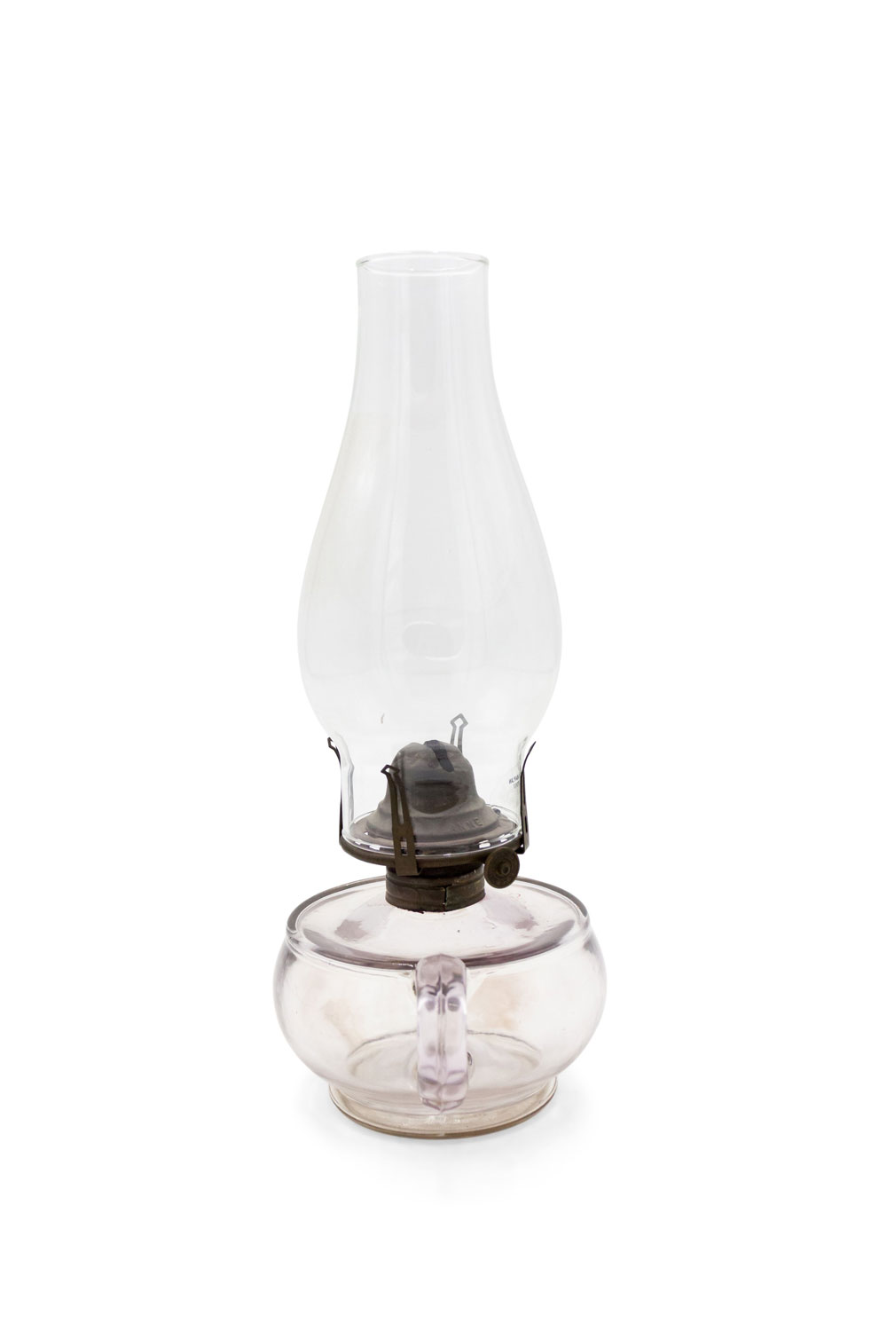 Vintage glass oil lamp with brown tinted glass oil font, hurricane chimney shade, and glass handle.