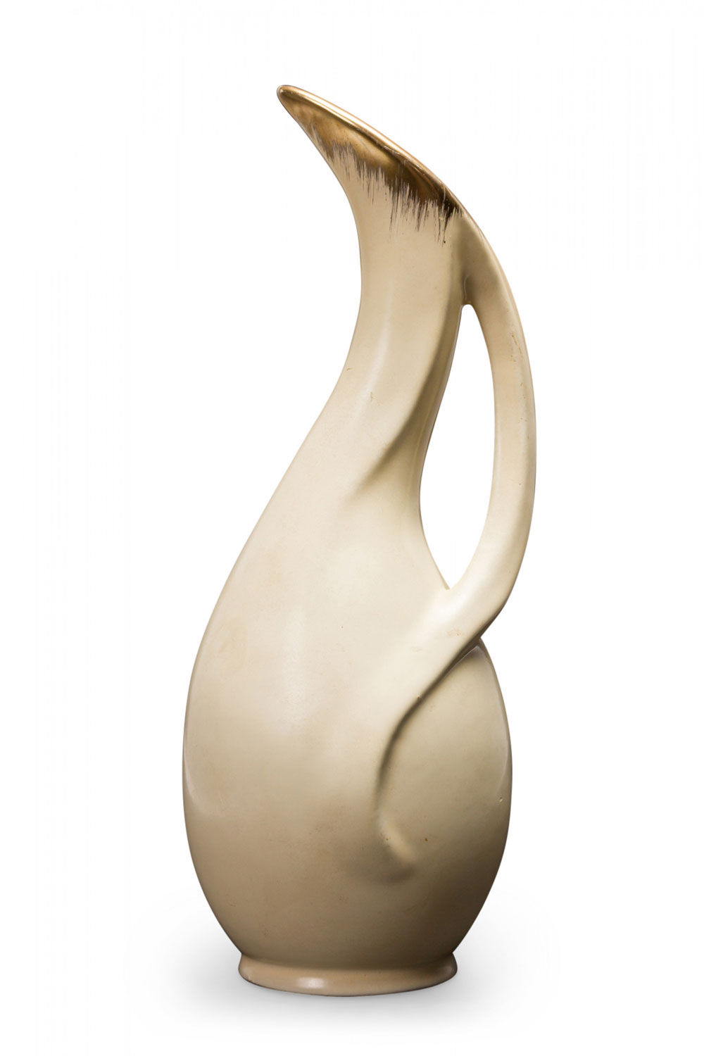 German Mid-Century curved organic form beige ceramic pitcher with a long elegant handle and curved neck. (mark on bottom, symbol for Üebelacker Keramik, Germany)