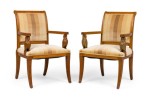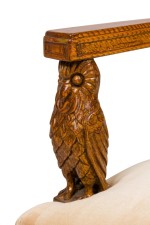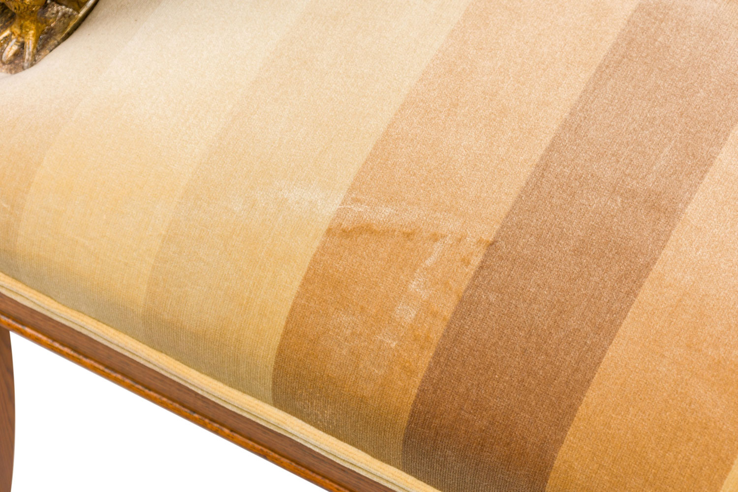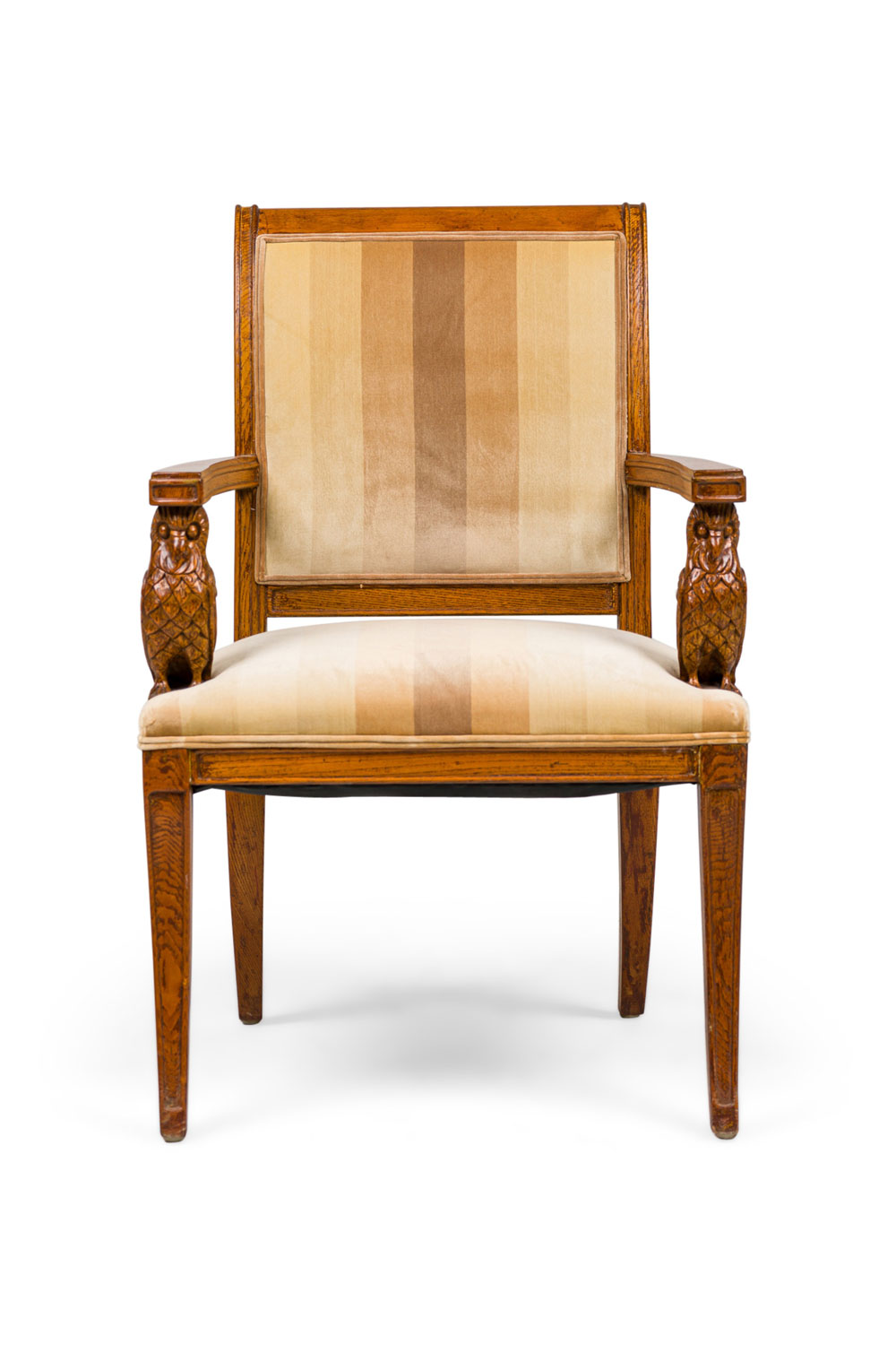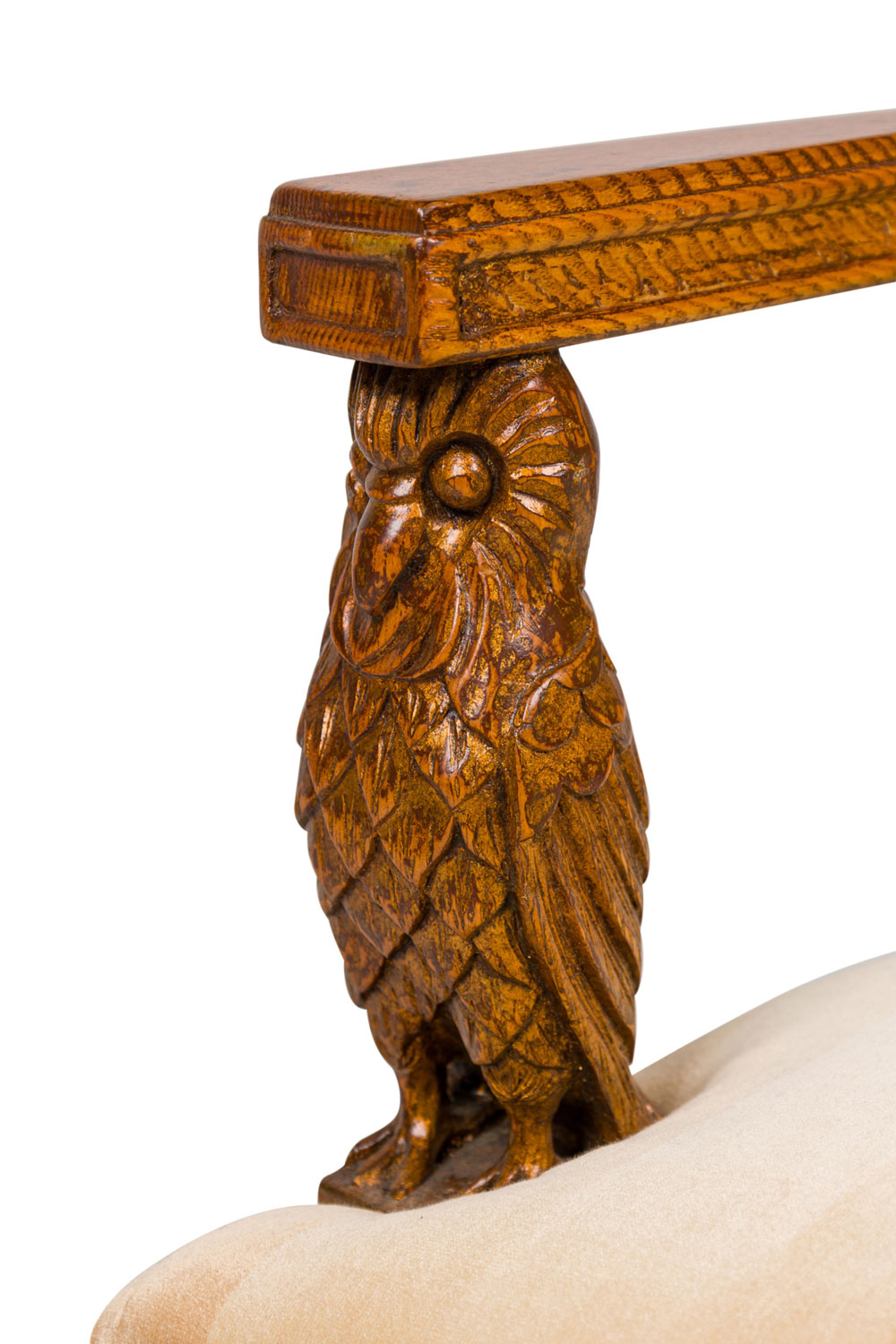 PAIR of Continental Rustic style open armchairs having gold and brown upholstered seat and back with carved owl arm supports (PRICED AS PAIR).
