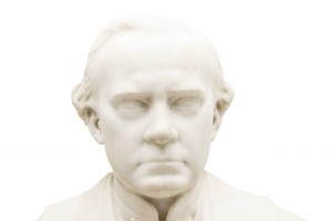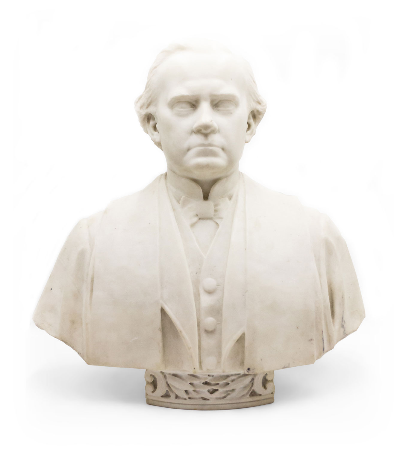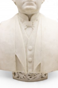 19th Century white marble bust of a gentleman in a suit resting on a round, ornately carved base.