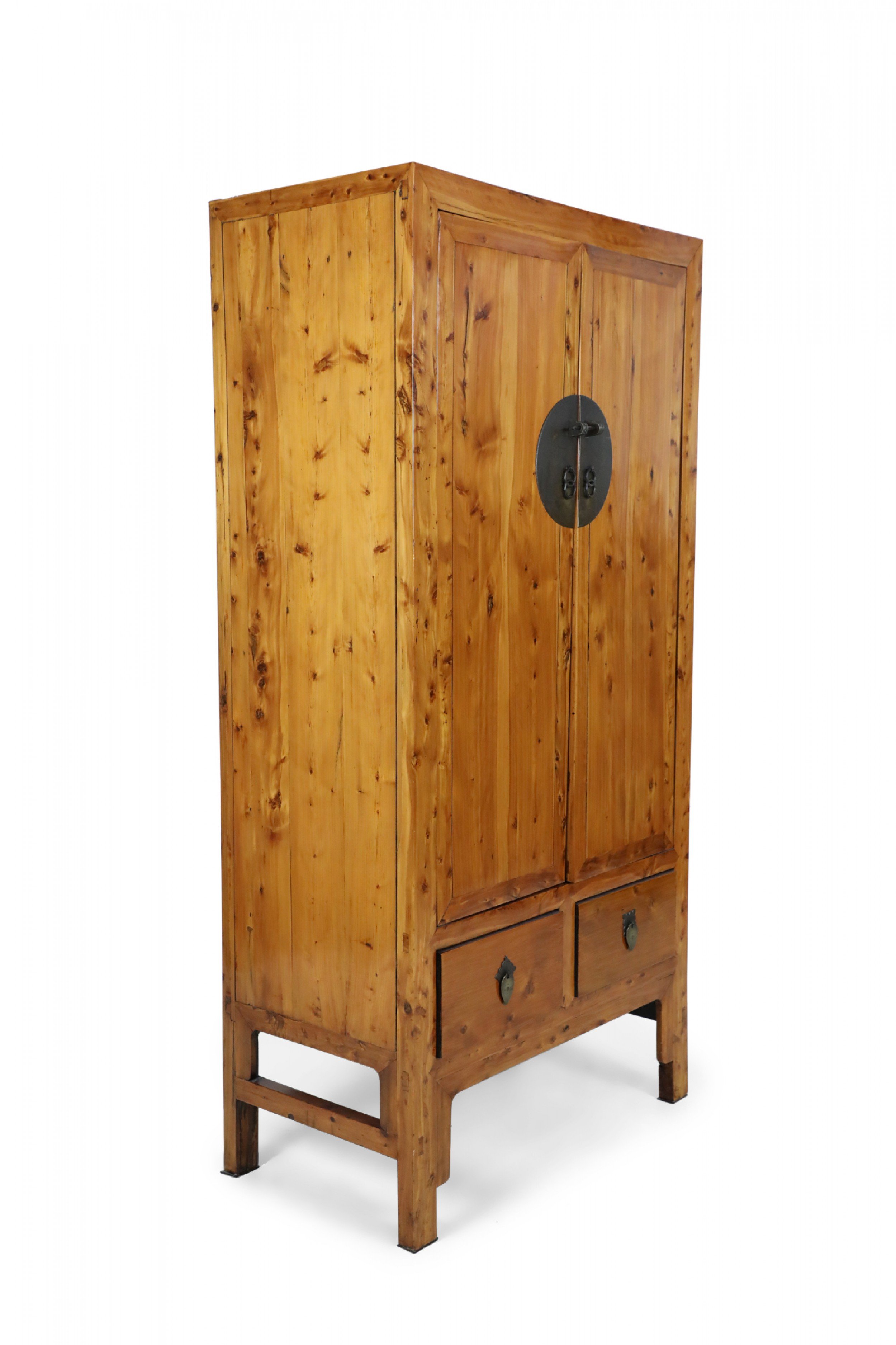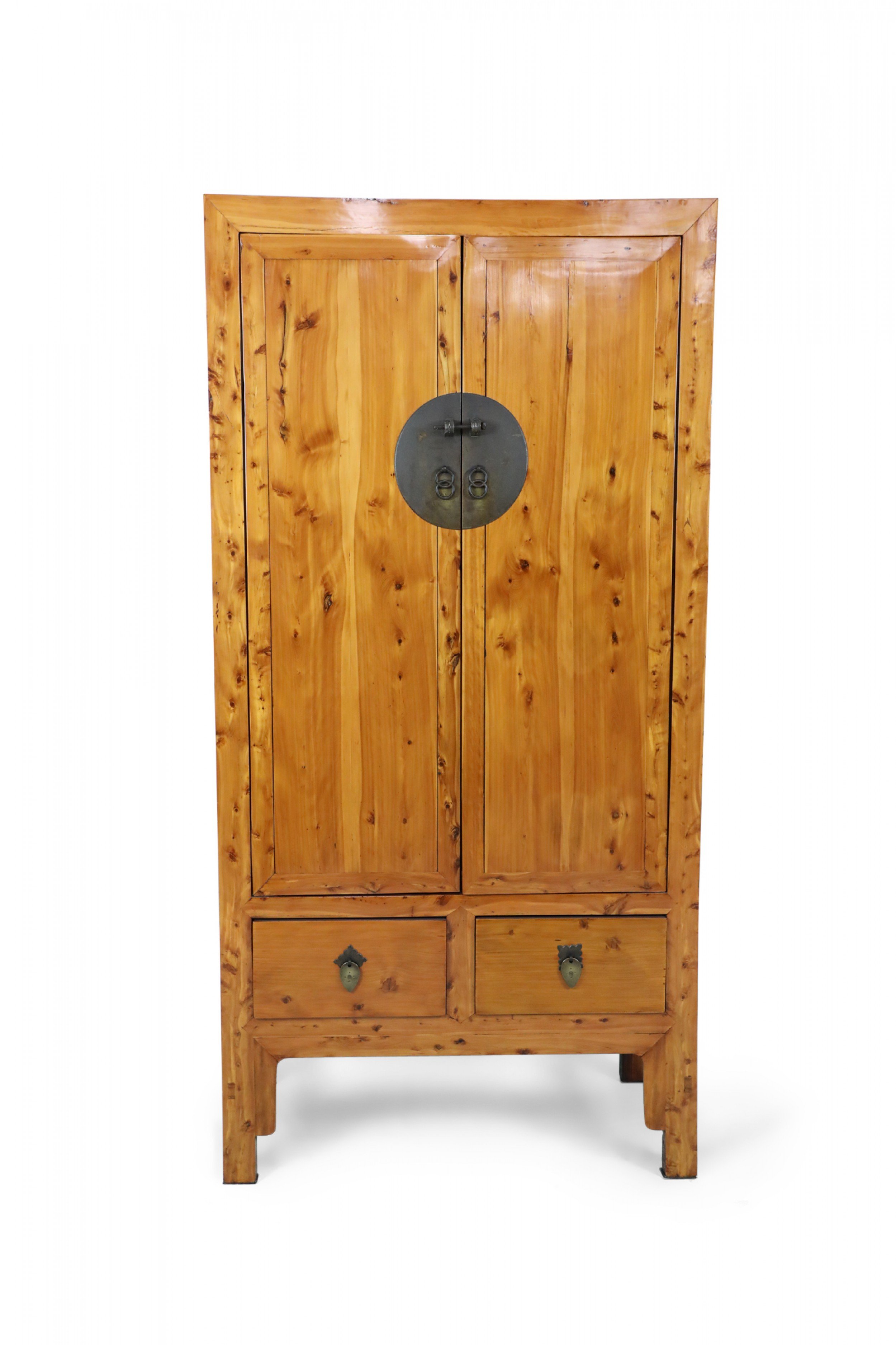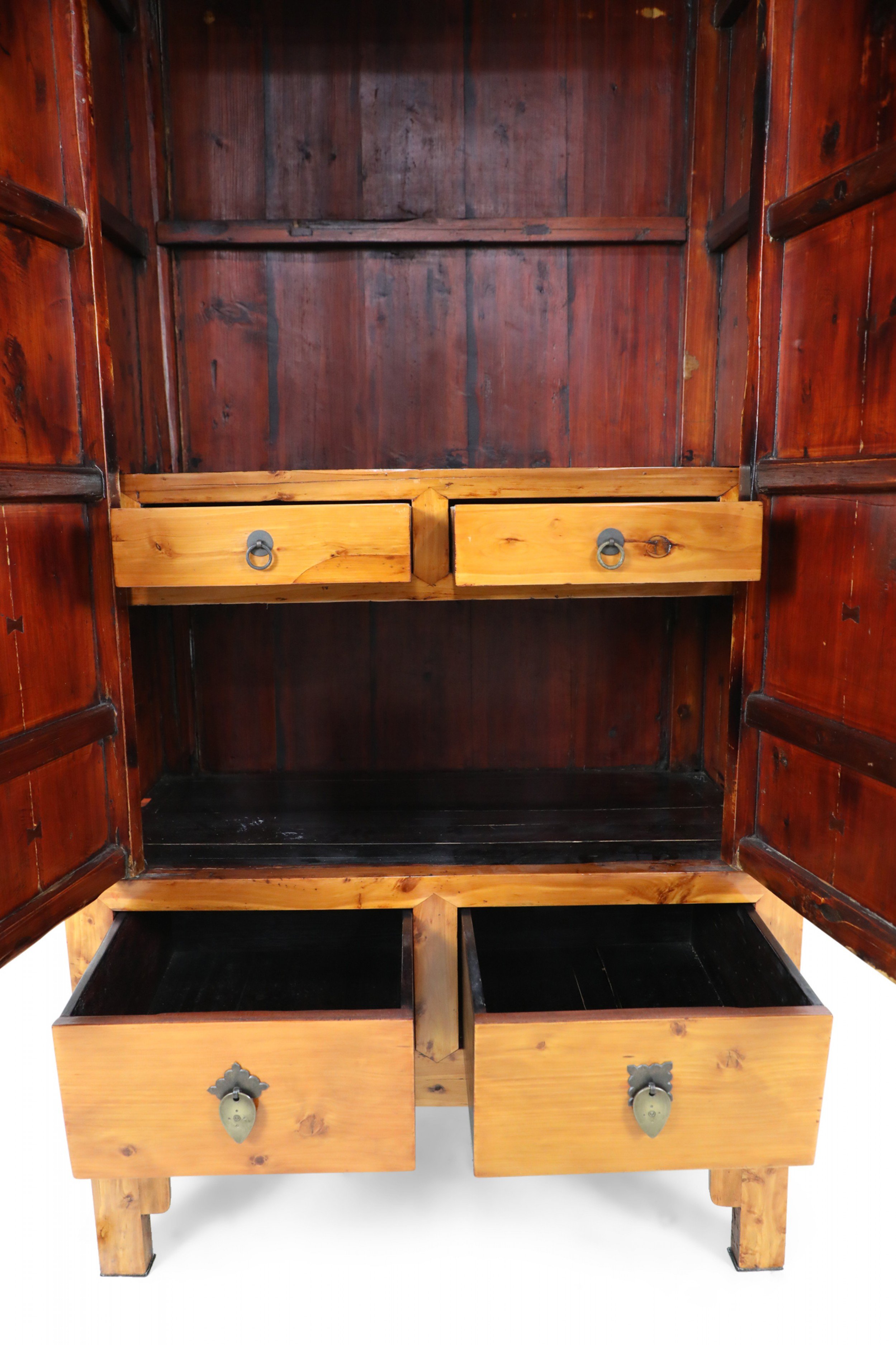 Chinese (19th Century) hardwood cabinet / armoire with large bronze barrel pin closure on the front 2 doors which have 2 interior pull drawers with 2 additional drawers beneath the armoire doors with leaf shaped bronze drawer pulls..