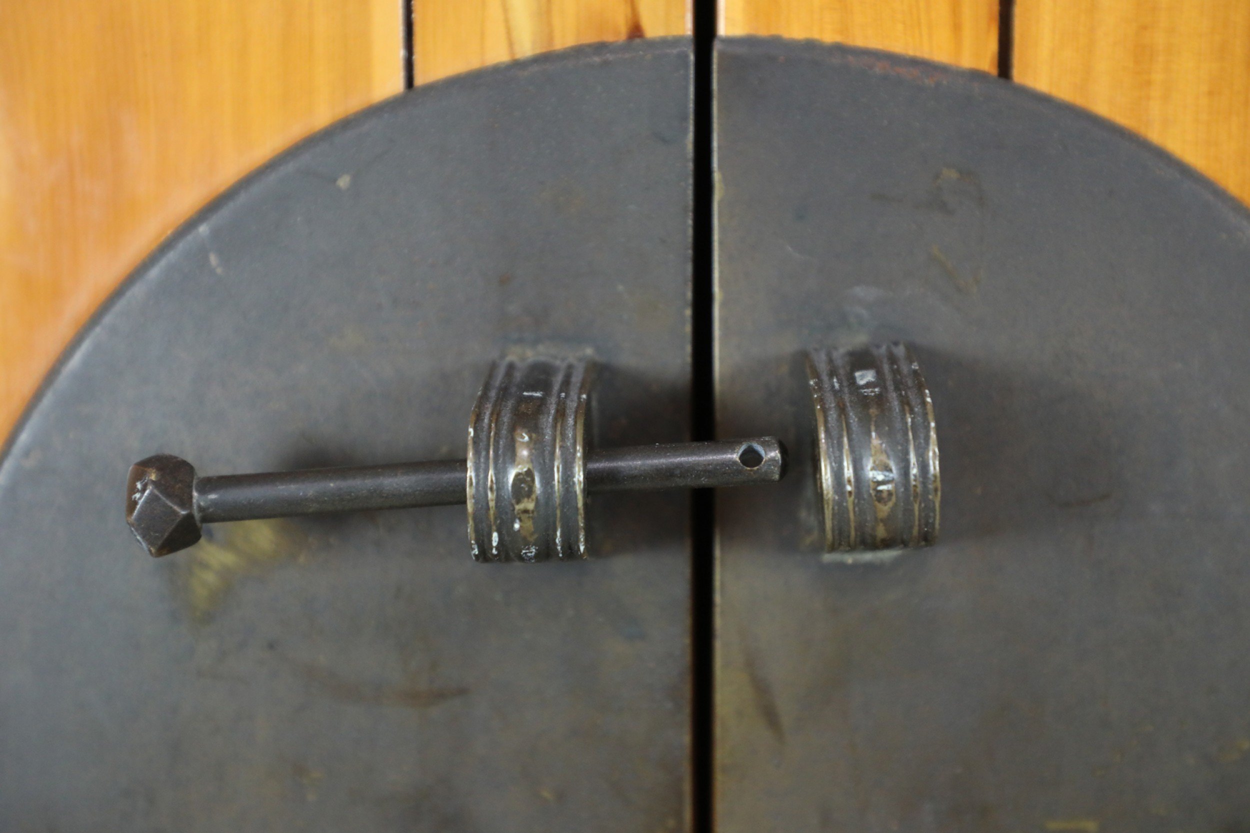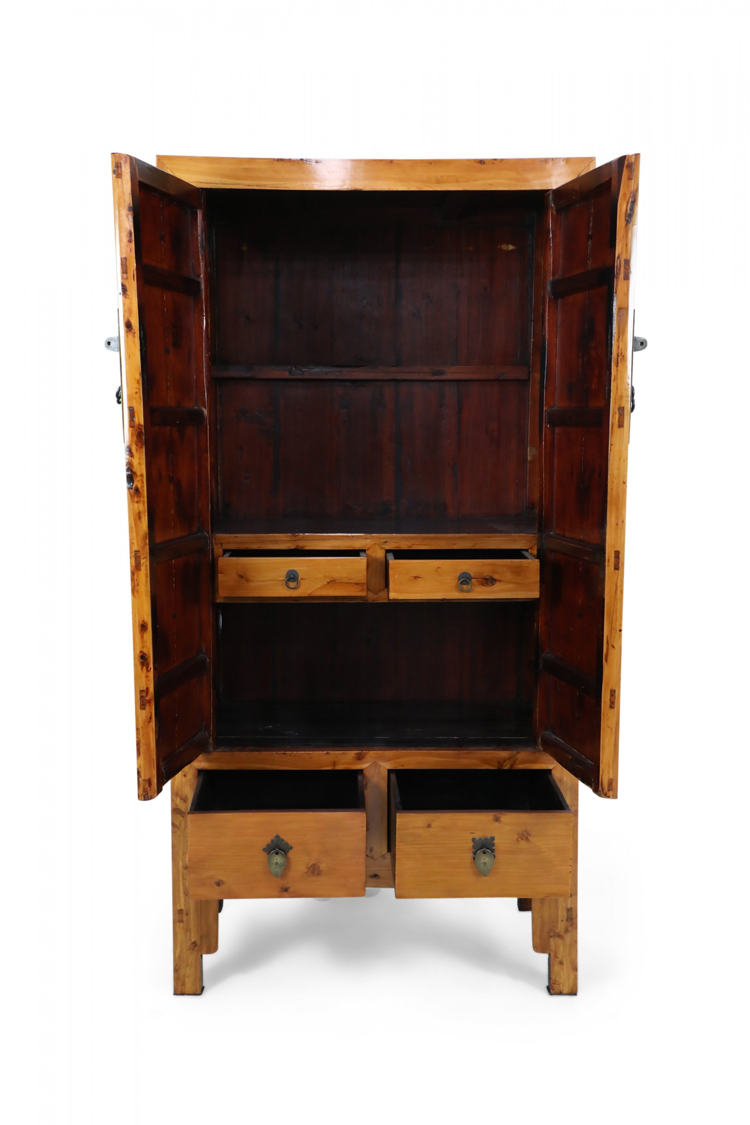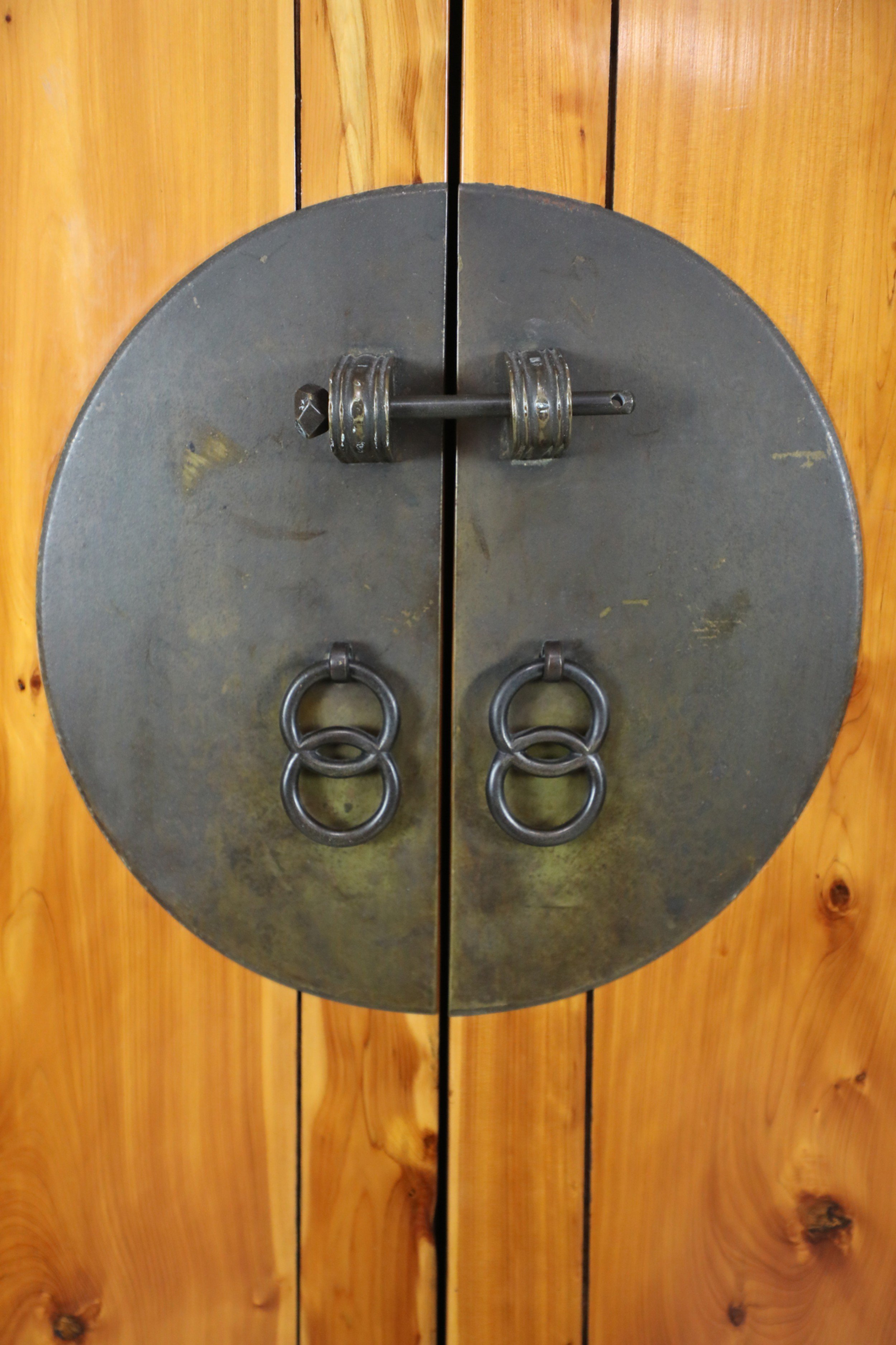 Chinese (19th Century) hardwood cabinet / armoire with large bronze barrel pin closure on the front 2 doors which have 2 interior pull drawers with 2 additional drawers beneath the armoire doors with leaf shaped bronze drawer pulls..
