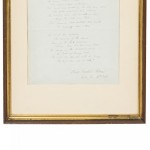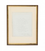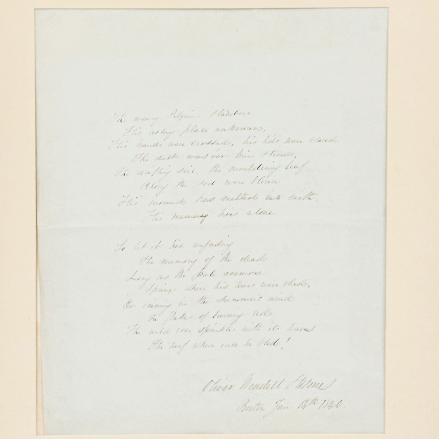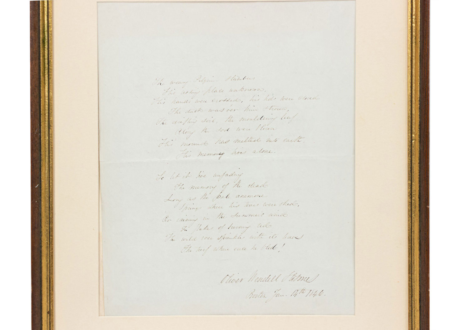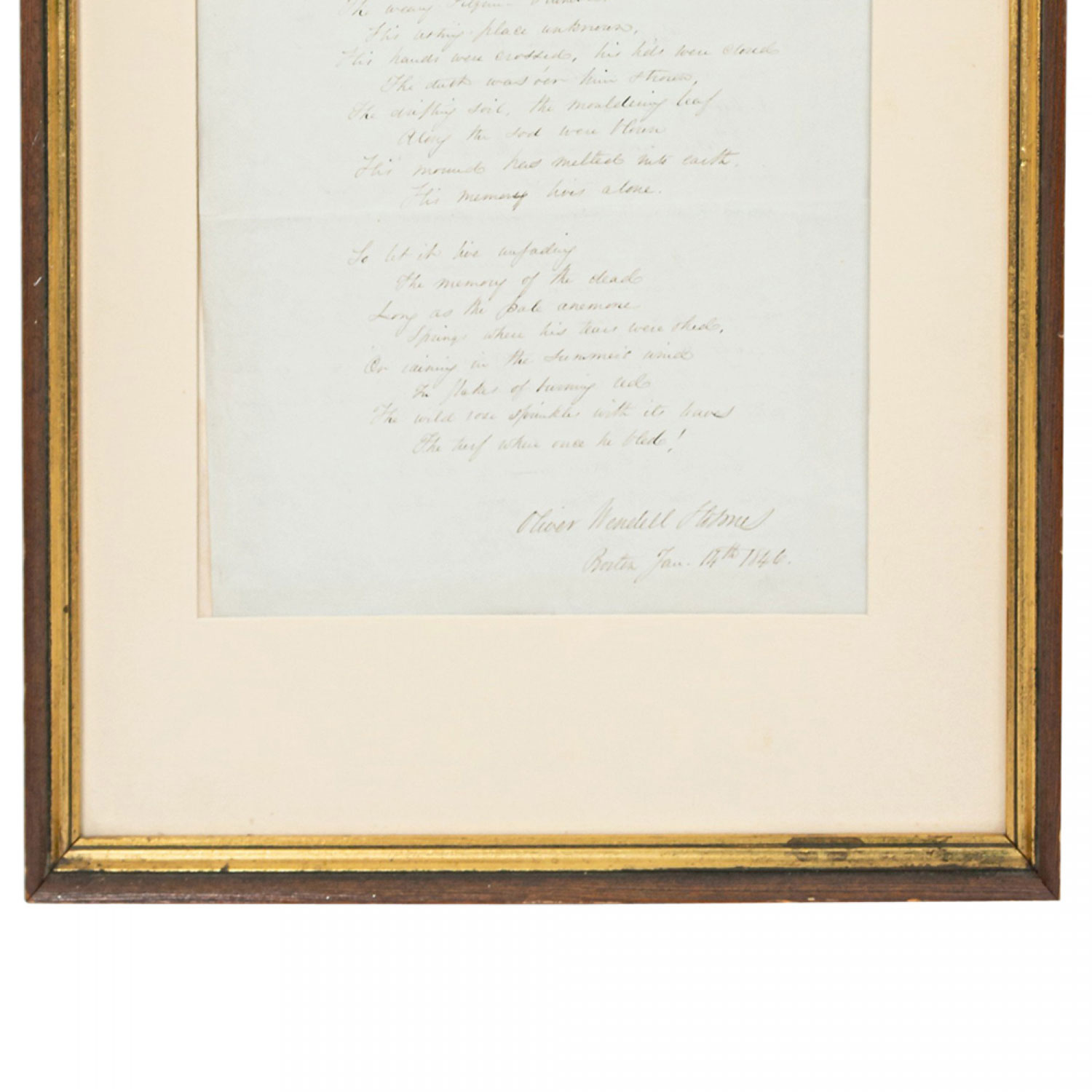Original poem in script dated 1846 in a rectangular wooden and gilt frame and beige matting (Oliver Wendell Holmes).