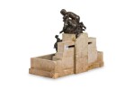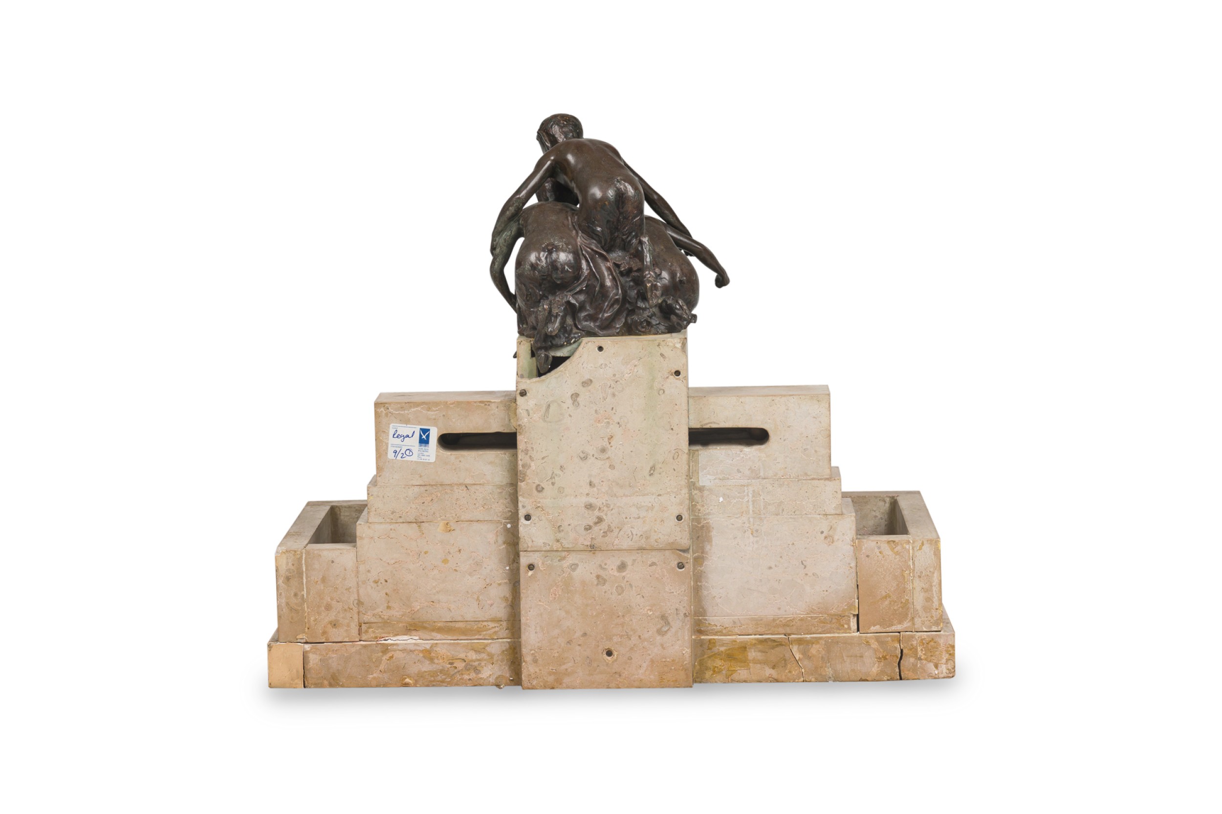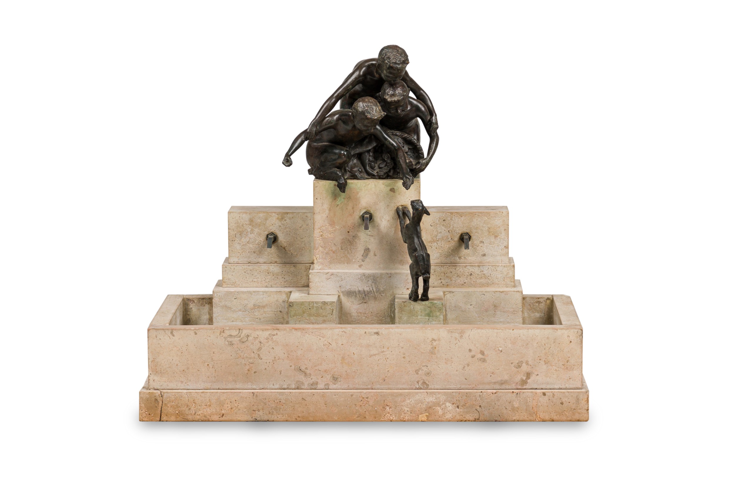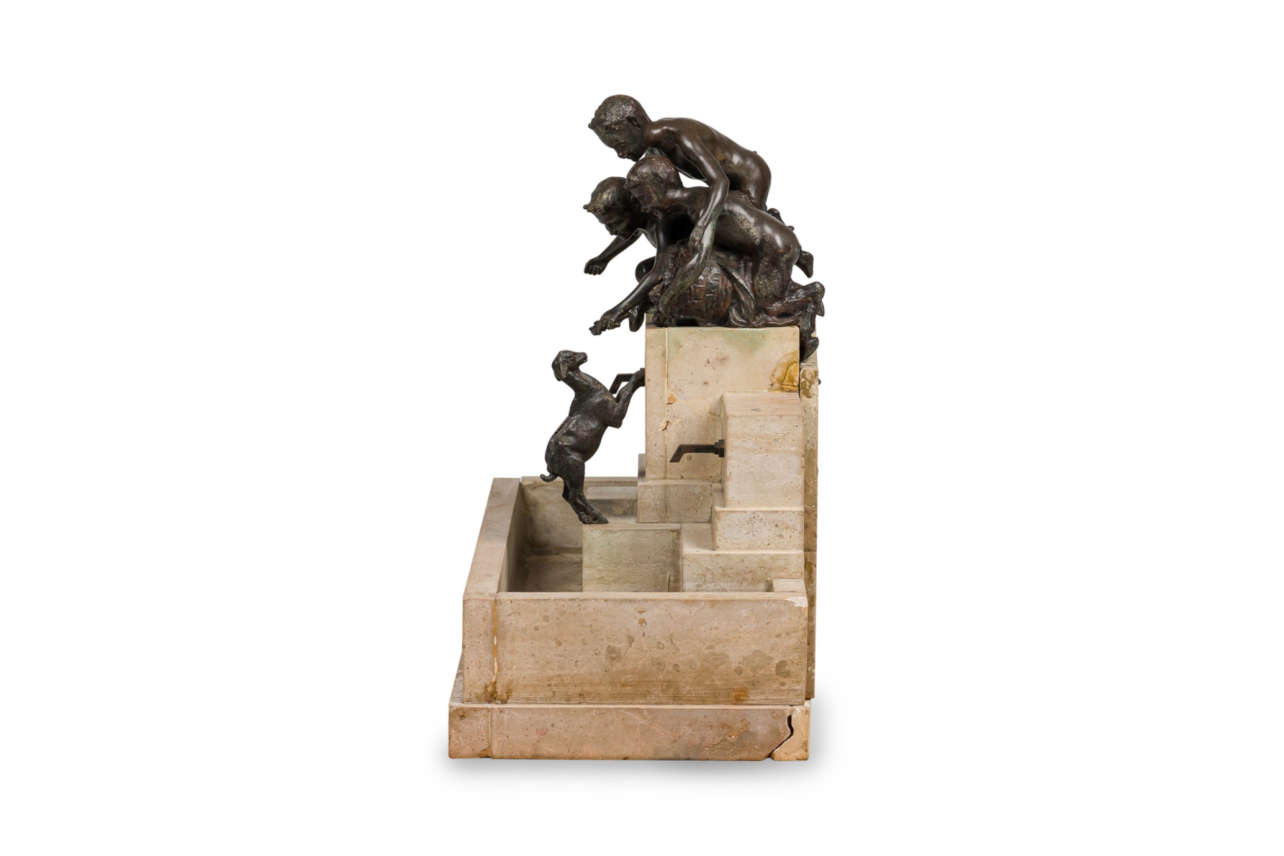 Hand carved and constructed 19th century Italian reciprocating water fountain scaled in marble and featuring bronze figures of 3 impish children luring a goat