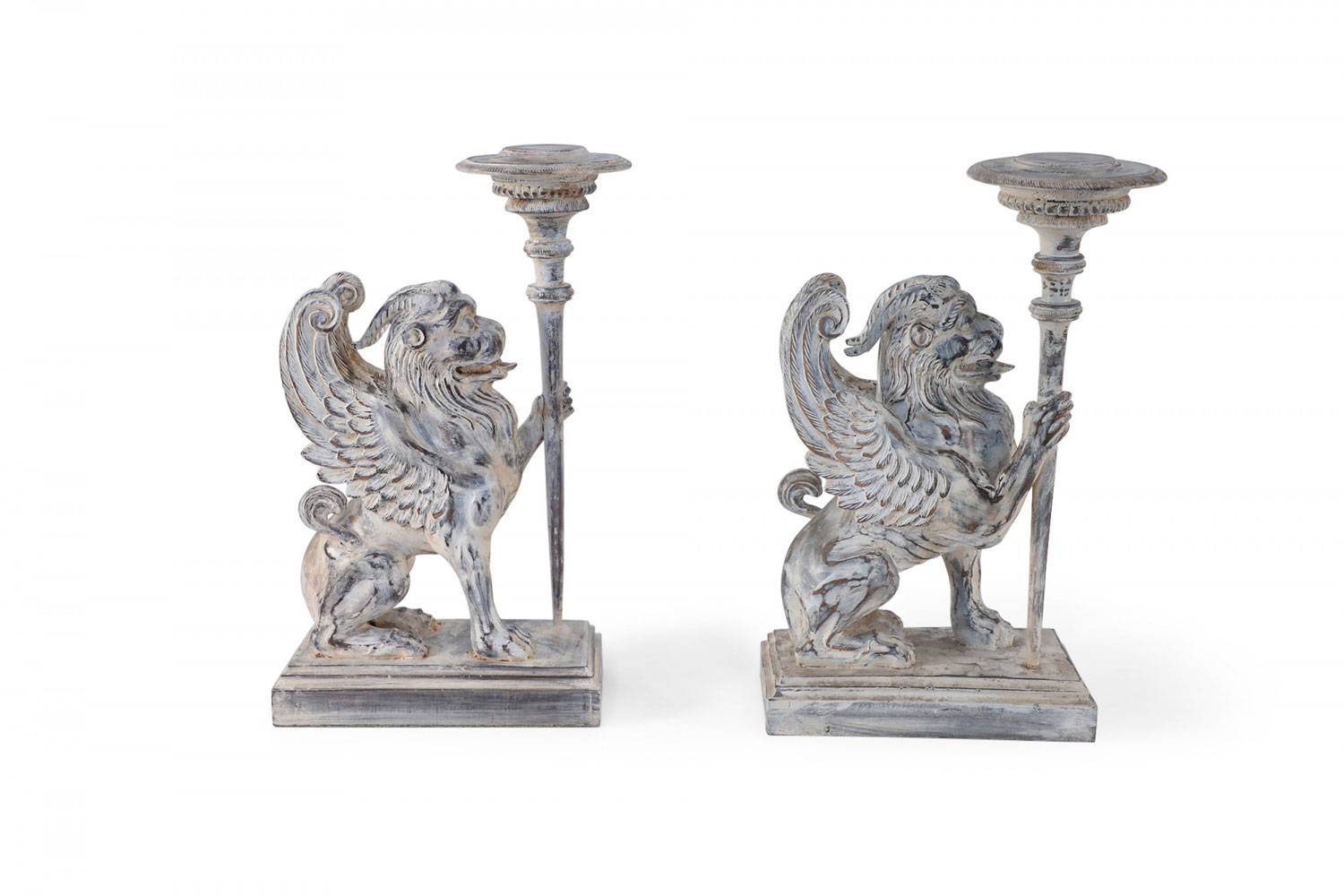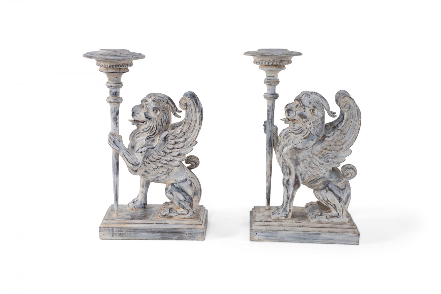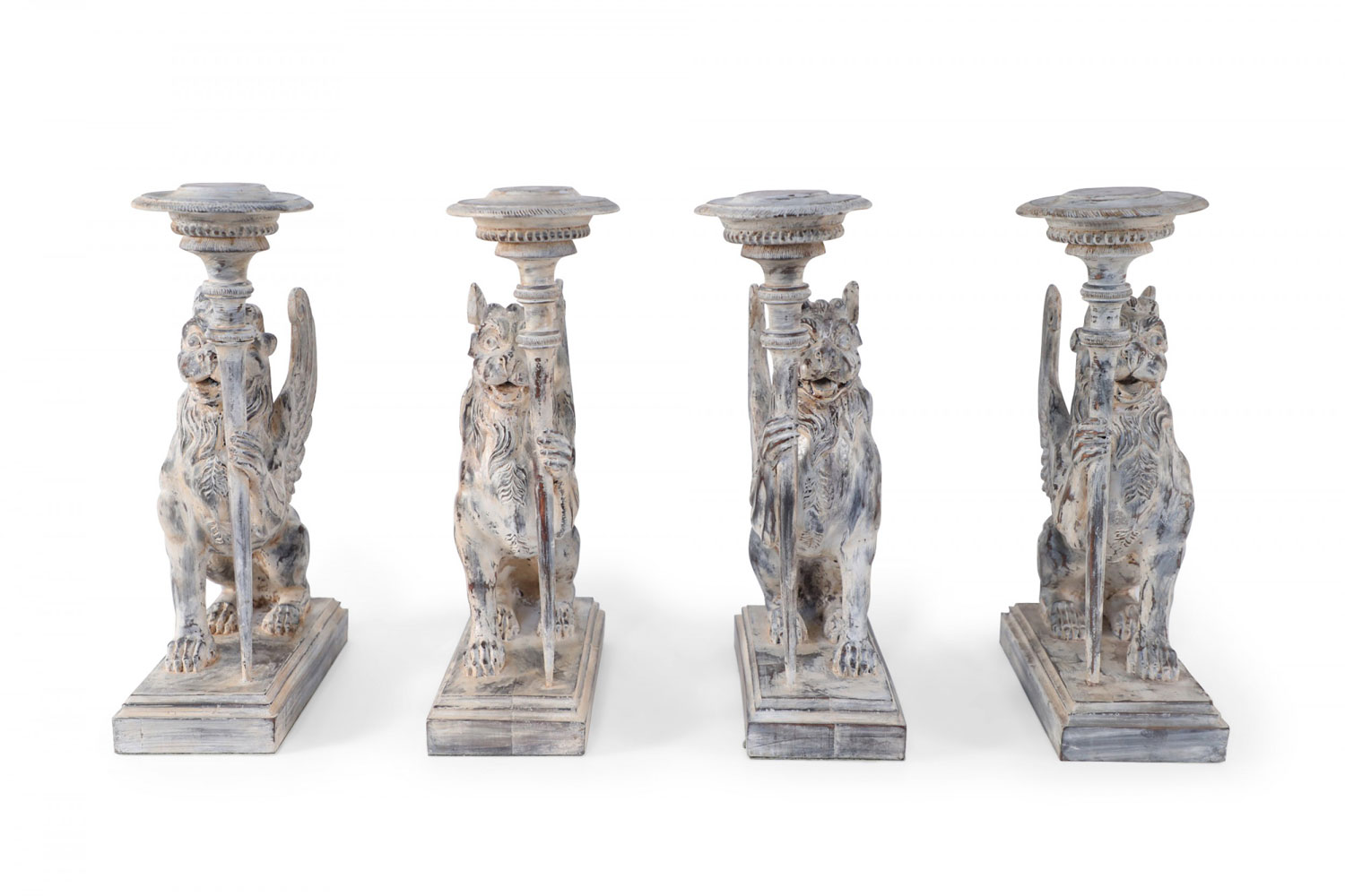 2 PAIRS of Neo-Classical style mythological carved wooden candle holders / bookends in the shape of chimeras holding a candle stick in one hand on stepped rectangular wooden bases with a white washed finish. (PRICED PER PAIR)