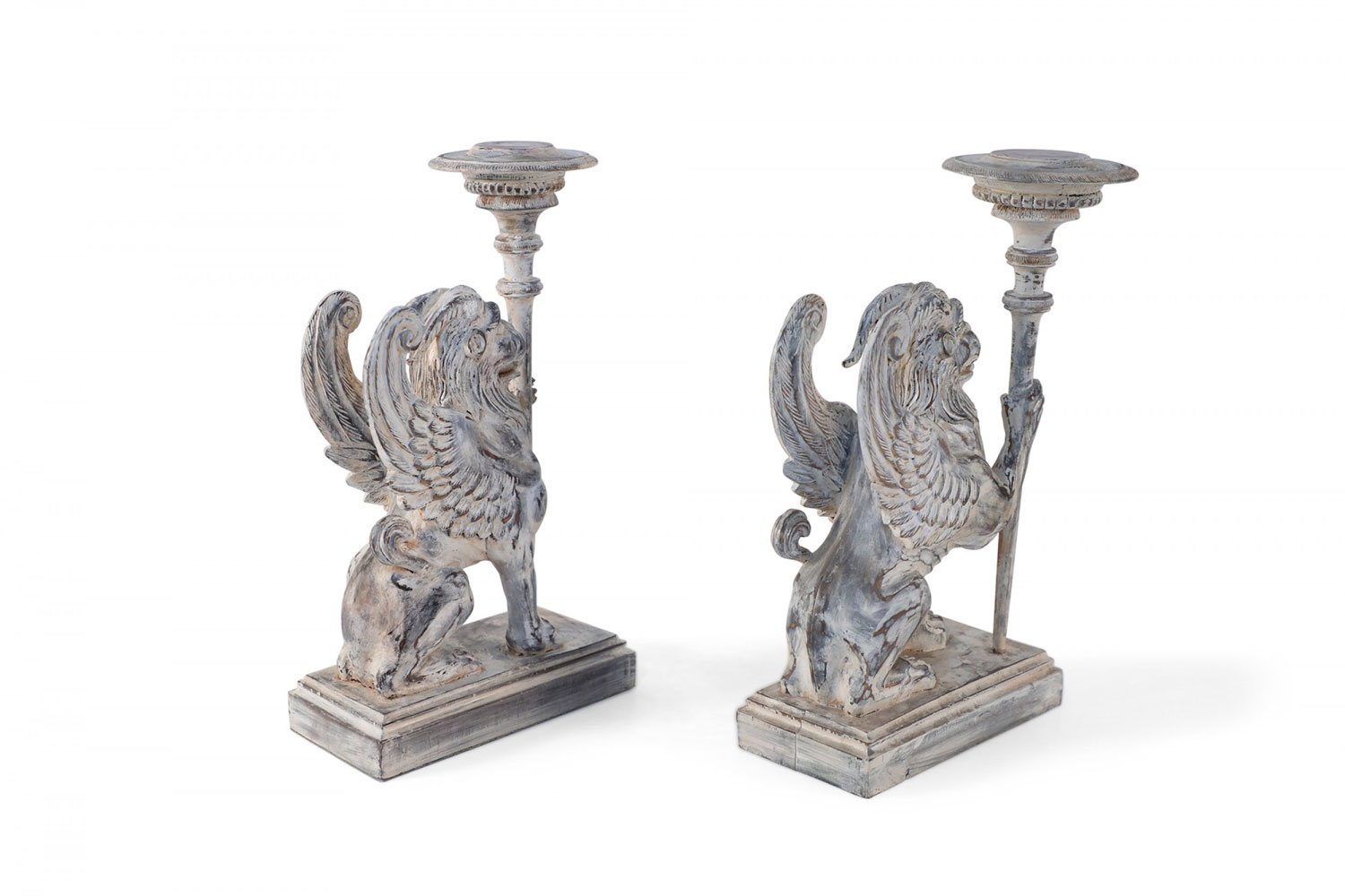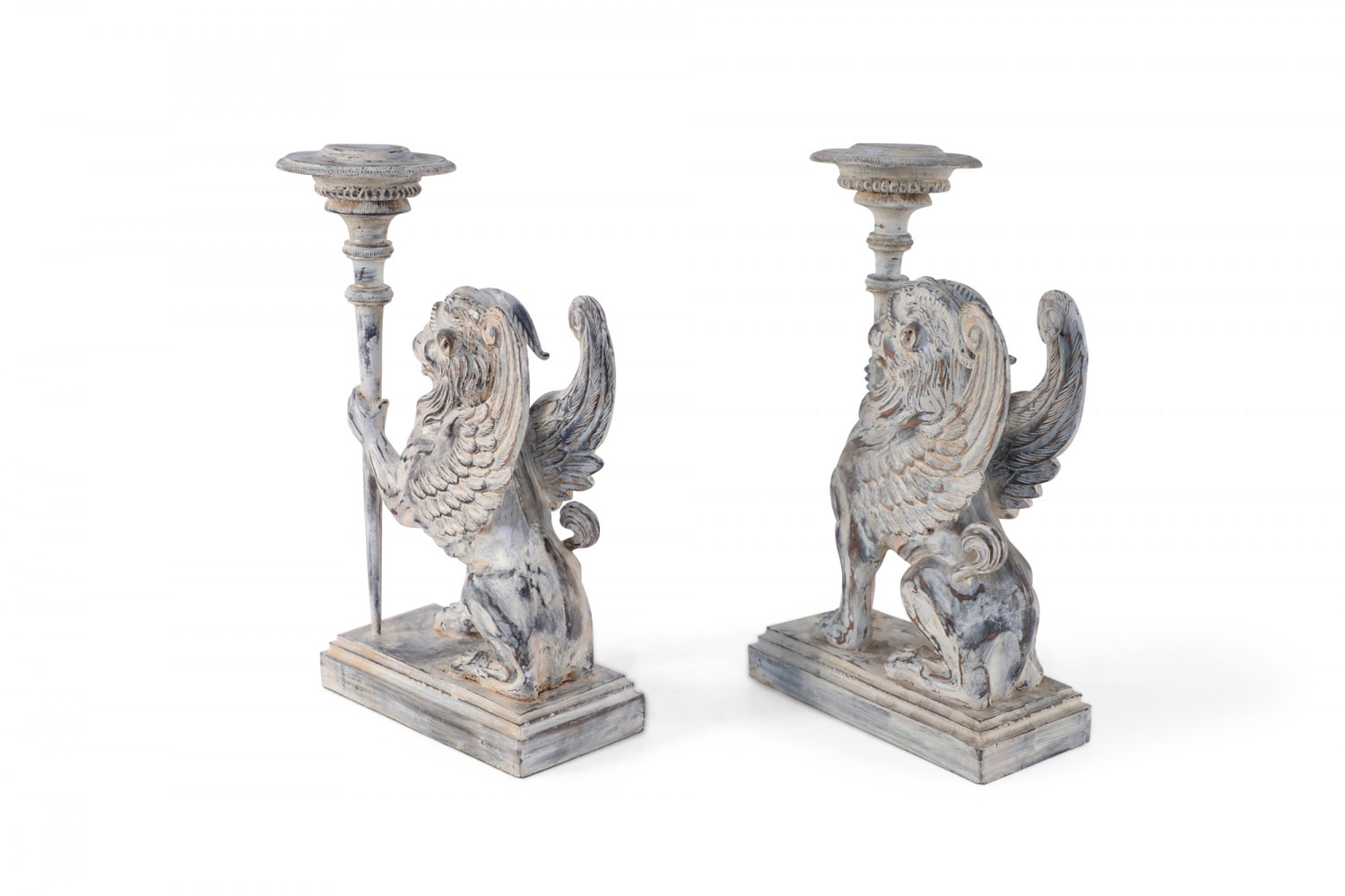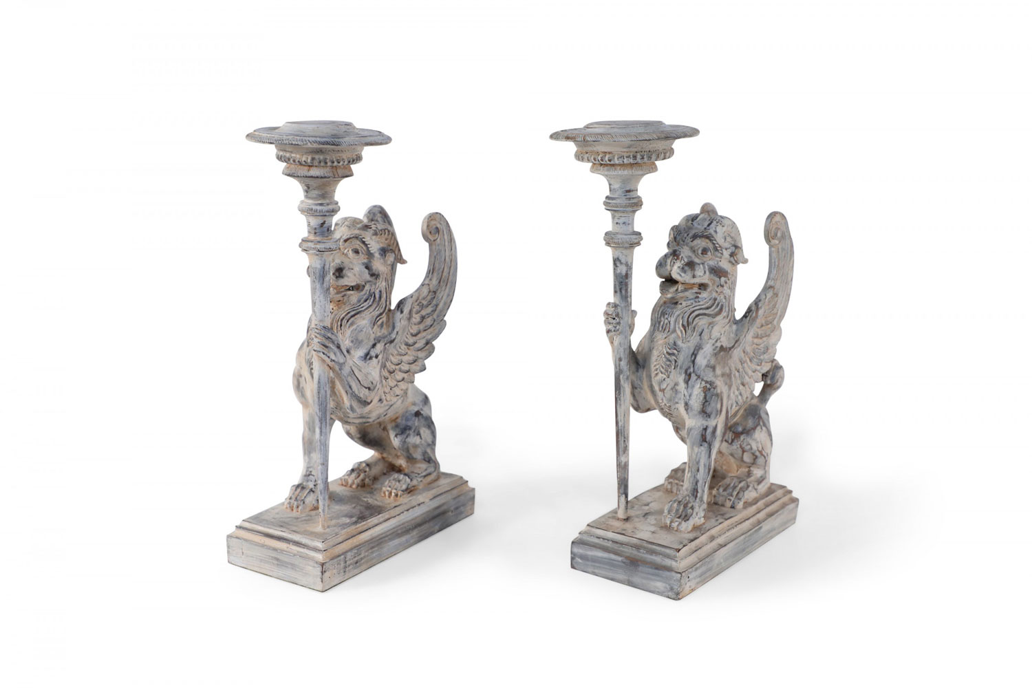 2 PAIRS of Neo-Classical style mythological carved wooden candle holders / bookends in the shape of chimeras holding a candle stick in one hand on stepped rectangular wooden bases with a white washed finish. (PRICED PER PAIR)