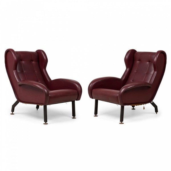 Style: Mid-Century Materials & Techniques: Leather, upholstered, wood Category: Seating Condition: Some wear to finish on frames. Good; Minor losses
