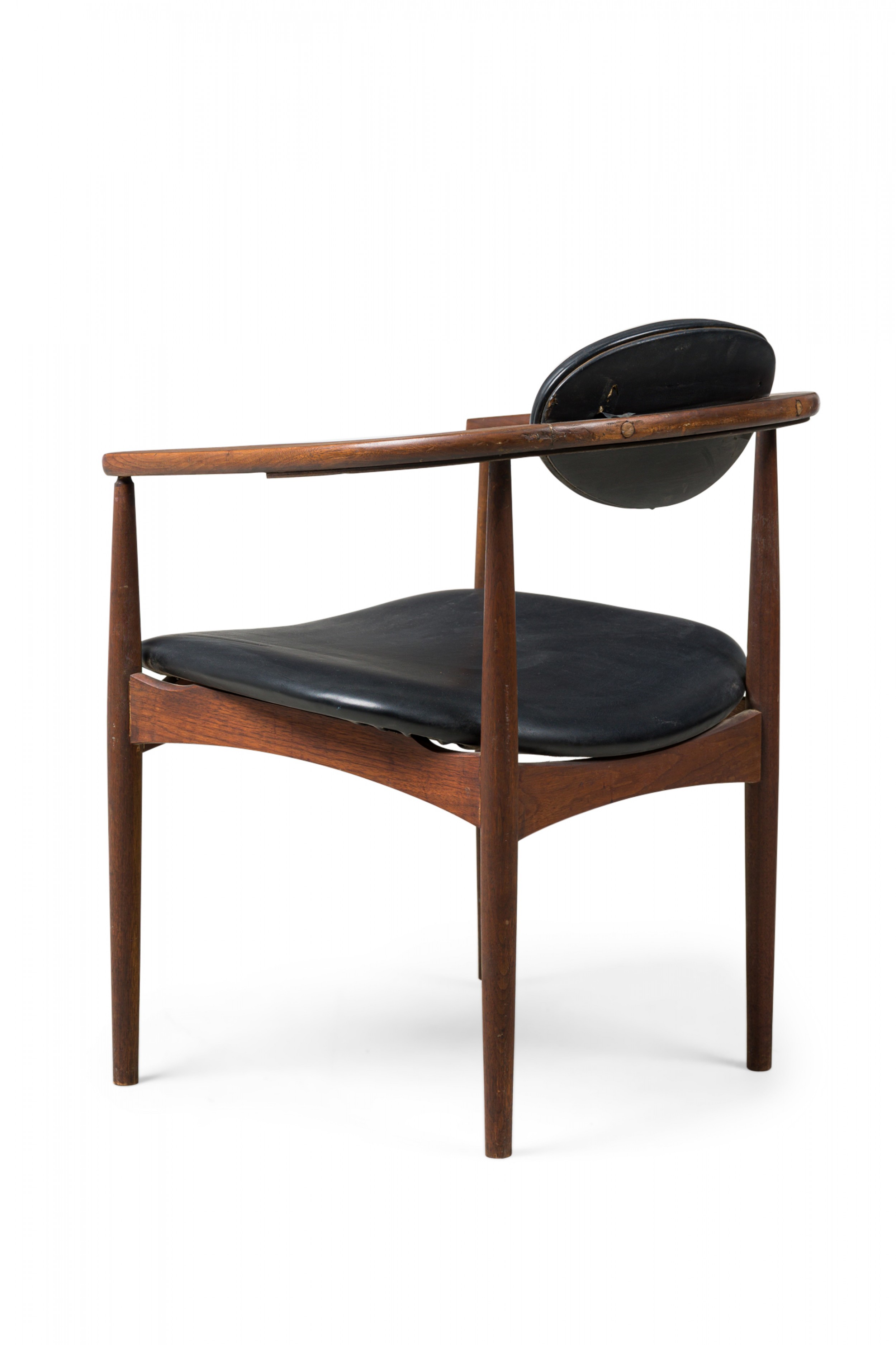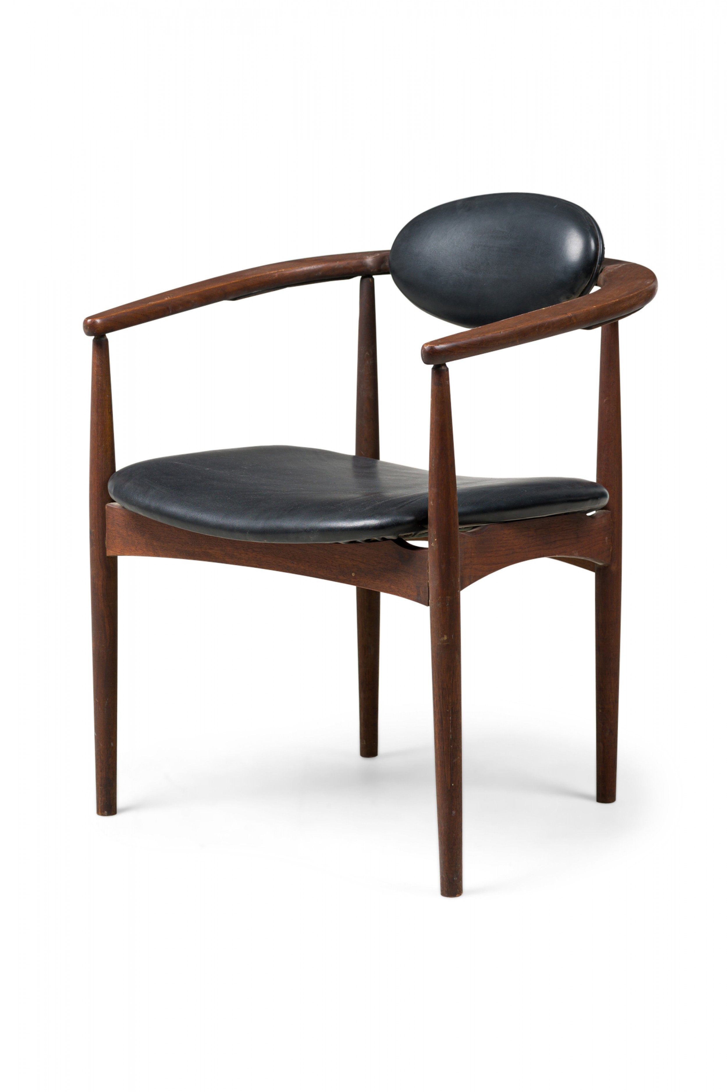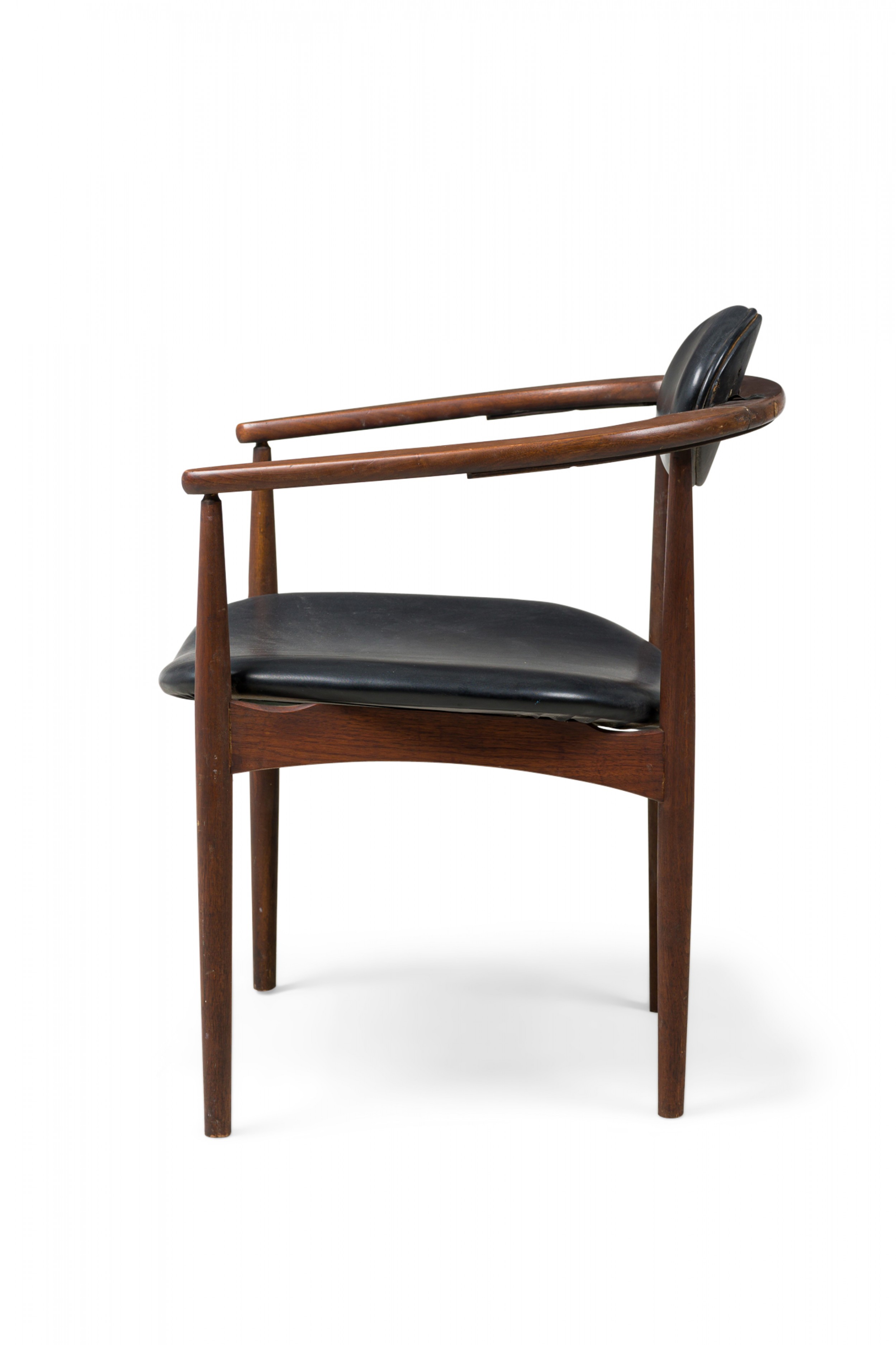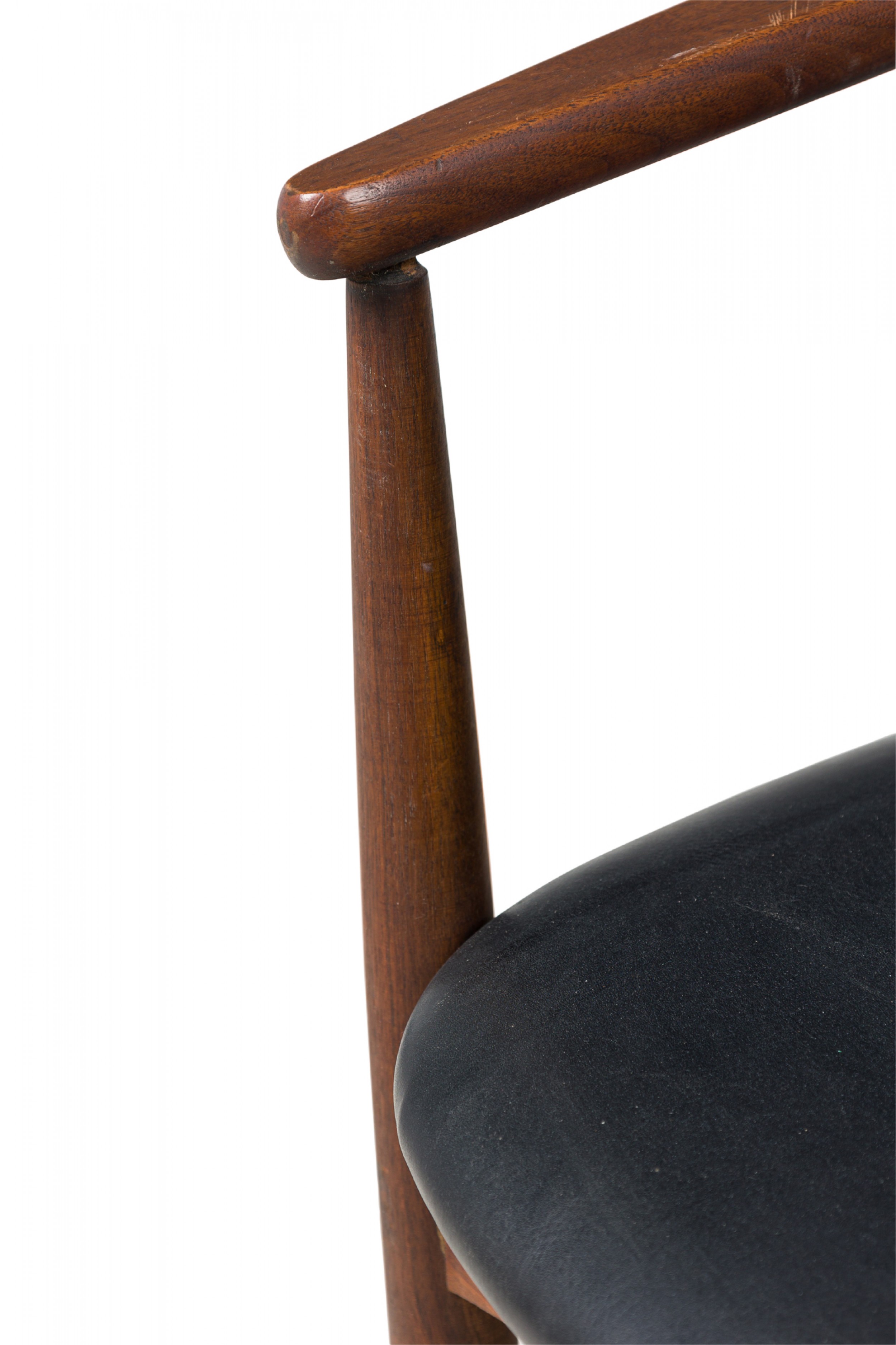 3 Mid-Century Danish Modern armchairs featuring horseshoe arms unified with the backrest as one piece, oval backrest and shaped seat upholstered in black leather, standing on 4 tapered cylindrical legs extending to the arms. (att: HANS WEGNER)(PRICED EACH).
